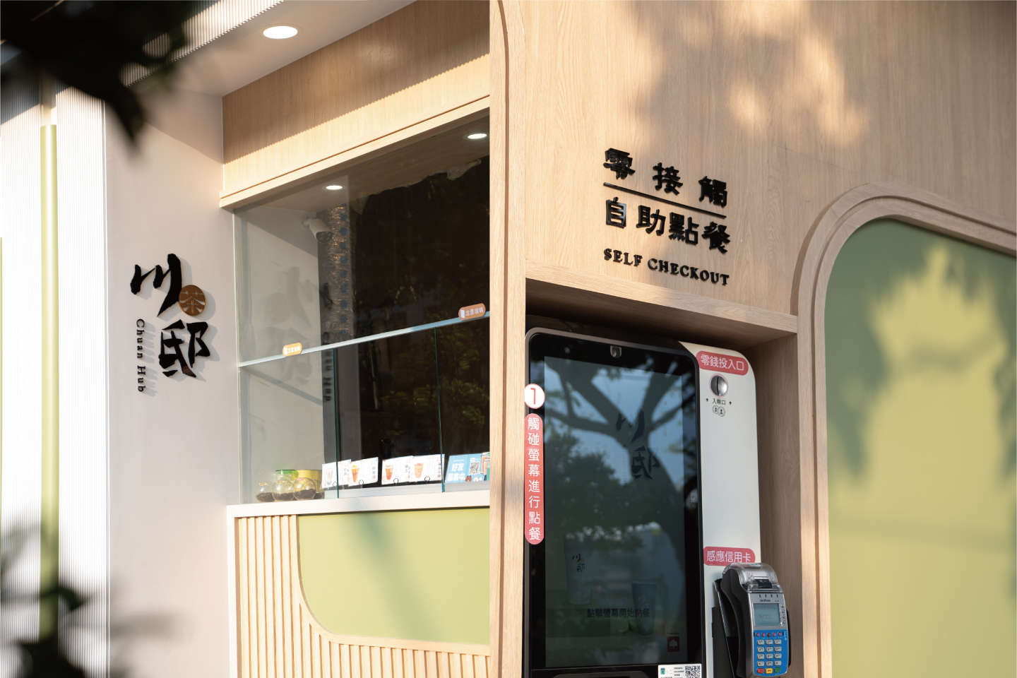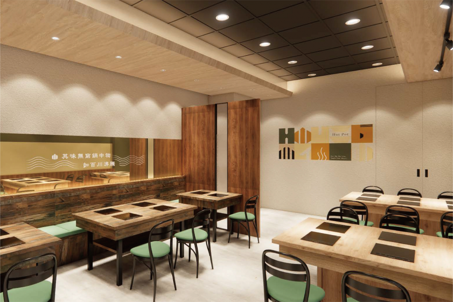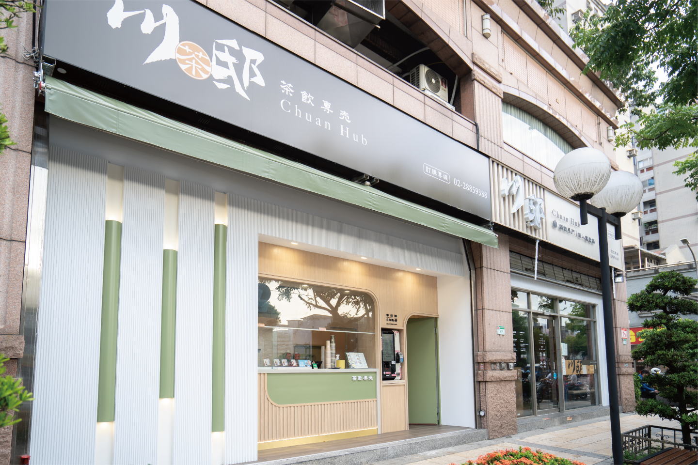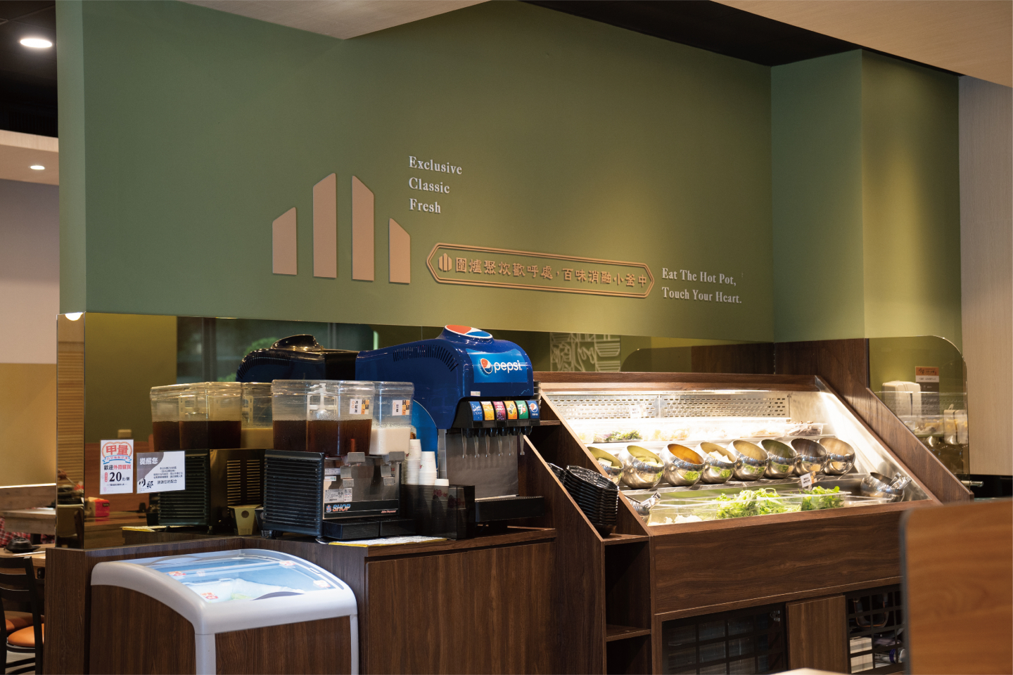 門面以大量木作,做為整個視覺,搭配品牌色墨綠色畫龍點睛, 火鍋店,店內牆面以綠色帶出品牌訴求的有機蔬菜自助吧! 牆面運用了輔助圖型挖空設計,增添整體的立體感, 桌椅特地選用深色系木頭,以此呈現沉穩感,靠牆座位區,牆面以玻璃做出空間的延伸, 與火鍋店緊鄰的飲料店面,以淺色系木紋打造,來與火鍋店做出區隔,多了些許清爽感, 櫃台的木隔柵設計,讓整體更加生動,牆面上以長短不一的圓管搭配燈光打造, 遠看形成一個"川"字,品牌精神悄悄融入其中!