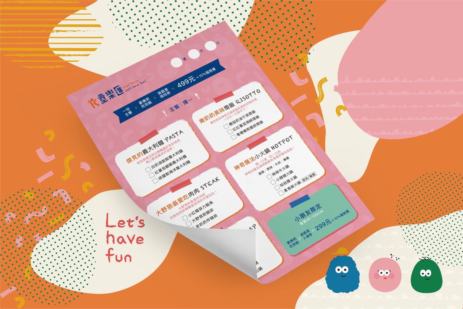 「橘色,是溫暖、幸福的顏色,也是充滿朝氣、最適合小朋友的顏色! 與真誠細膩的藍色配上,營造出活潑溫馨的氛圍; 並以象徵孩童的『K』作為Icon,打造出孩童嬉戲遊玩的意境, 可愛逗趣的輔助圖形、軟Q的形象彷彿小精靈般, 散落在各式文宣與餐廳現場, 探頭探腦的模樣,創造繽紛熱鬧的童趣畫面, 更完美展現出小朋友們開心的笑顏!