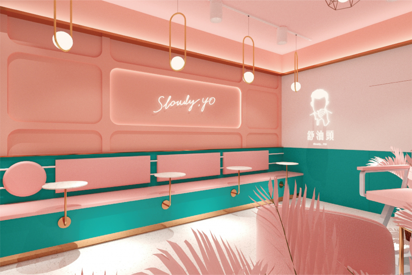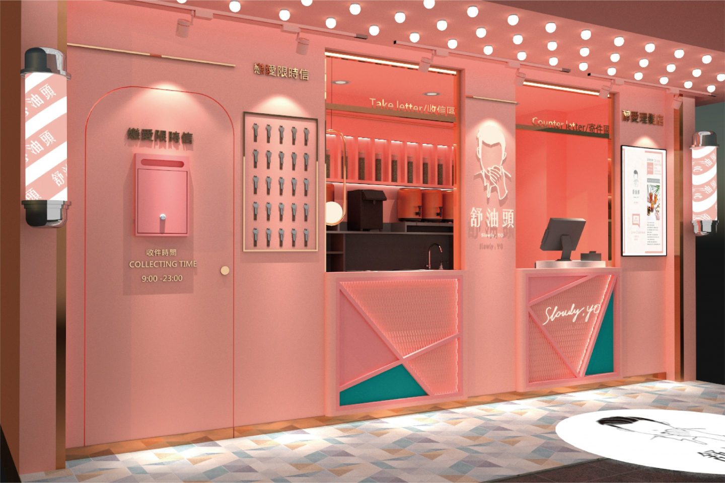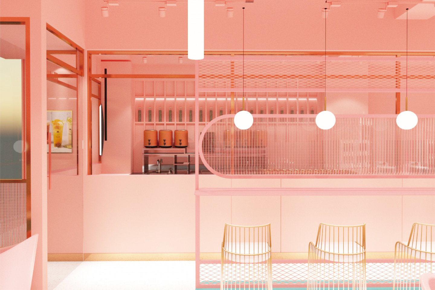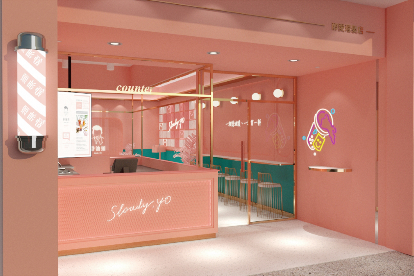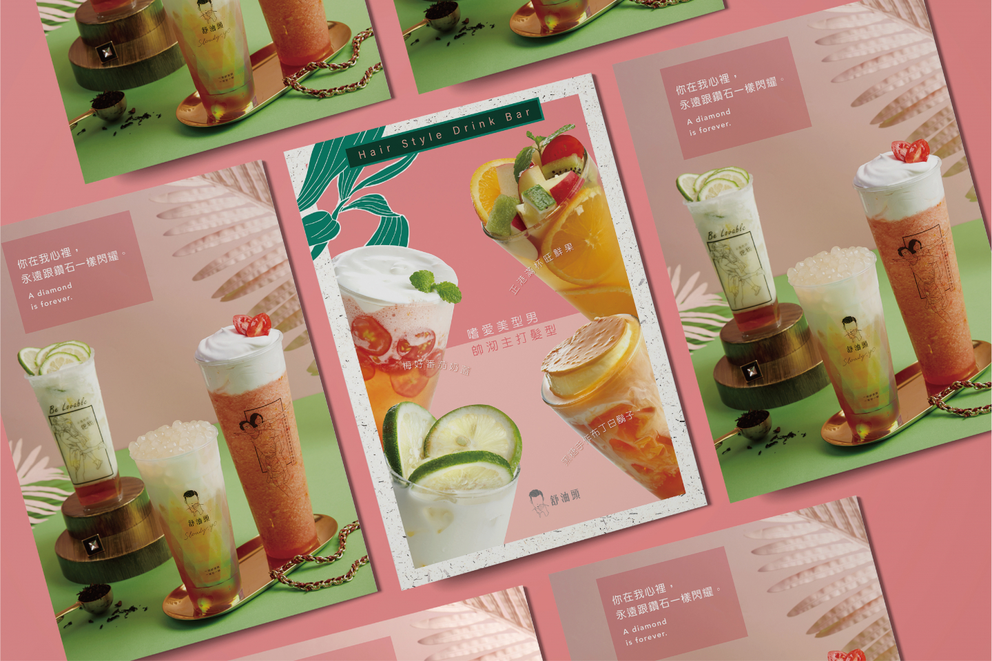 LOGO以線條勾勒出人物輪廓 並在髮型融入油頭的漸層巧思 以充滿少女情懷的粉紅調為底色 讓妳喝茶也能 喝 到 戀 愛!輔助圖形則是由不同個性的男孩 代表飲品的各個系列及其特色 大膽吸睛甜蜜粉色系空間 結合Barber shop元素 構成醇愛理髮廳概念 並在牆面鑲嵌霓虹圖型、文字 讓整體多加幾分輕奢感。