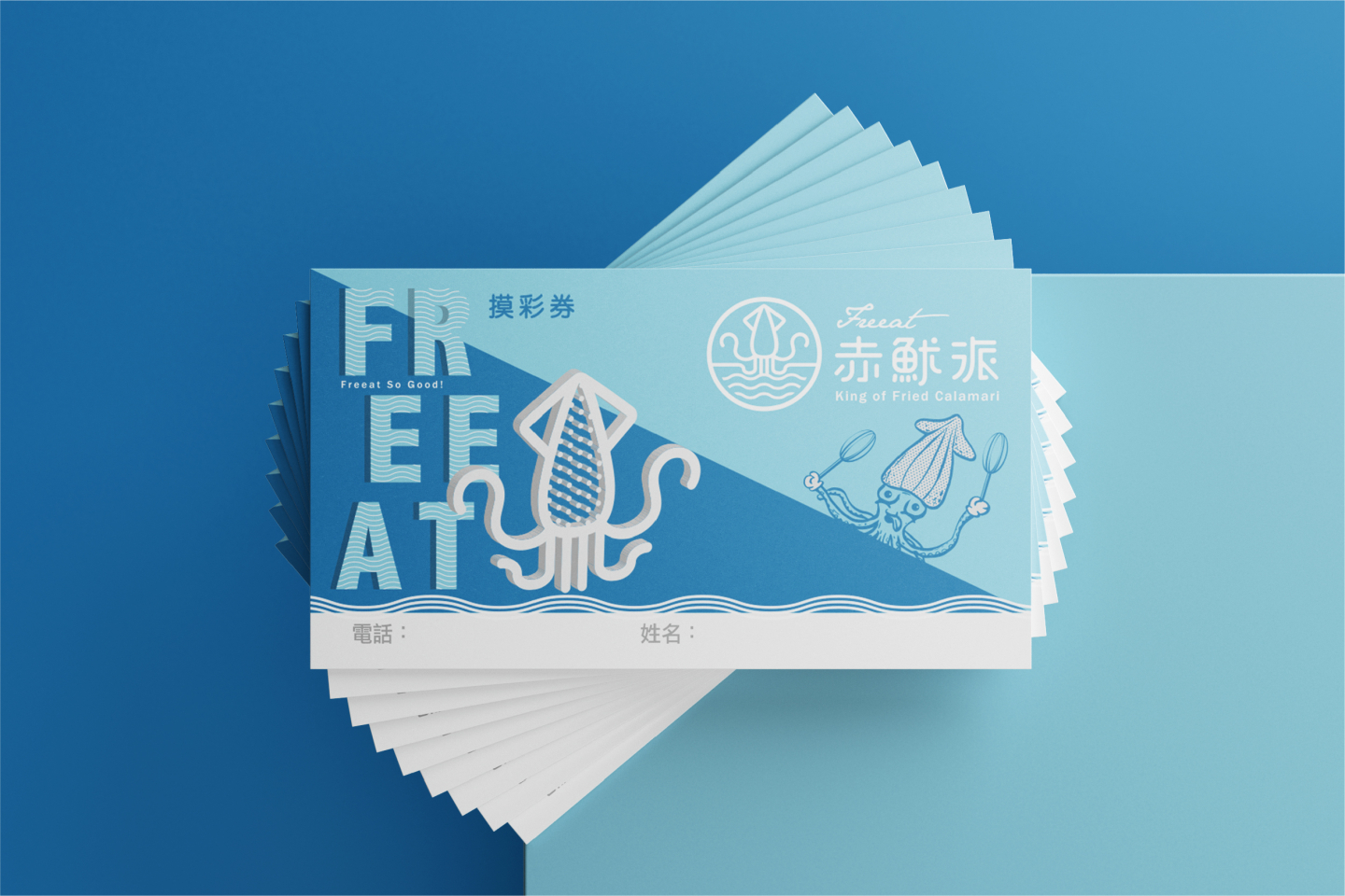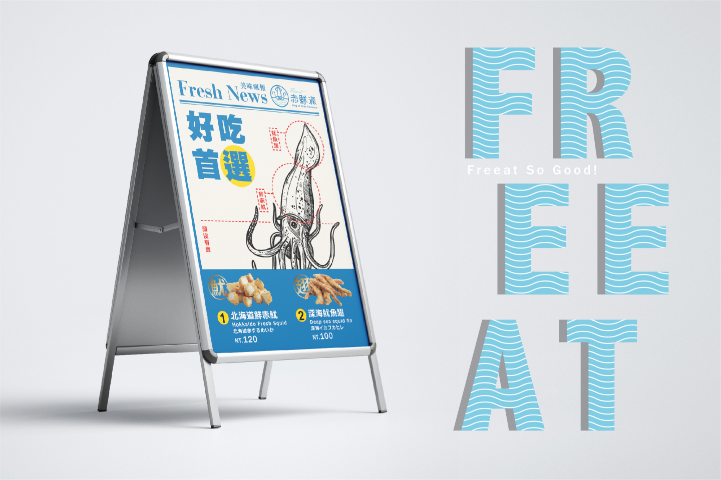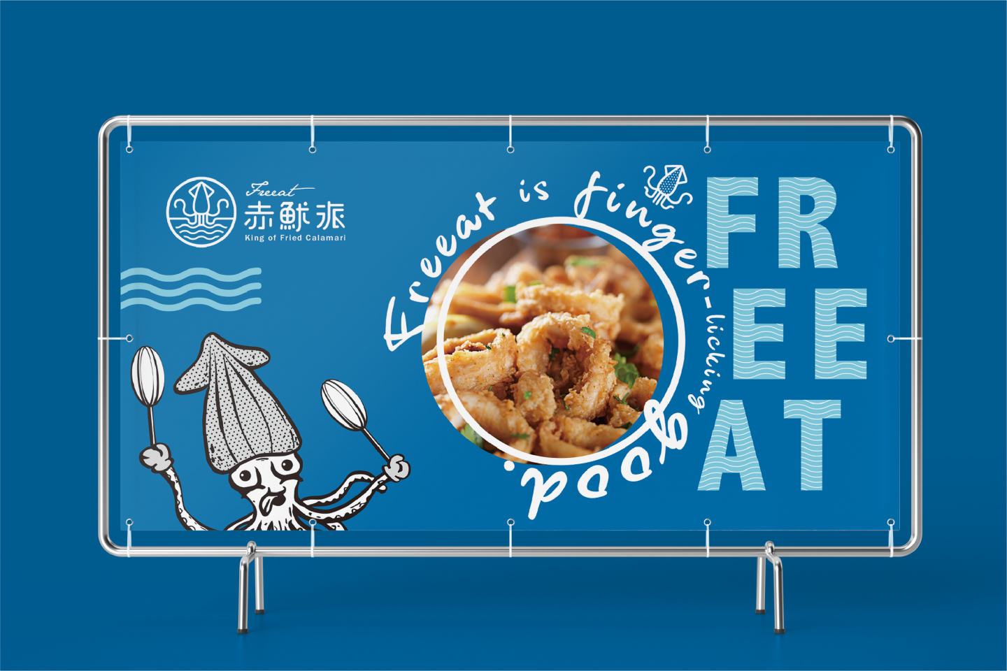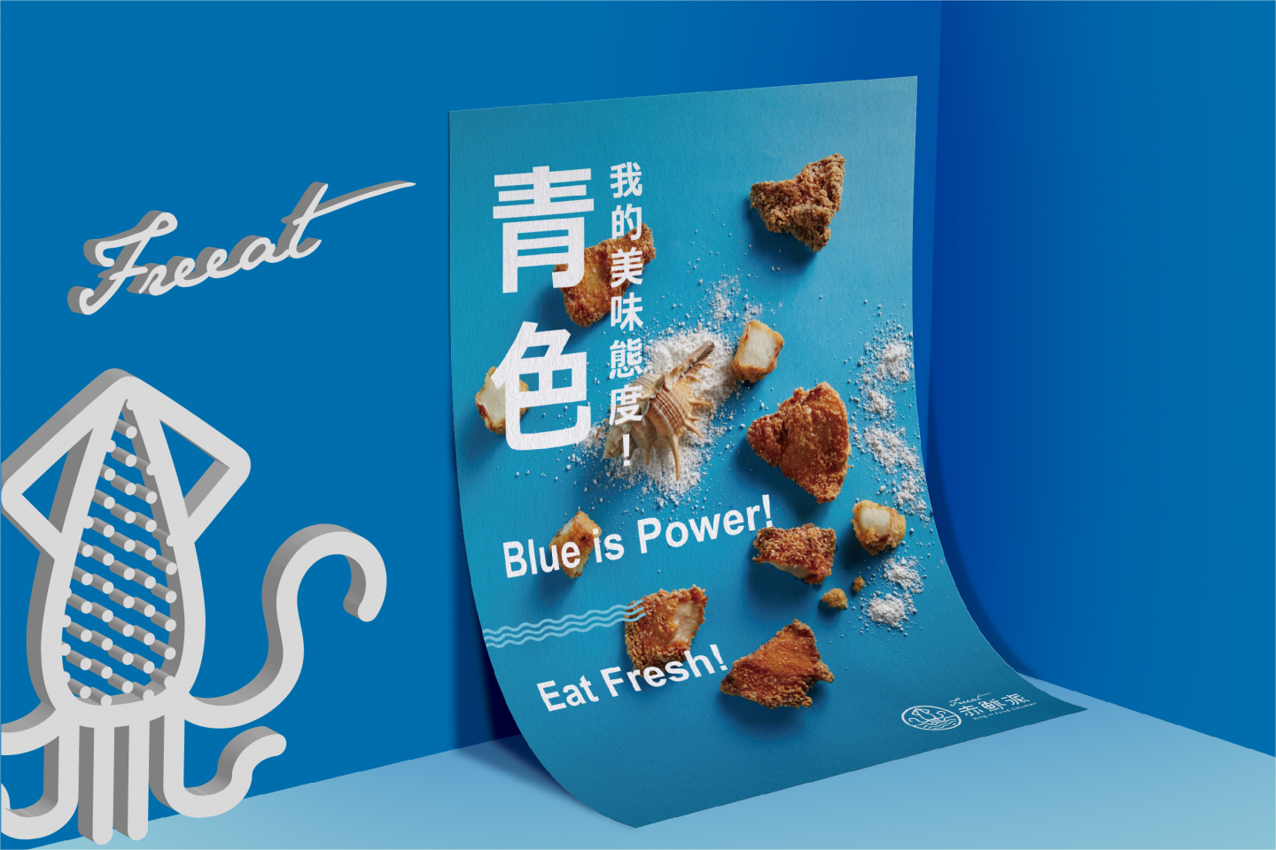 Logo設計以簡約線條的魷魚造型, 搭配代表海洋的藍色系曲線, 直覺式呈現出品牌新鮮的風味, 與隨性熱愛自由的核心理念, 傳遞每口新鮮,就是我們的自由派!