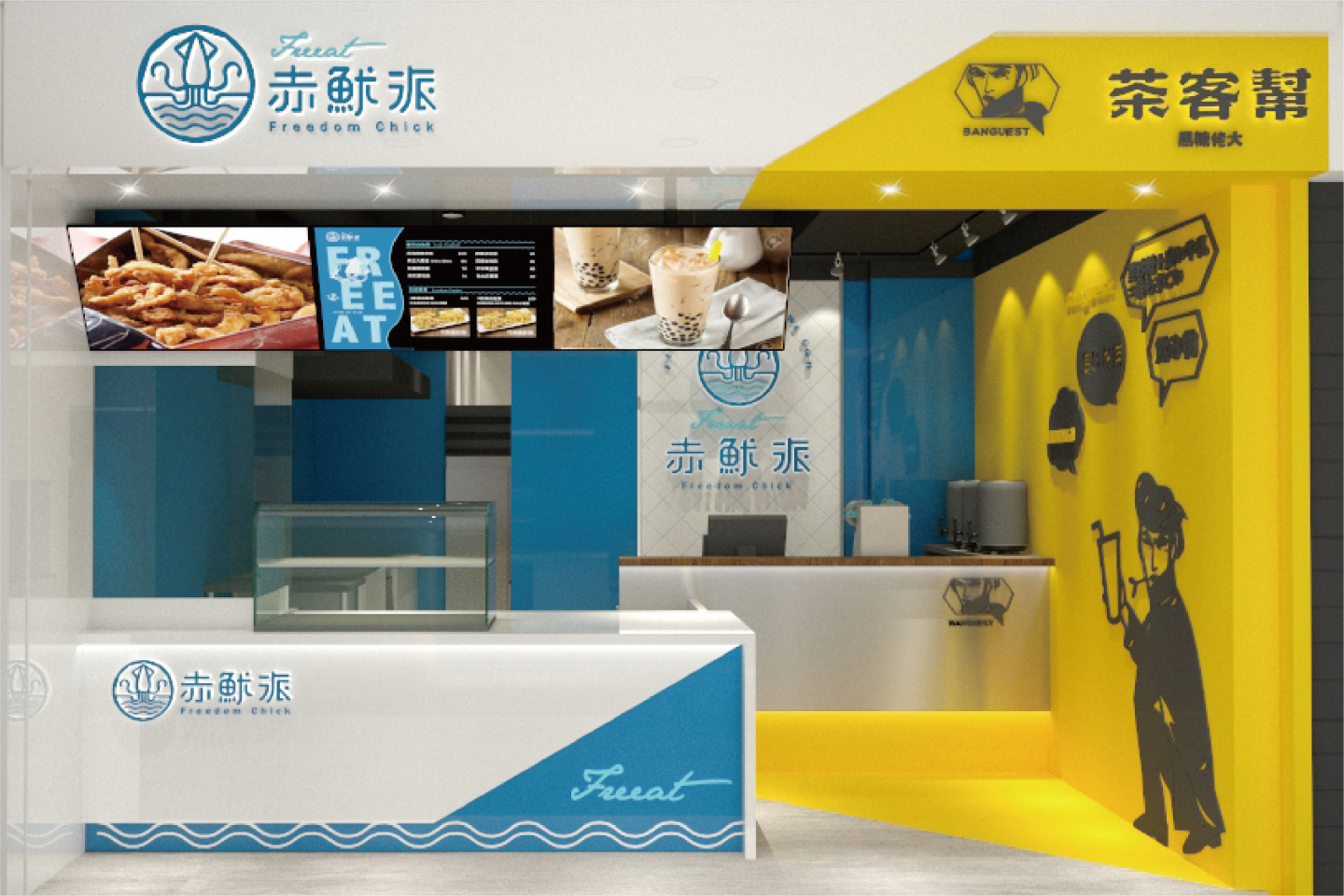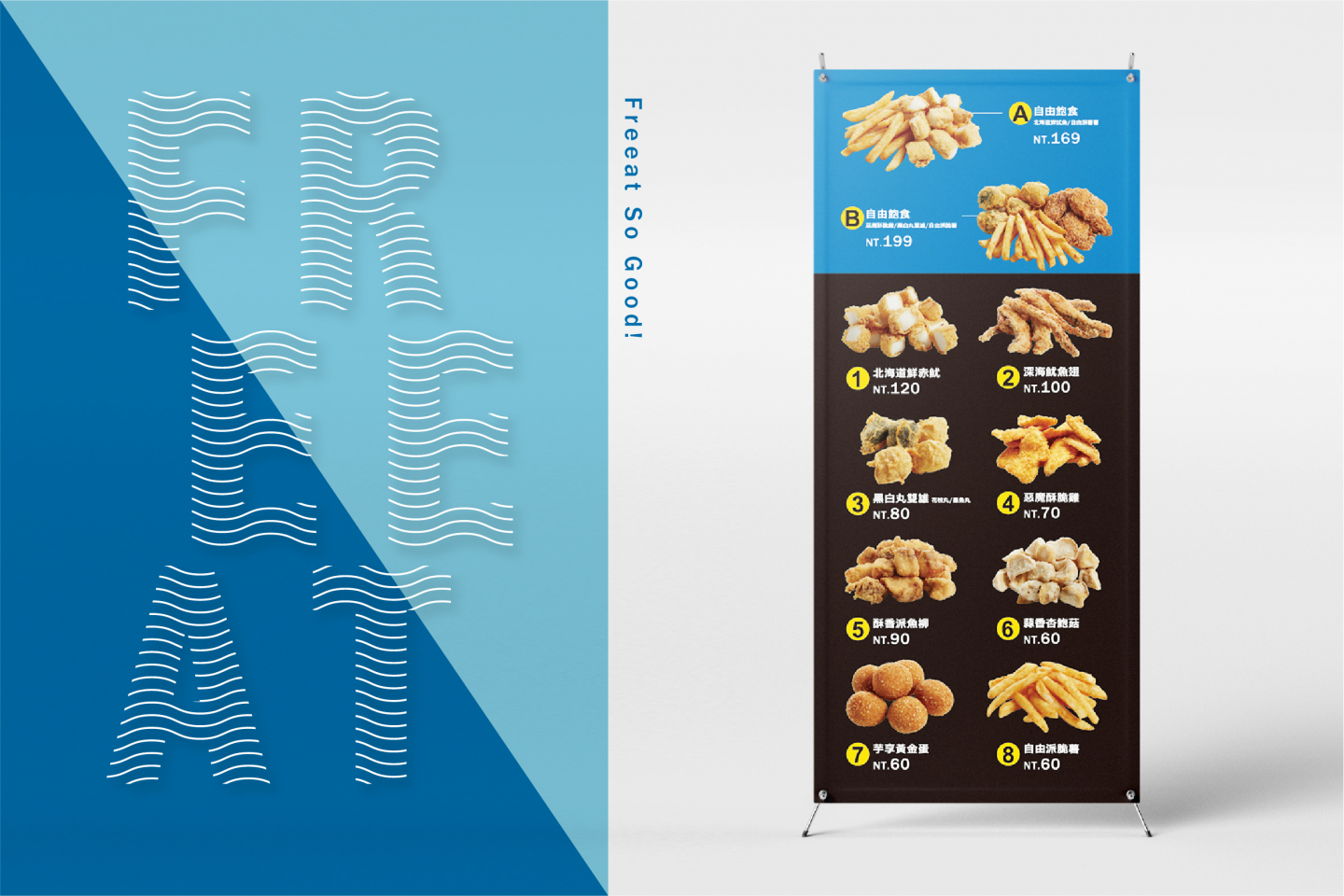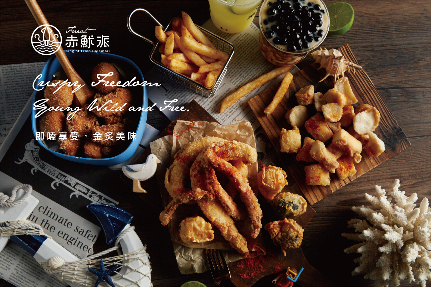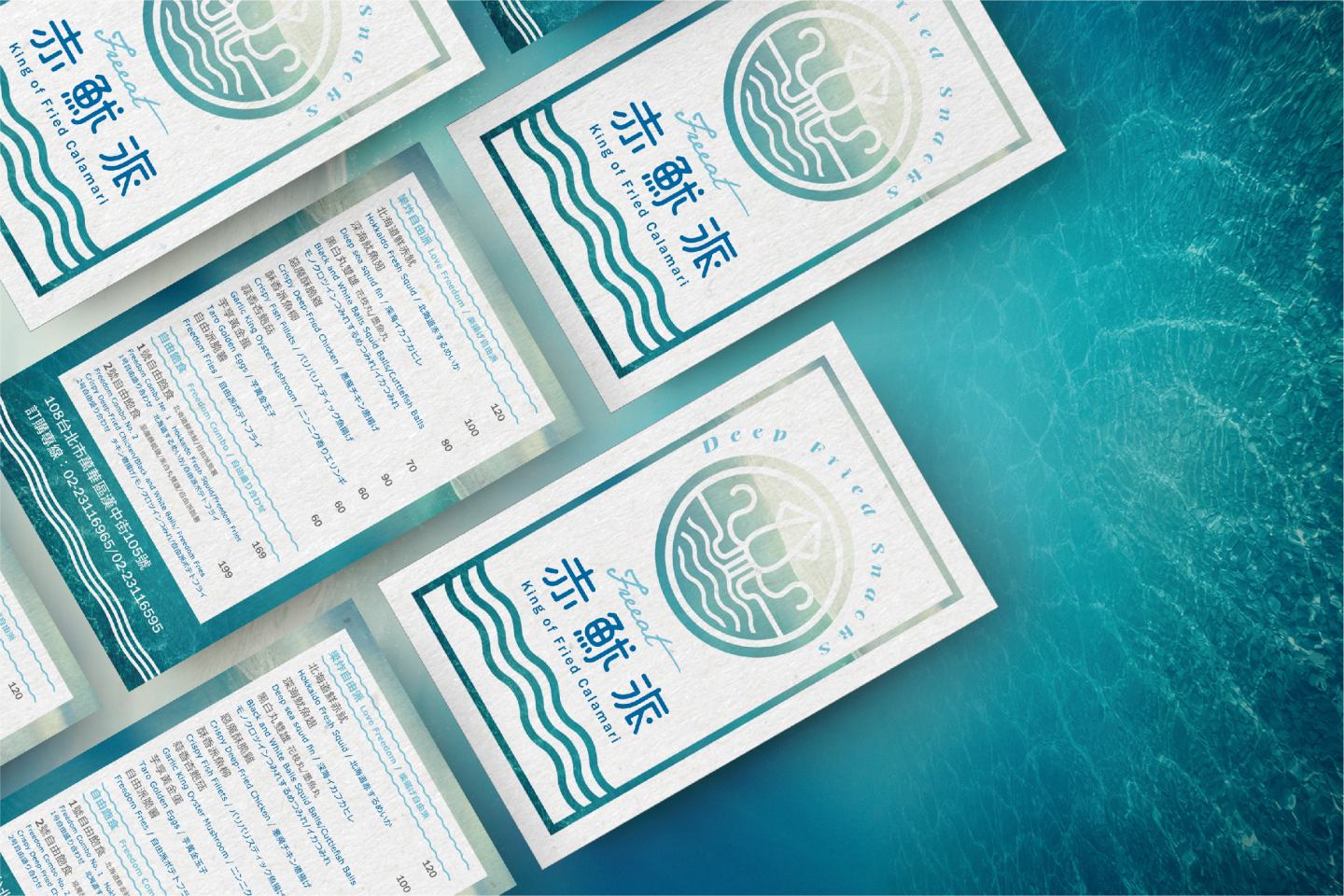 Logo設計以簡約線條的魷魚造型, 搭配代表海洋的藍色系曲線, 直覺式呈現出品牌新鮮的風味, 與隨性熱愛自由的核心理念, 傳遞每口新鮮,就是我們的自由派!