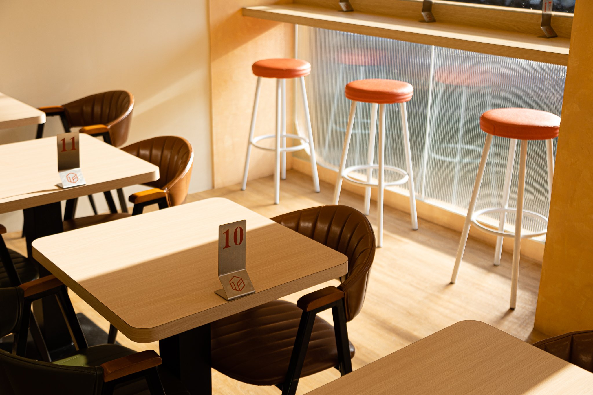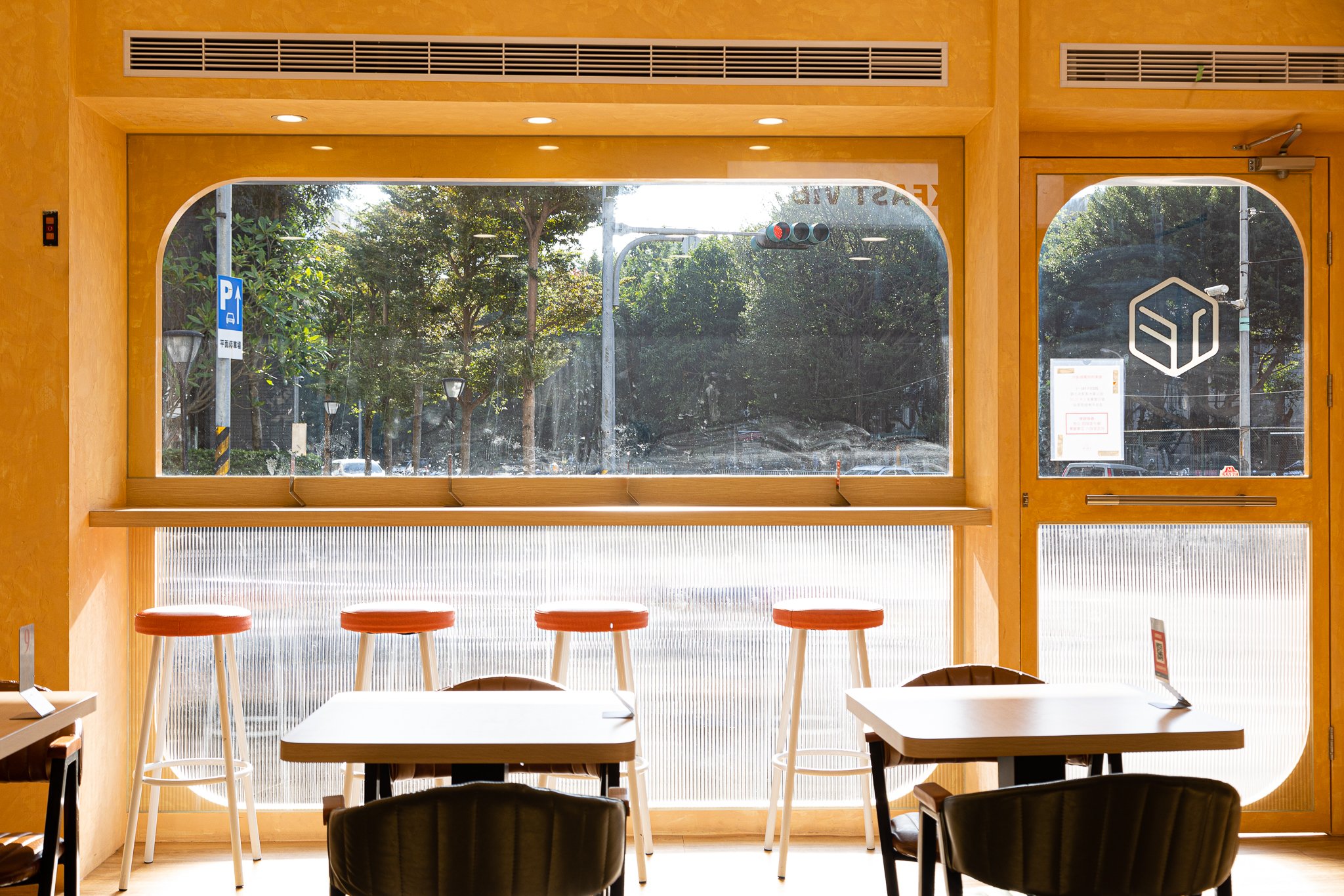整體空間主要以品牌主色調去延伸,櫃檯底部運用線板製造出視覺上的豐富度,牆面選用特殊塗料,透過抹痕堆疊的手法,呈現出璀璨耀眼的多層次之美,最後利用玻璃的通透性,溫煦陽光灑下,使內部空間更加溫暖明亮。
