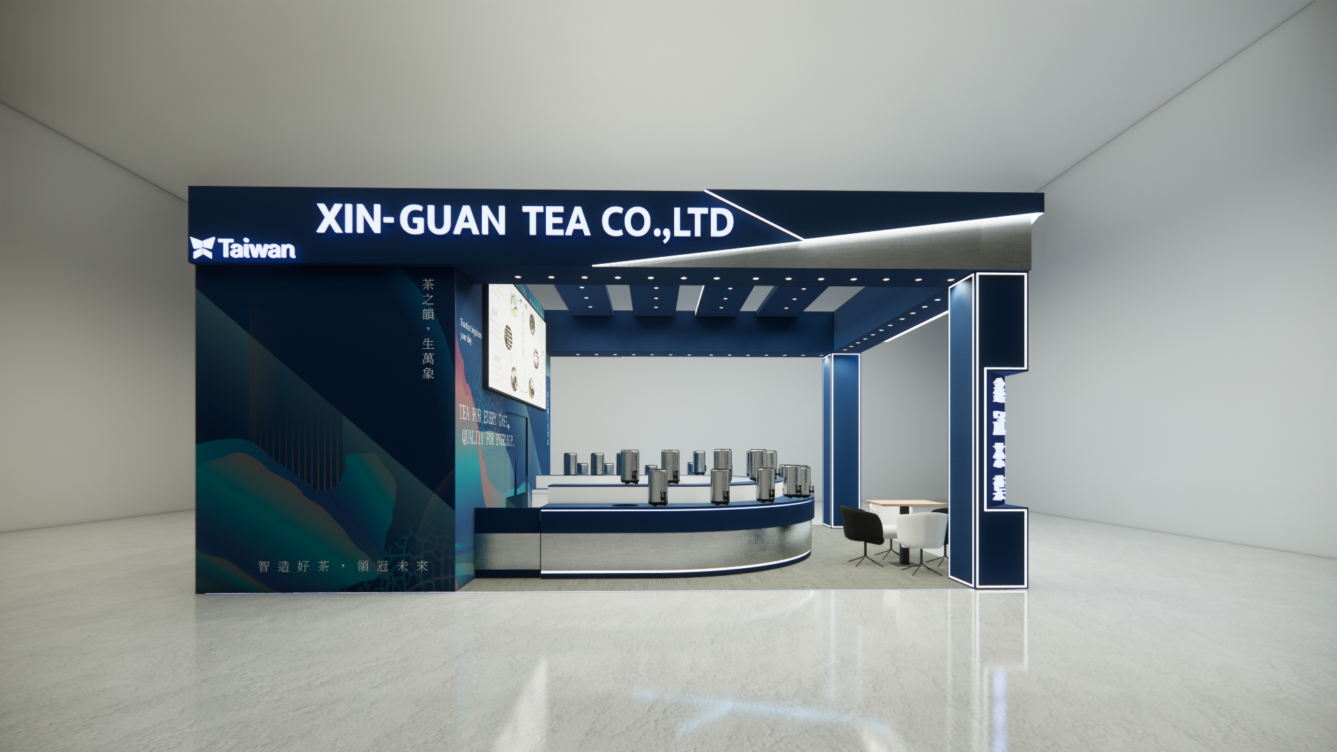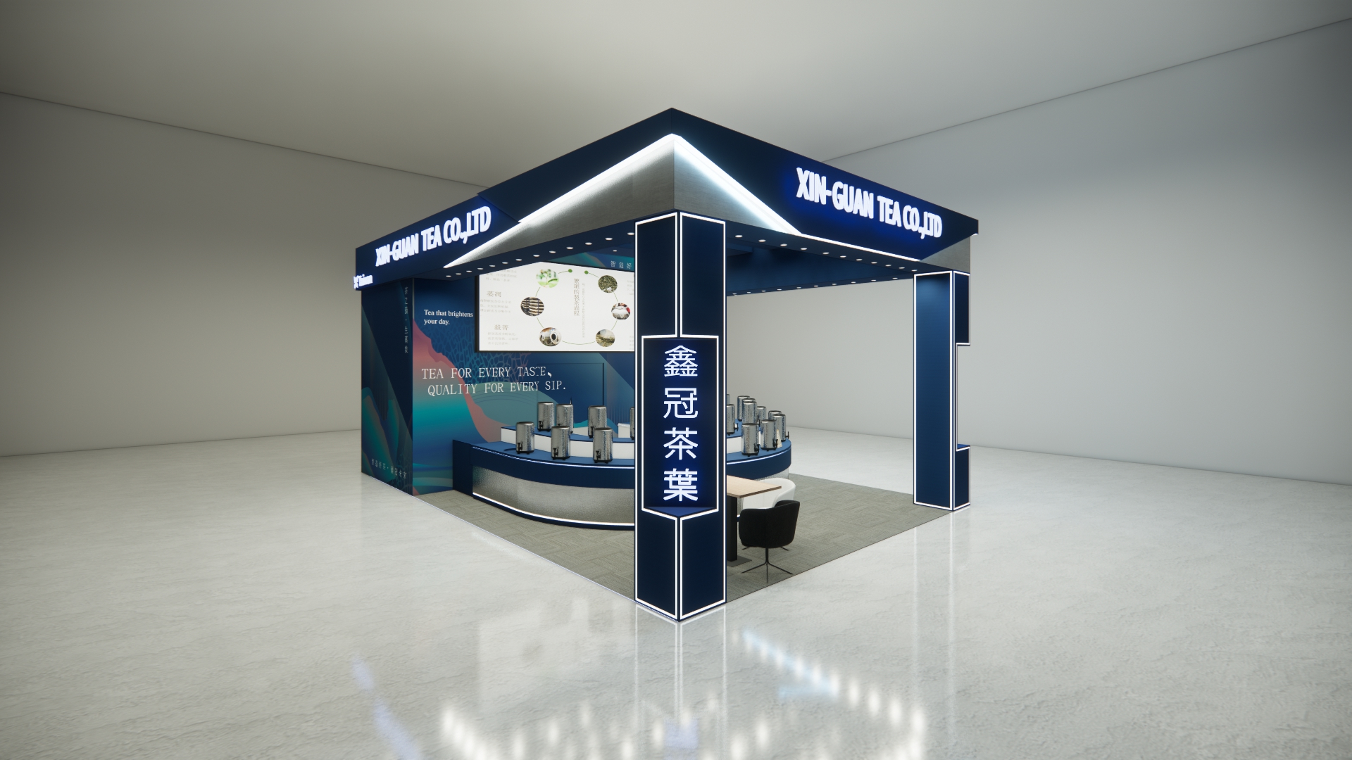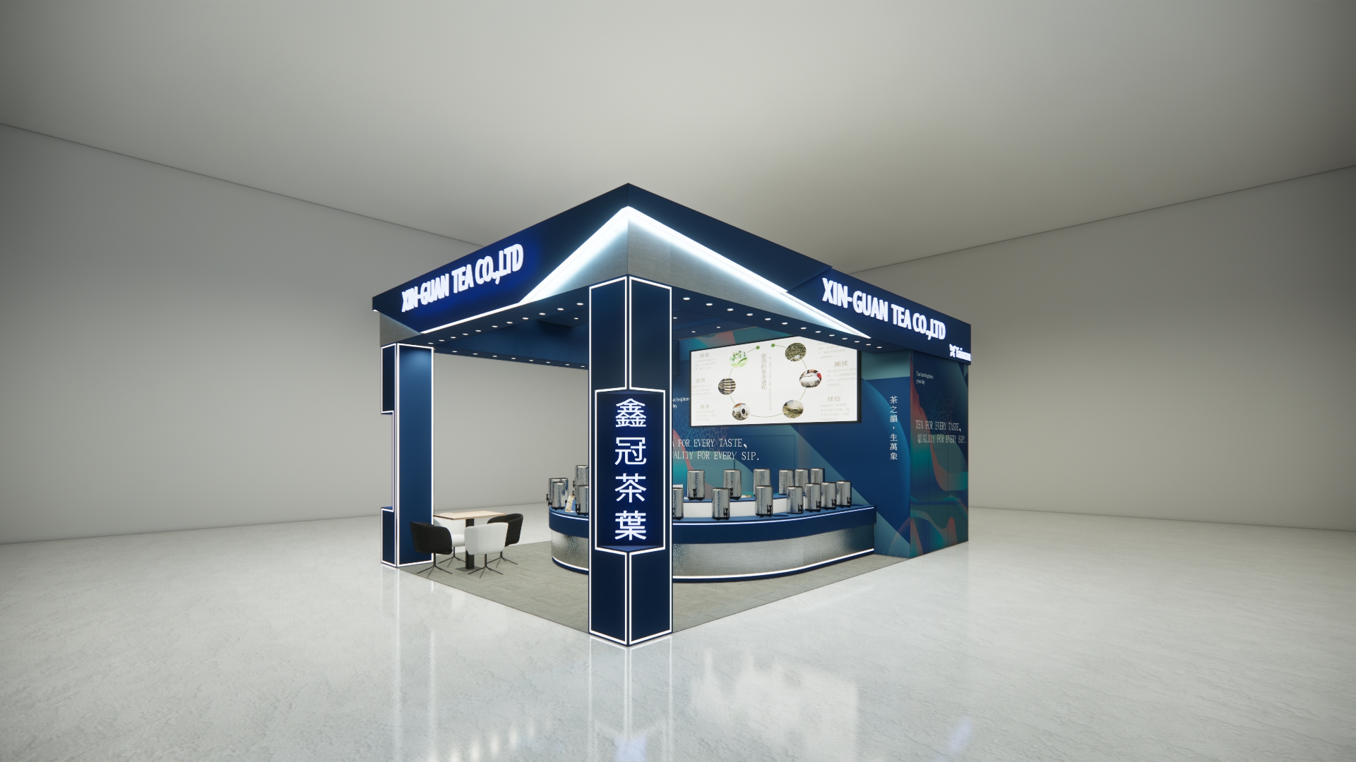 此次為「鑫冠茶葉」新加坡國際食品飲料展設計主視覺 以”智造好茶,領冠未來”為主題設計 深藍為主調,象徵穩重與專業 搭配不鏽鋼金屬質感與燈條點綴 營造出科技與傳統交融的品牌形象。 攤位線條俐落,開放式格局讓動線流暢,便於參觀與洽談
