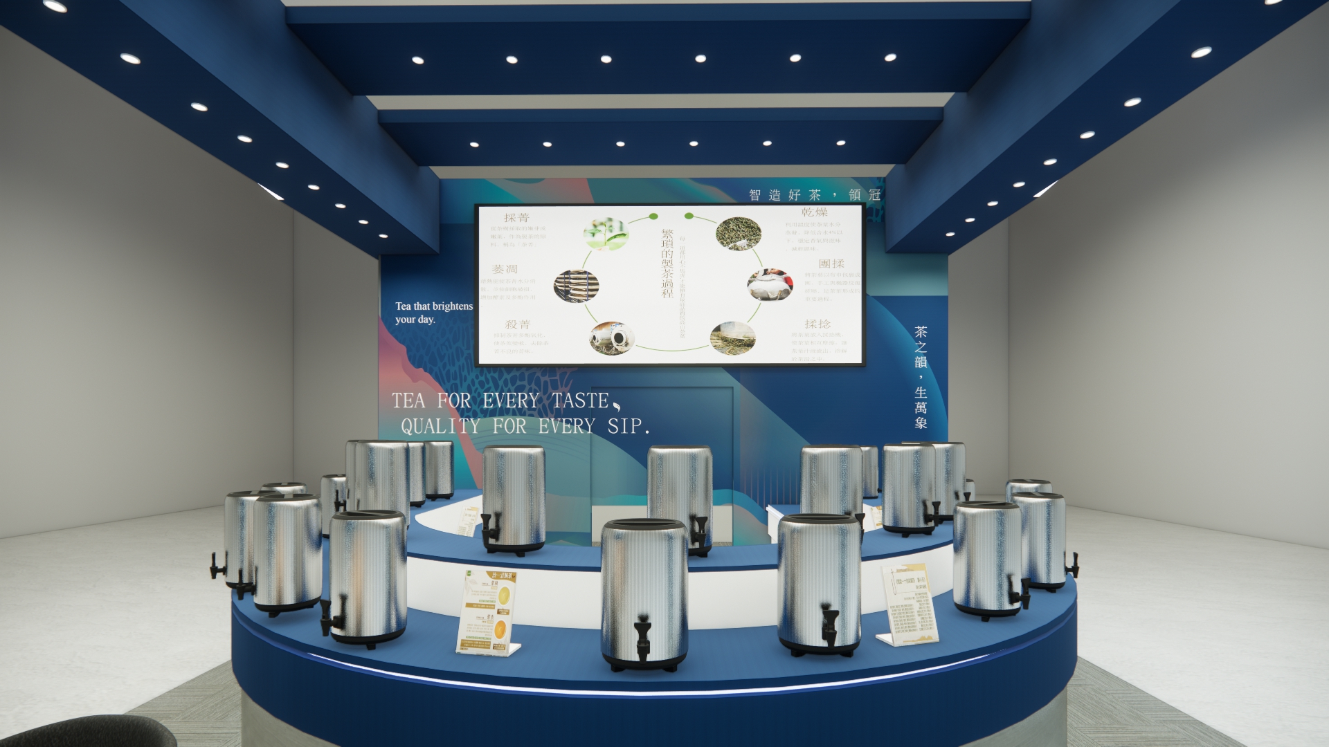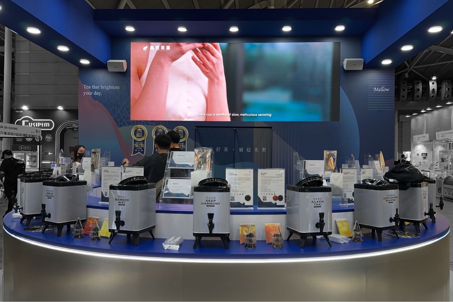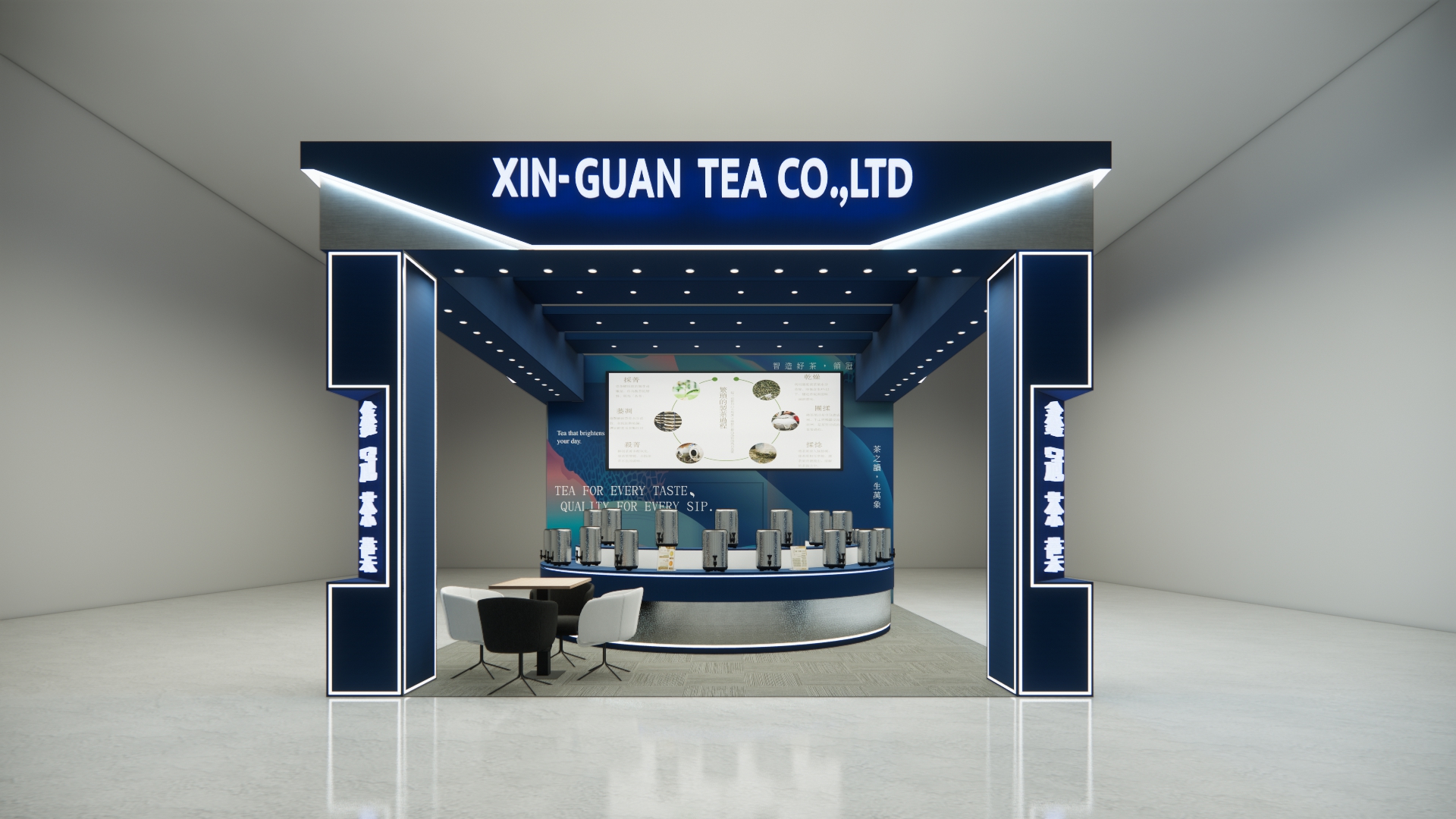 此次為「鑫冠茶葉」新加坡國際食品飲料展設計主視覺 以”智造好茶,領冠未來”為主題設計 深藍為主調,象徵穩重與專業 搭配不鏽鋼金屬質感與燈條點綴 營造出科技與傳統交融的品牌形象。 攤位線條俐落,開放式格局讓動線流暢,便於參觀與洽談