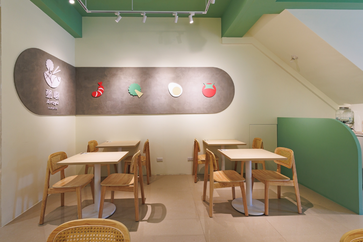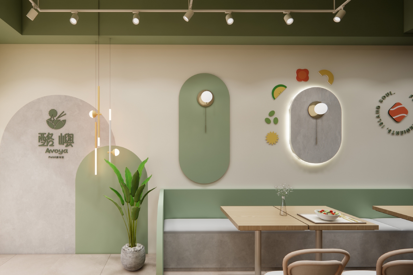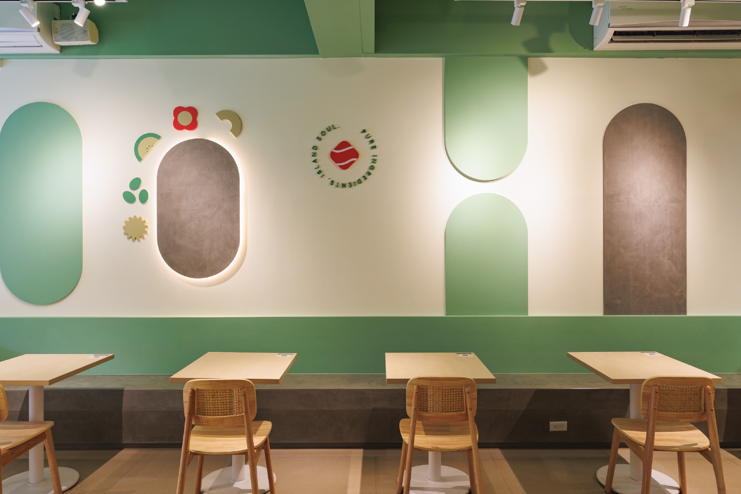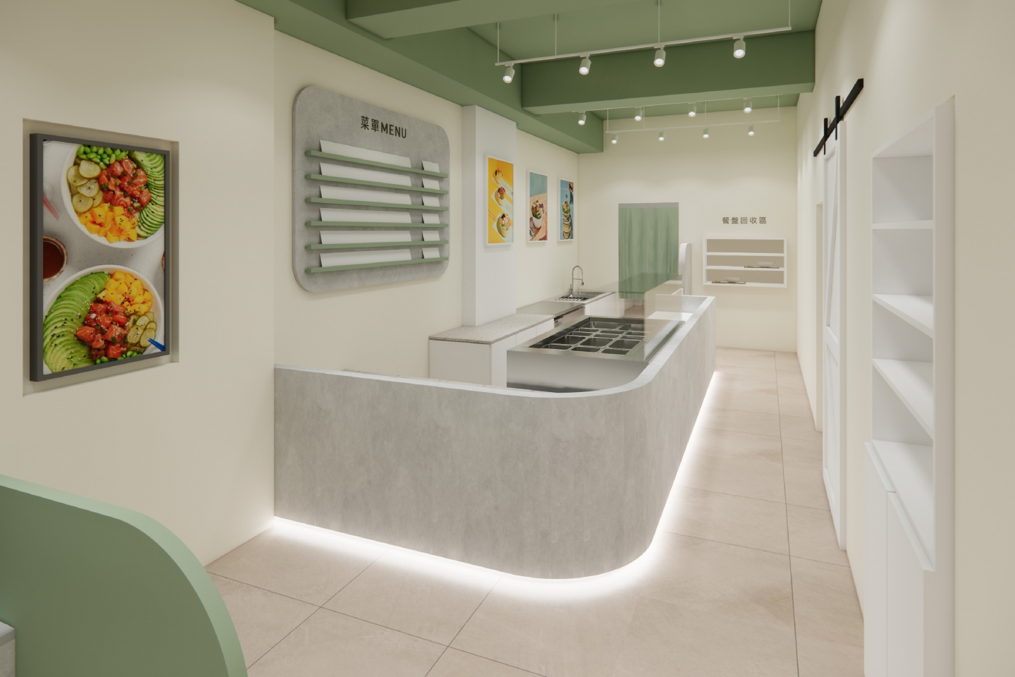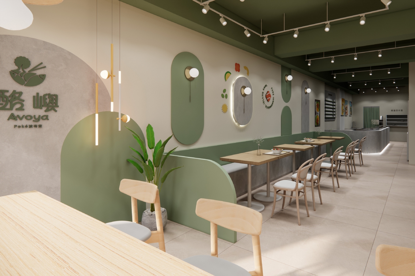 整體空間以 清新綠色與淺木色為基調 搭配溫潤的米白牆面與簡約幾何造型燈具 營造明亮、舒適又不失現代感的用餐氛圍 室內運用弧形與幾何裝飾牆面,搭配植栽與柔和燈光,增添自然愜意的氛圍 此設計不僅呼應 Poké 健康、清新、海島風情的品牌精神 也讓顧客在空間中感受到「輕盈自在的夏威夷島嶼感」。