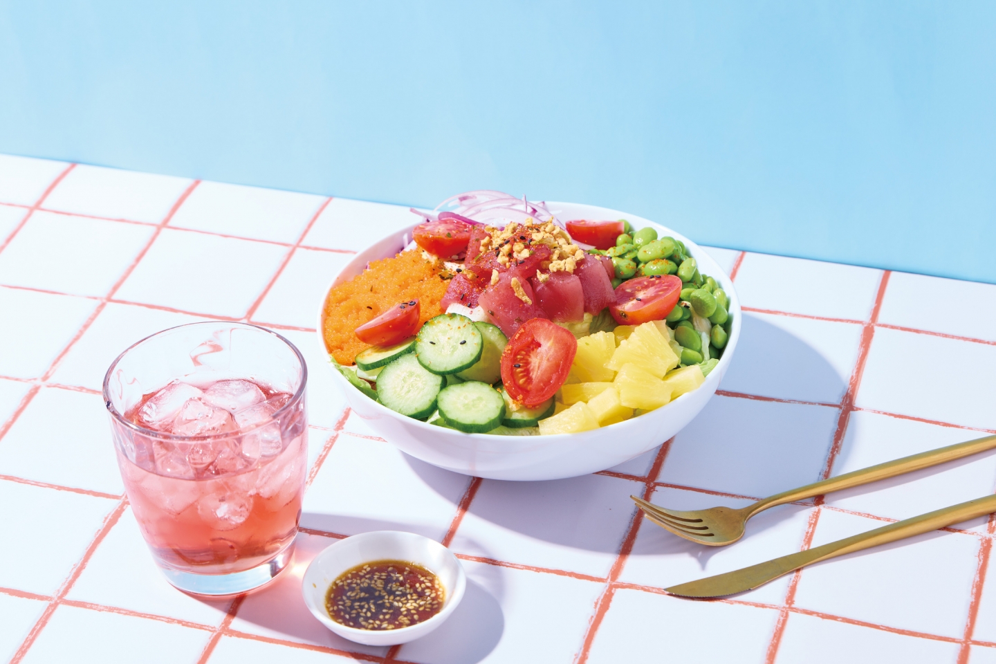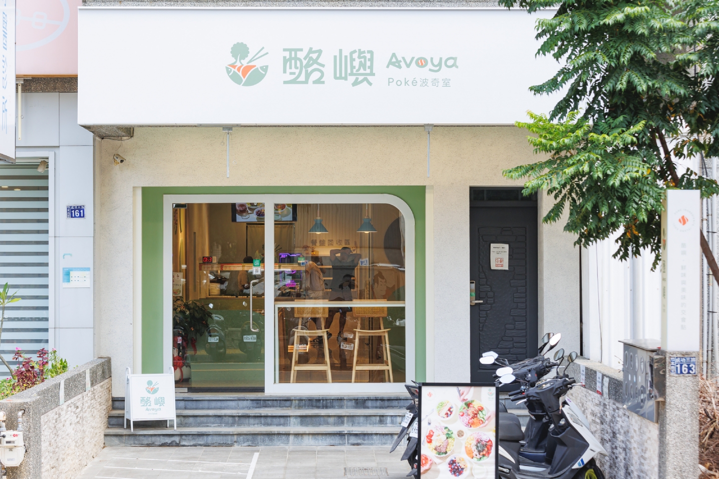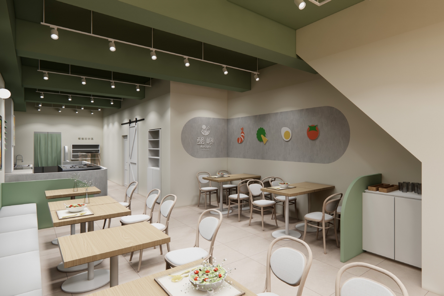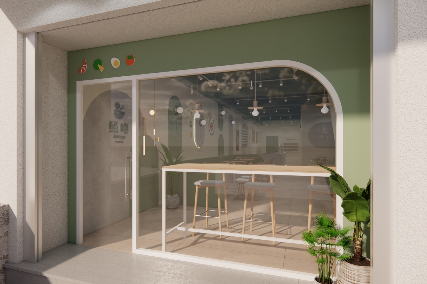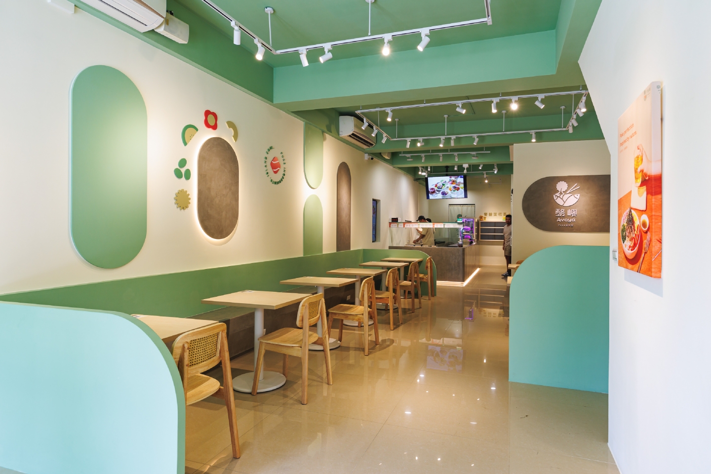 整體空間以 清新綠色與淺木色為基調 搭配溫潤的米白牆面與簡約幾何造型燈具 營造明亮、舒適又不失現代感的用餐氛圍 室內運用弧形與幾何裝飾牆面,搭配植栽與柔和燈光,增添自然愜意的氛圍 此設計不僅呼應 Poké 健康、清新、海島風情的品牌精神 也讓顧客在空間中感受到「輕盈自在的夏威夷島嶼感」。