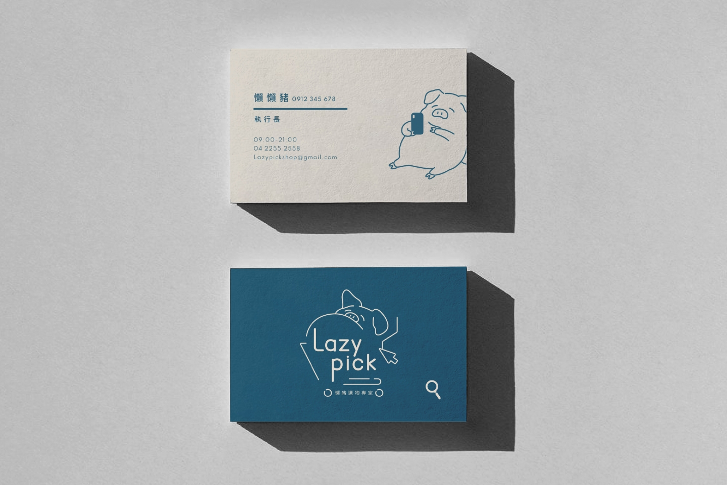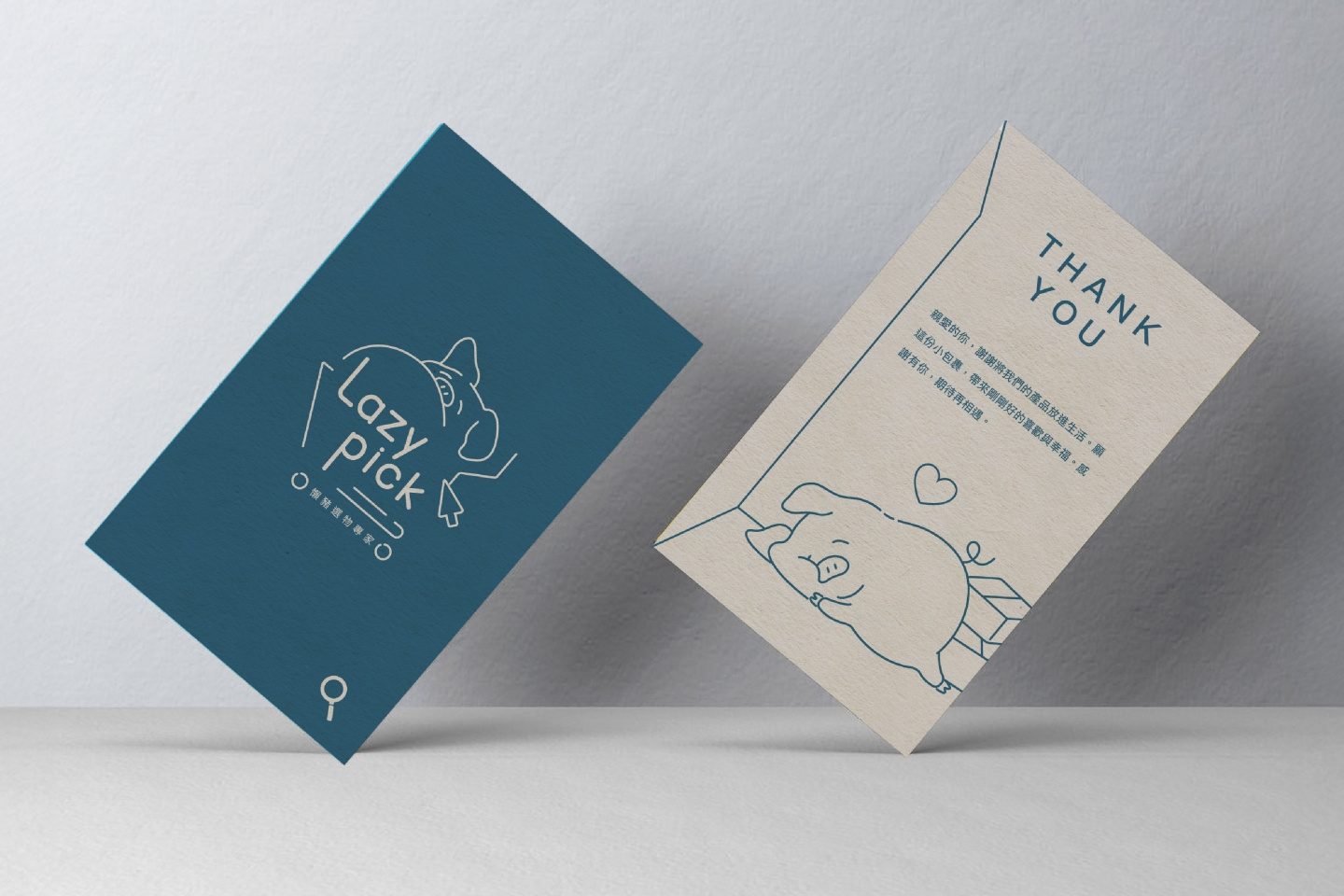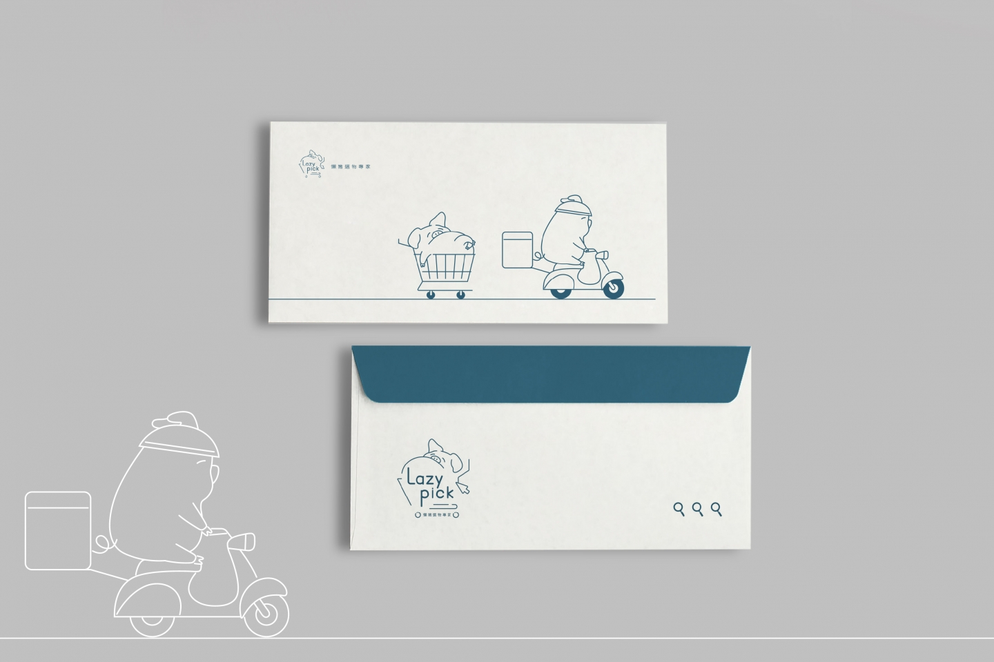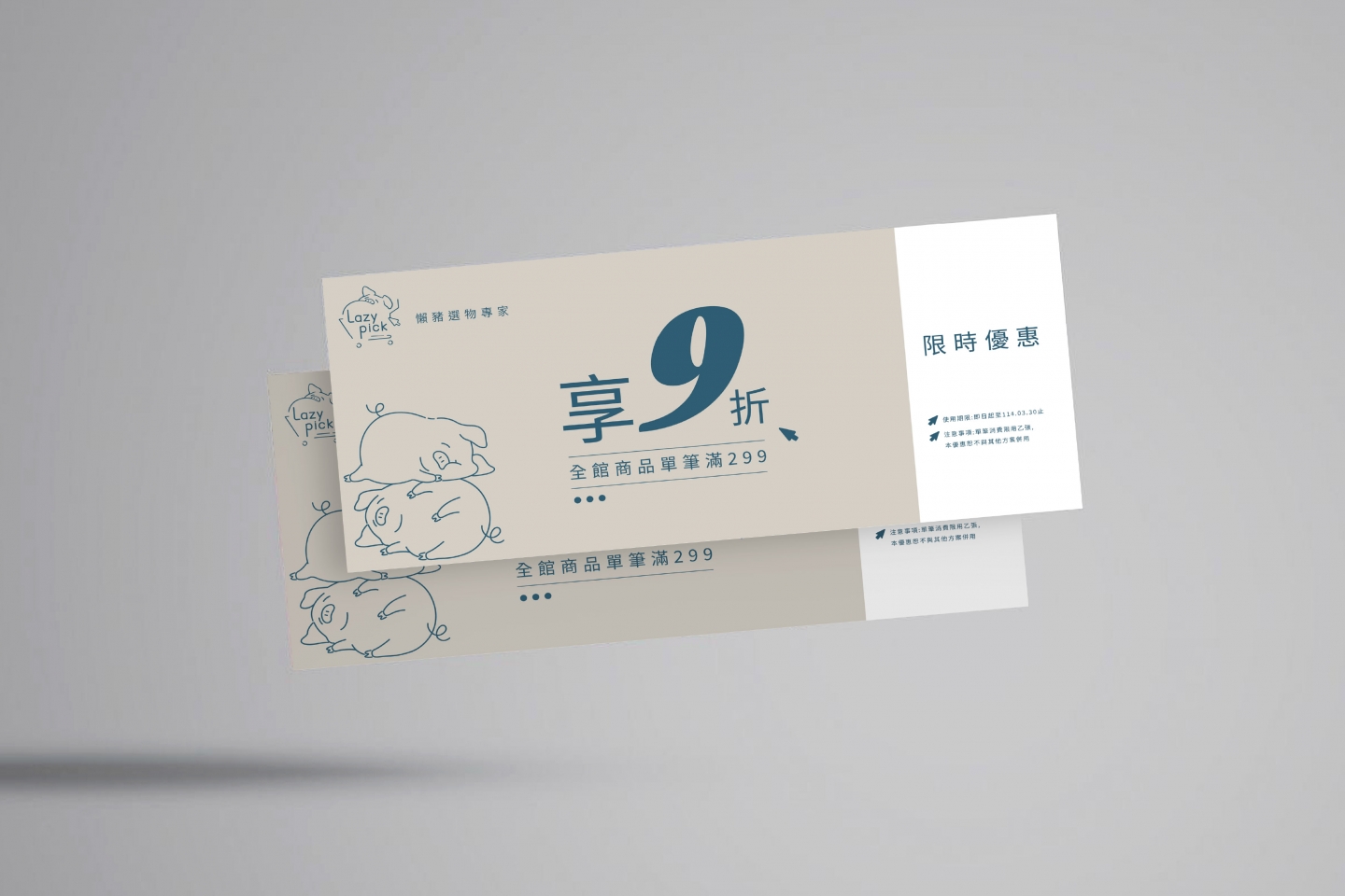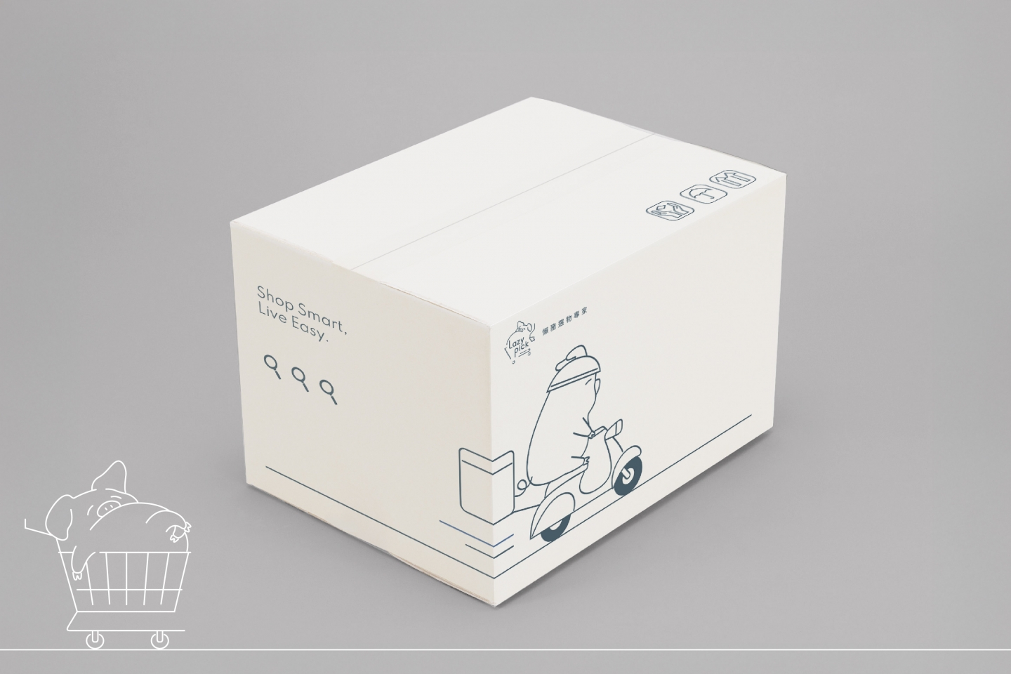 --設計重點-- 品牌核心語彙: 慵懶 × 簡單 × 生活感 主視覺元素: 懶豬插畫 × 游標 × 購物車 品牌調性: 清新、親切、便利、俏皮 色彩設定: 主色為藍灰色,輔以米色與白色,平衡溫 暖與理性