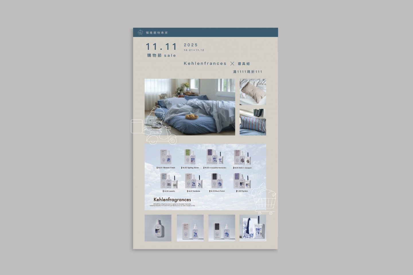 整體色調以低飽和的藍灰色系為主 營造出乾淨、理性又帶溫度的品牌氛圍 插畫風格線條簡潔、筆觸柔和,呼應品牌的輕鬆節奏與幽默個性 排版上採用留白與極簡構圖,呈現出俐落的現代感,同時保留親切感/p>