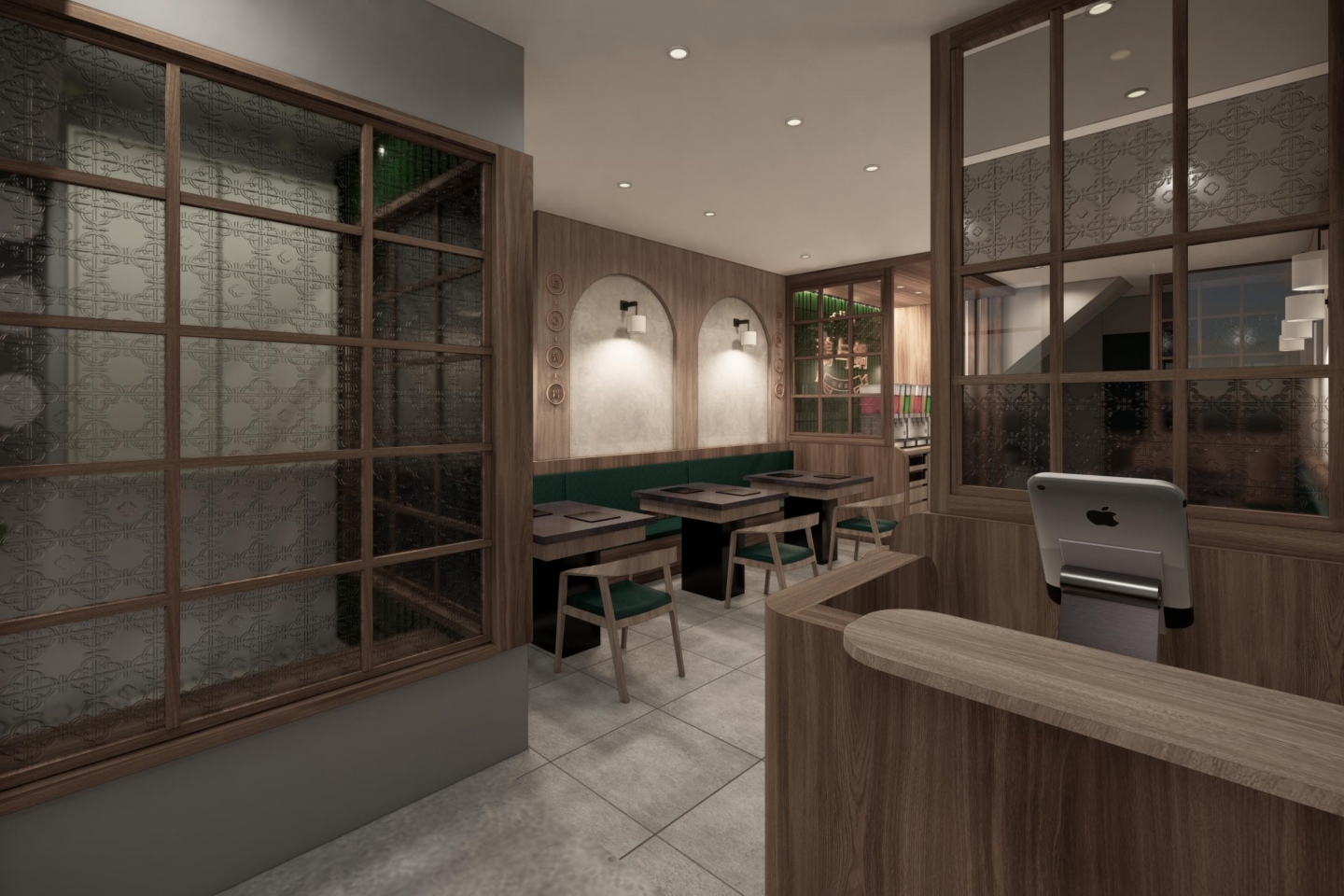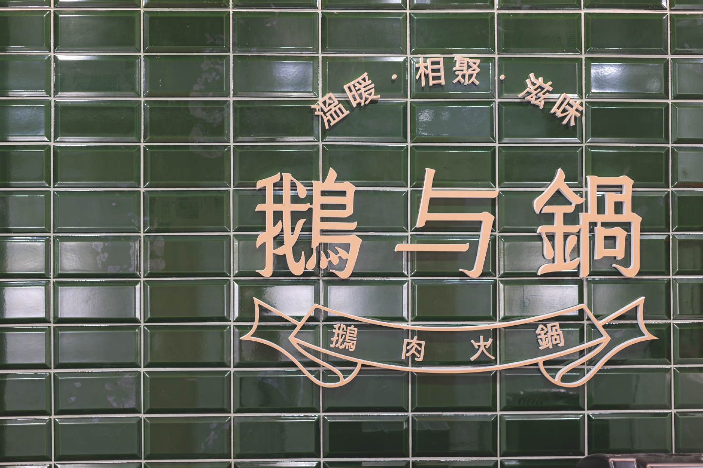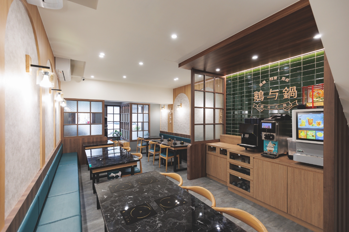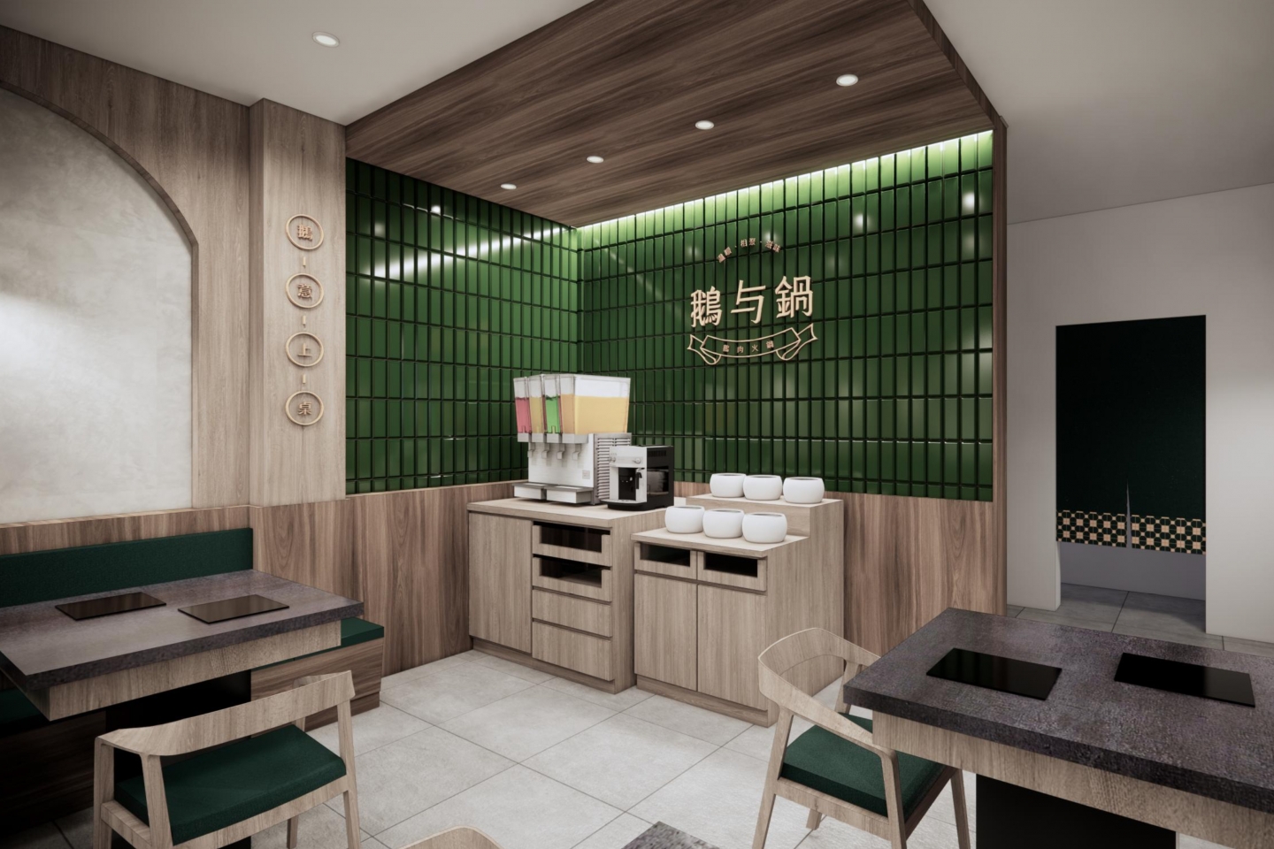 空間設計旨在創造一個復古優雅,舒適放鬆的用餐體驗 將港式茶樓的懷舊情調融入現代火鍋店的機能中 以現代輕復古,融合港式窗花與木質元素 大量使用淺色/暖色木皮、深綠色亮面磁磚 淺灰/米白色水磨石地磚或仿石材牆面 木材的溫潤感與深綠色的沉穩形成對比,強化了復古氛圍 飲料與醬料區以深綠色亮面長條磁磚作為背景牆 並在上方設置立體金屬 Logo,使此區域成為空間的視覺焦點 招牌採用墨綠色底搭配暖白光霓虹燈風格的 Logo 呈現 強烈的視覺對比讓招牌在夜間具有高辨識度,呼應懷舊港式風格