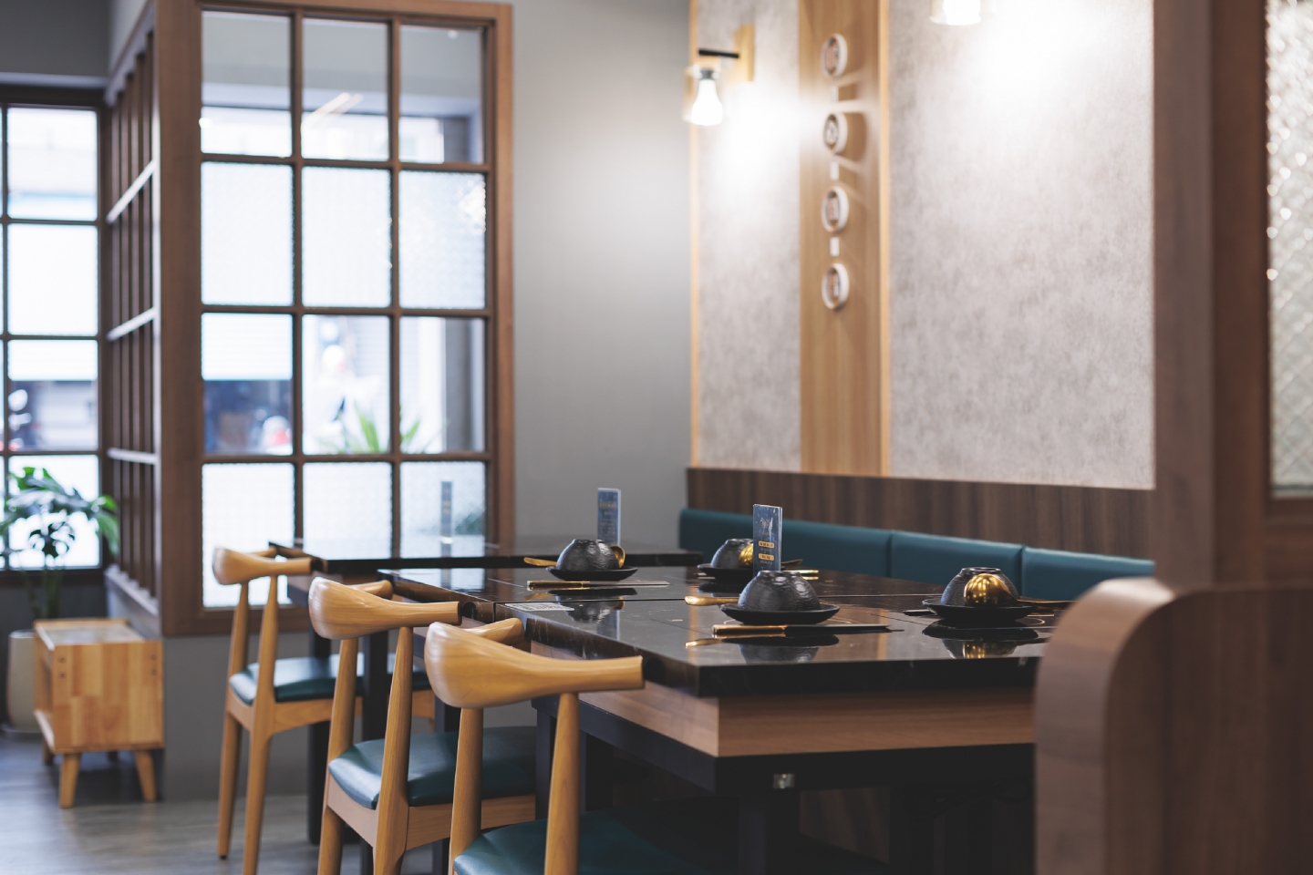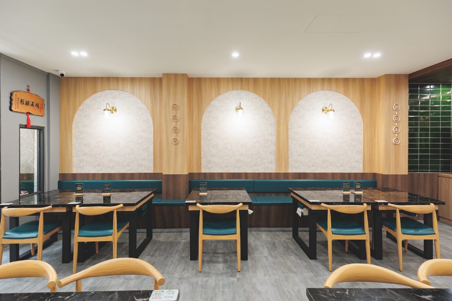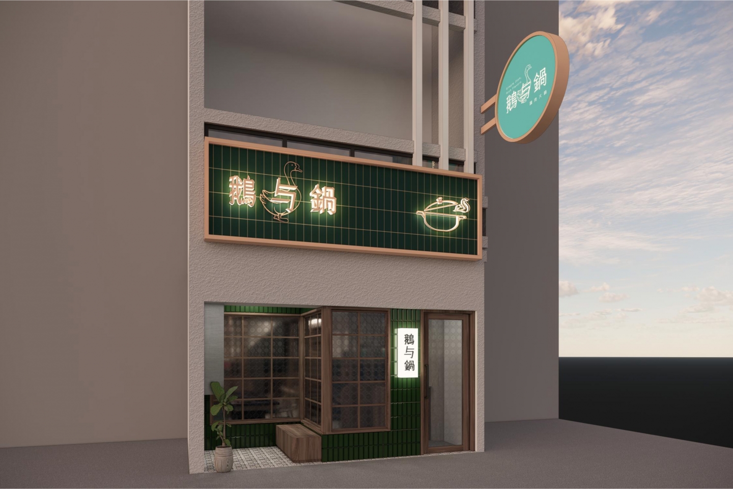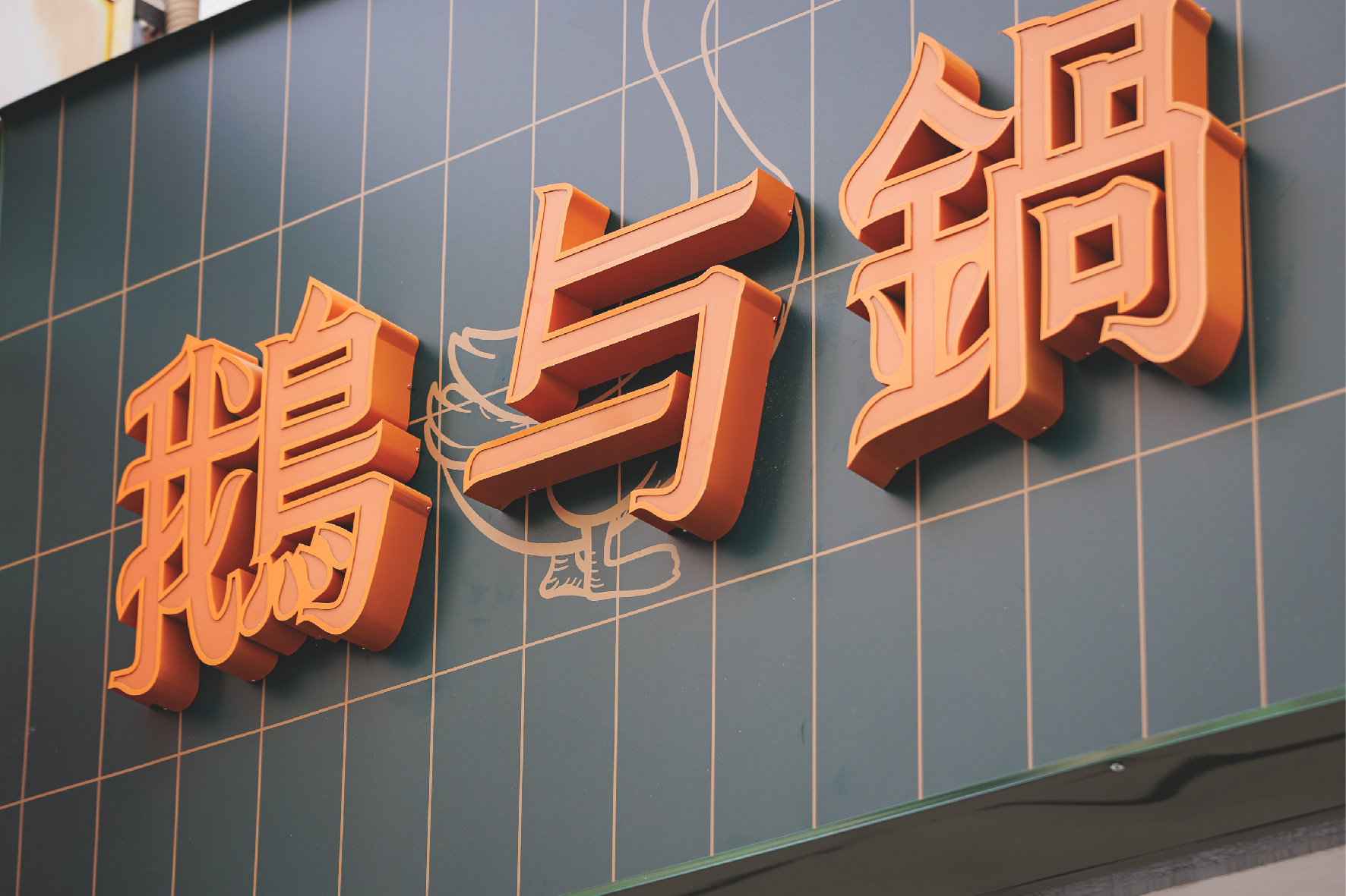 空間設計旨在創造一個復古優雅,舒適放鬆的用餐體驗 將港式茶樓的懷舊情調融入現代火鍋店的機能中 以現代輕復古,融合港式窗花與木質元素 大量使用淺色/暖色木皮、深綠色亮面磁磚 淺灰/米白色水磨石地磚或仿石材牆面 木材的溫潤感與深綠色的沉穩形成對比,強化了復古氛圍 飲料與醬料區以深綠色亮面長條磁磚作為背景牆 並在上方設置立體金屬 Logo,使此區域成為空間的視覺焦點 招牌採用墨綠色底搭配暖白光霓虹燈風格的 Logo 呈現 強烈的視覺對比讓招牌在夜間具有高辨識度,呼應懷舊港式風格