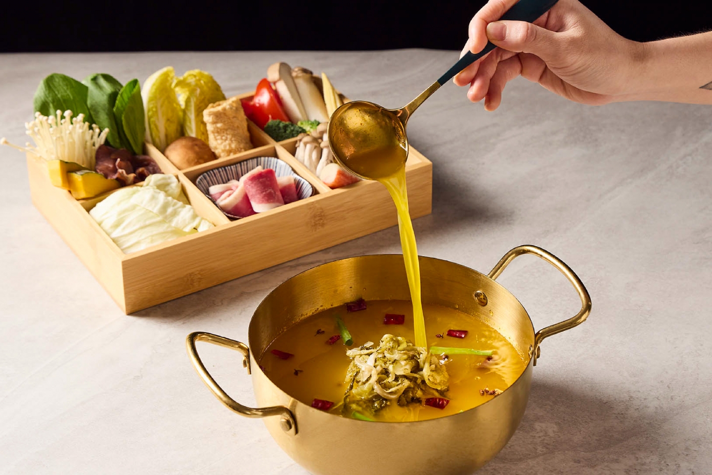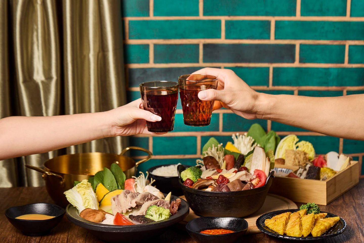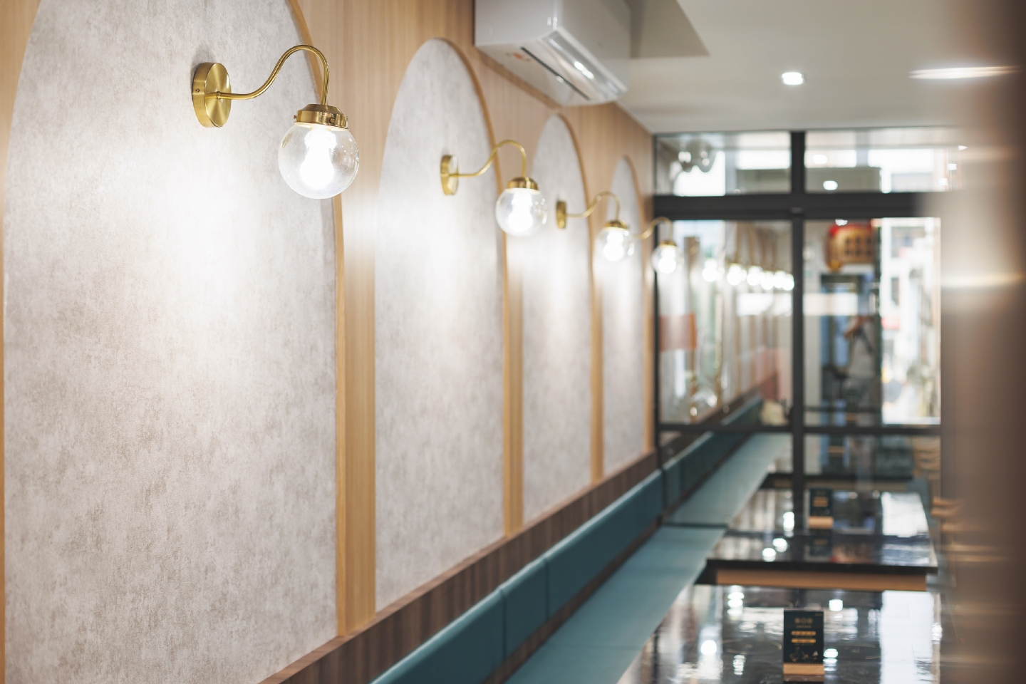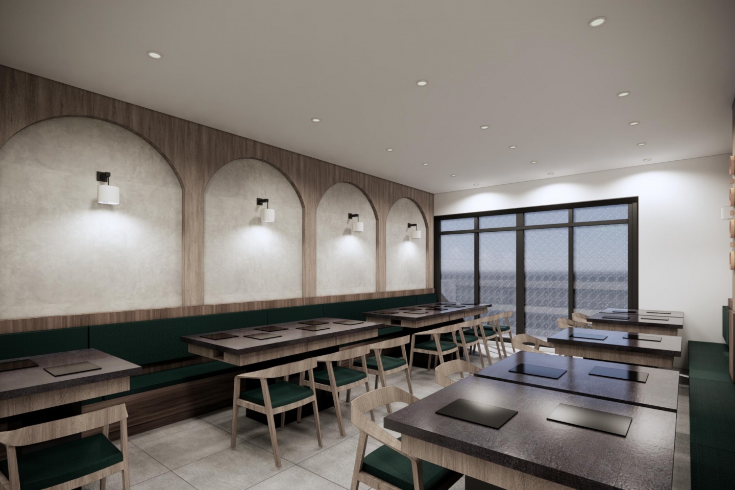 空間設計旨在創造一個復古優雅,舒適放鬆的用餐體驗 將港式茶樓的懷舊情調融入現代火鍋店的機能中 以現代輕復古,融合港式窗花與木質元素 大量使用淺色/暖色木皮、深綠色亮面磁磚 淺灰/米白色水磨石地磚或仿石材牆面 木材的溫潤感與深綠色的沉穩形成對比,強化了復古氛圍 飲料與醬料區以深綠色亮面長條磁磚作為背景牆 並在上方設置立體金屬 Logo,使此區域成為空間的視覺焦點 招牌採用墨綠色底搭配暖白光霓虹燈風格的 Logo 呈現 強烈的視覺對比讓招牌在夜間具有高辨識度,呼應懷舊港式風格