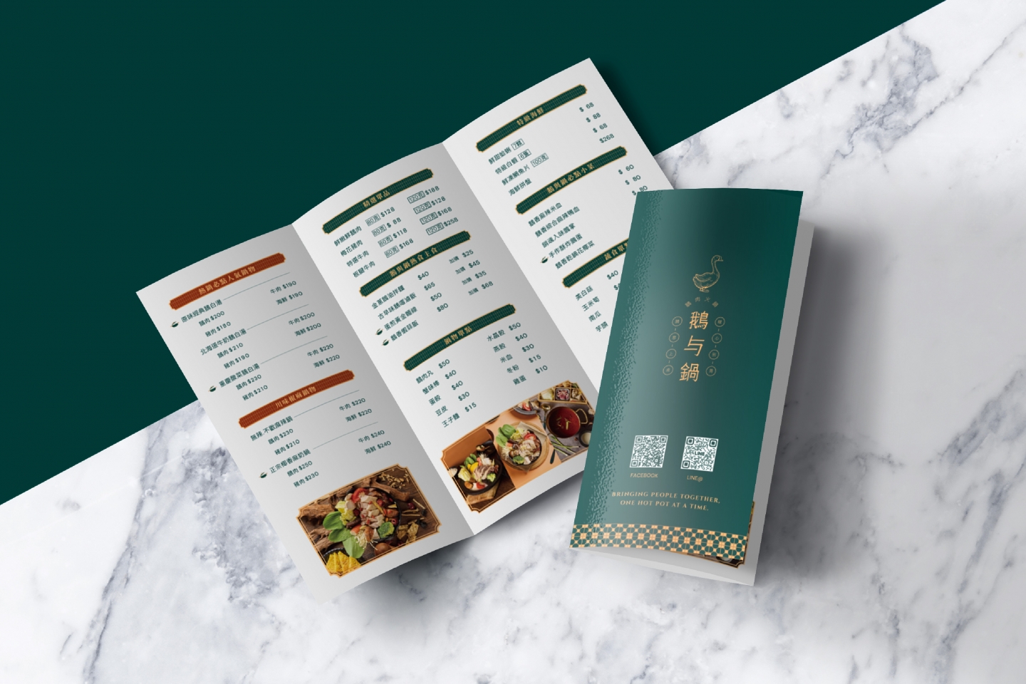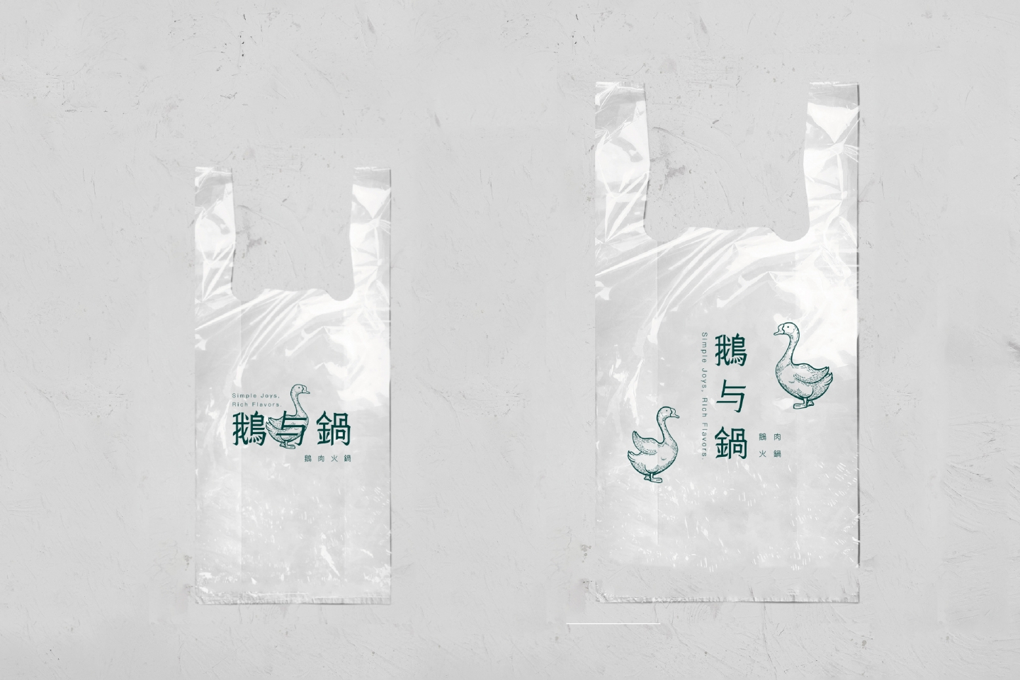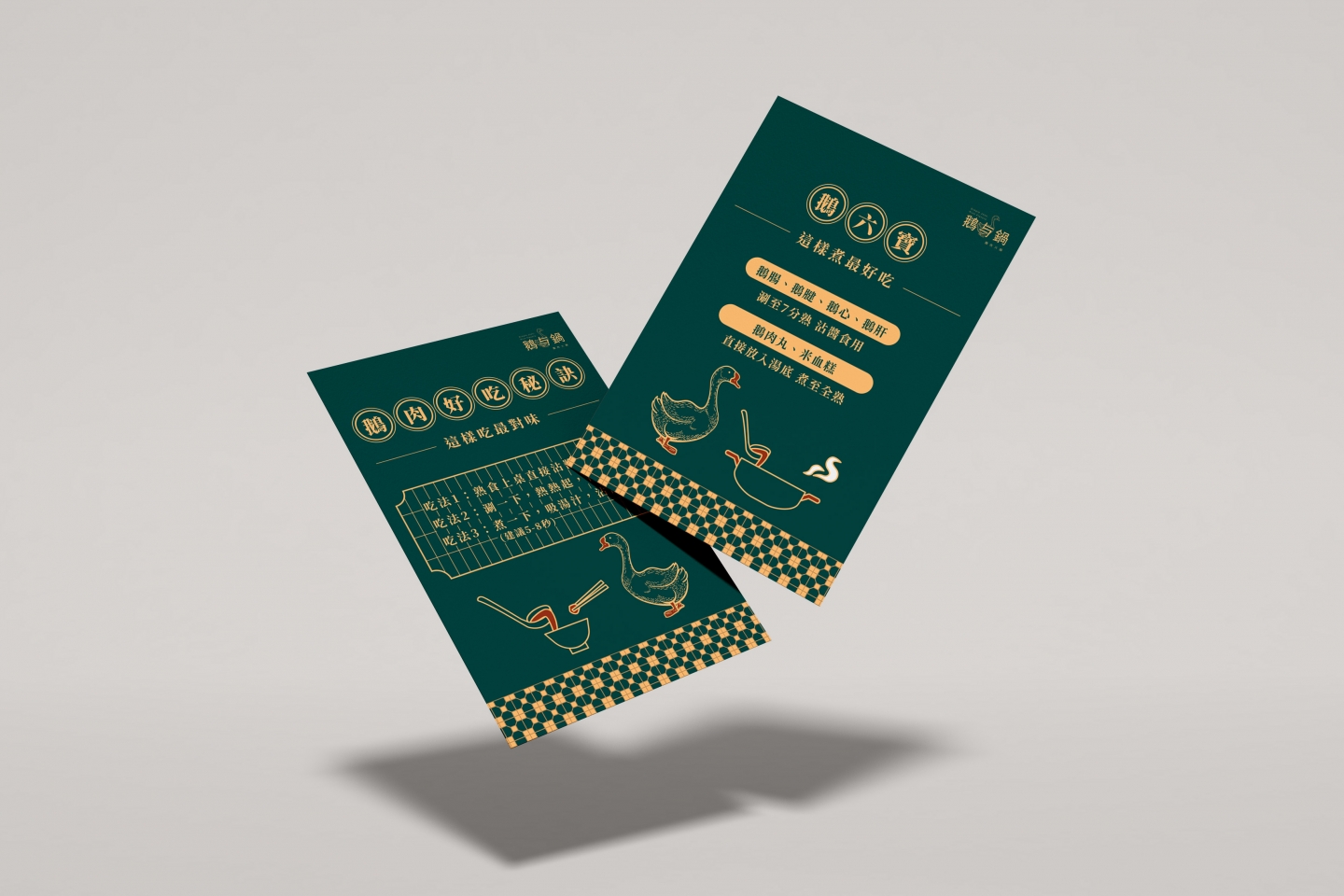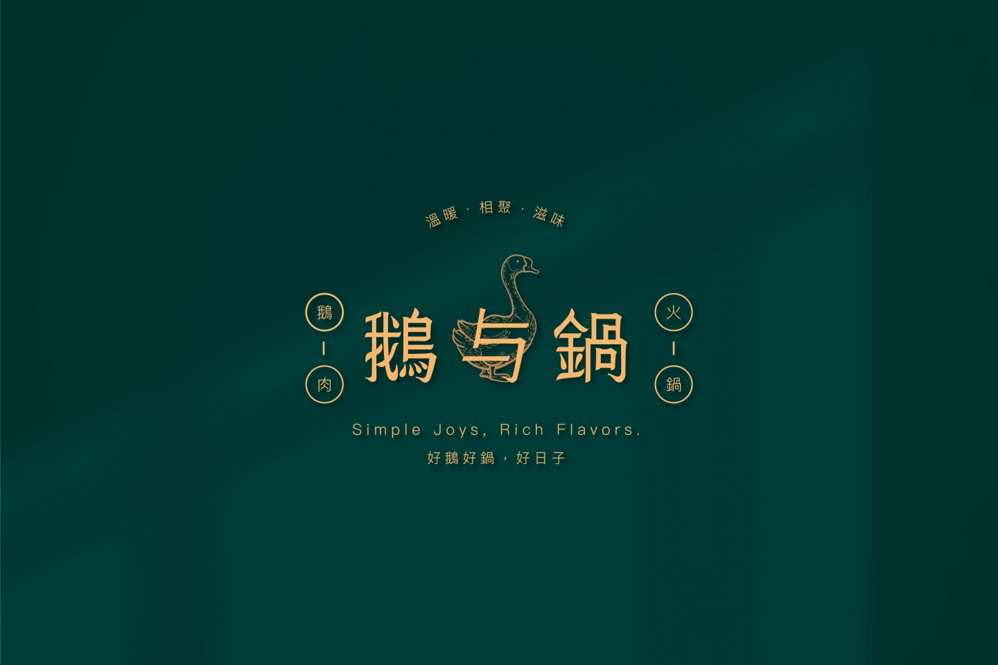Logo 將「鵝」的優雅特質與火鍋的溫暖相聚意象結合 採用簡約線條勾勒出鵝的形象,姿態優雅,象徵品牌的專業 標準字「鵝与鍋」的細節處理充滿筆觸感 靈感源自鵝的柔和與堅定,字體筆畫柔和卻不失力量 透過兩側的「鵝肉」與「火鍋」圖標 巧妙地增添了港式復古招牌的氣息 主色調為沉穩的墨綠色搭配溫暖的古銅金 墨綠色帶來質感與懷舊感 古銅金呼應火鍋的熱度,整體視覺沉穩而典雅 輔助圖形以具備港式幾何圖案的連續花紋 以及簡筆鵝肉、火鍋等線條插畫
