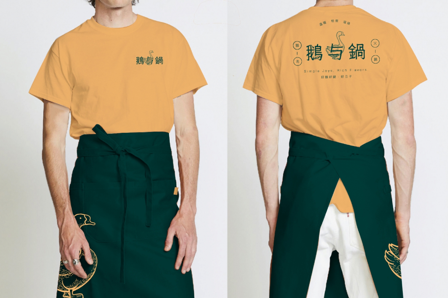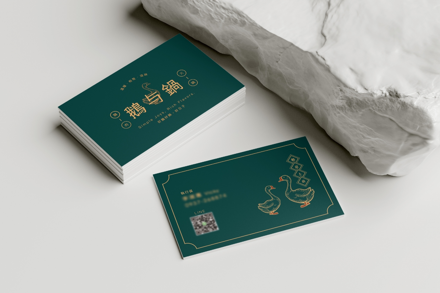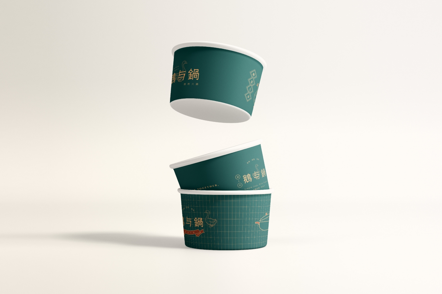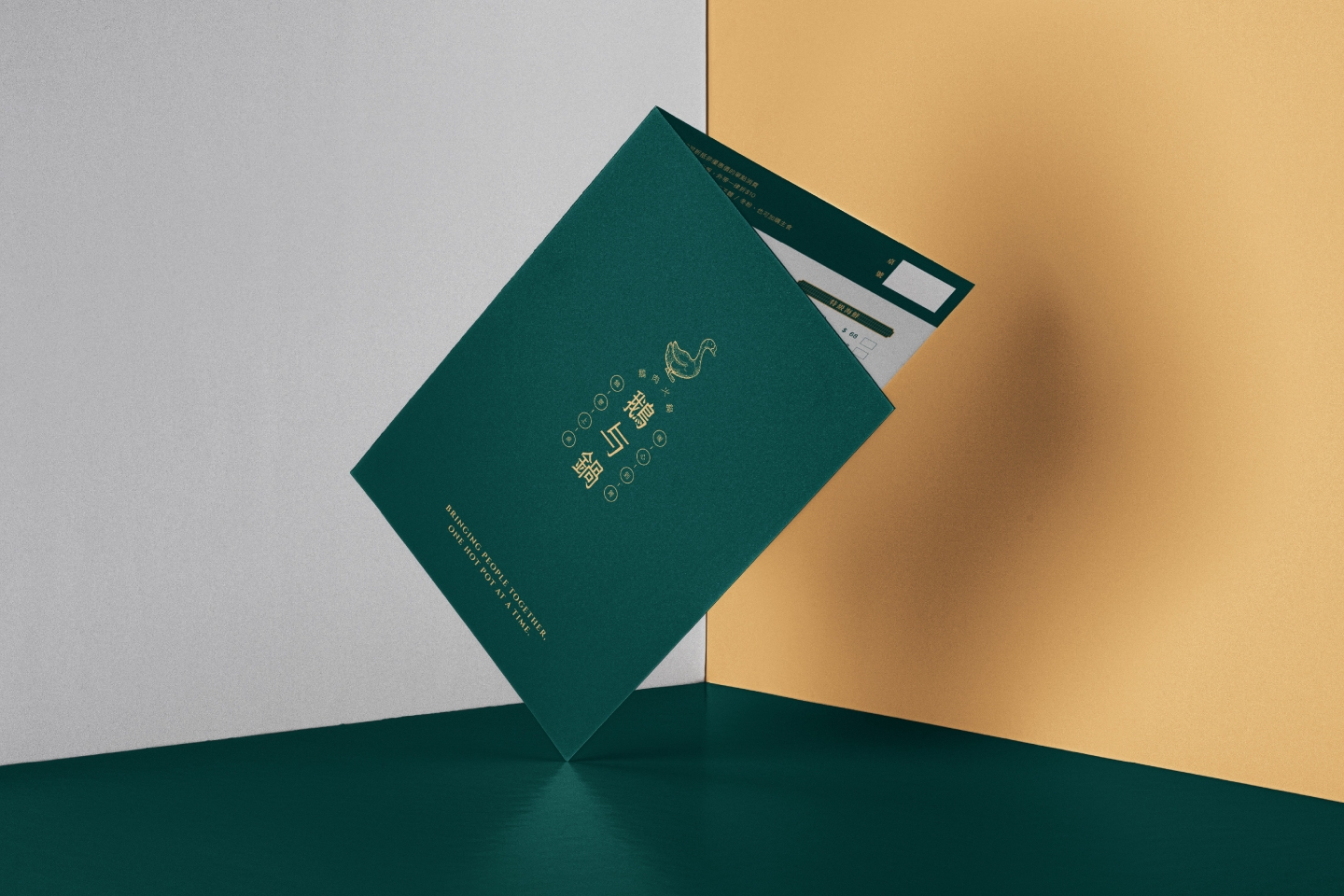 Logo 將「鵝」的優雅特質與火鍋的溫暖相聚意象結合 採用簡約線條勾勒出鵝的形象,姿態優雅,象徵品牌的專業 標準字「鵝与鍋」的細節處理充滿筆觸感 靈感源自鵝的柔和與堅定,字體筆畫柔和卻不失力量 透過兩側的「鵝肉」與「火鍋」圖標 巧妙地增添了港式復古招牌的氣息 主色調為沉穩的墨綠色搭配溫暖的古銅金 墨綠色帶來質感與懷舊感 古銅金呼應火鍋的熱度,整體視覺沉穩而典雅 輔助圖形以具備港式幾何圖案的連續花紋 以及簡筆鵝肉、火鍋等線條插畫