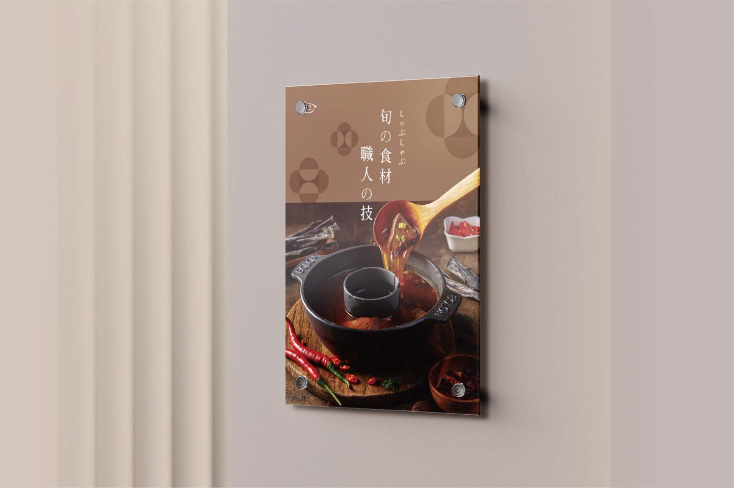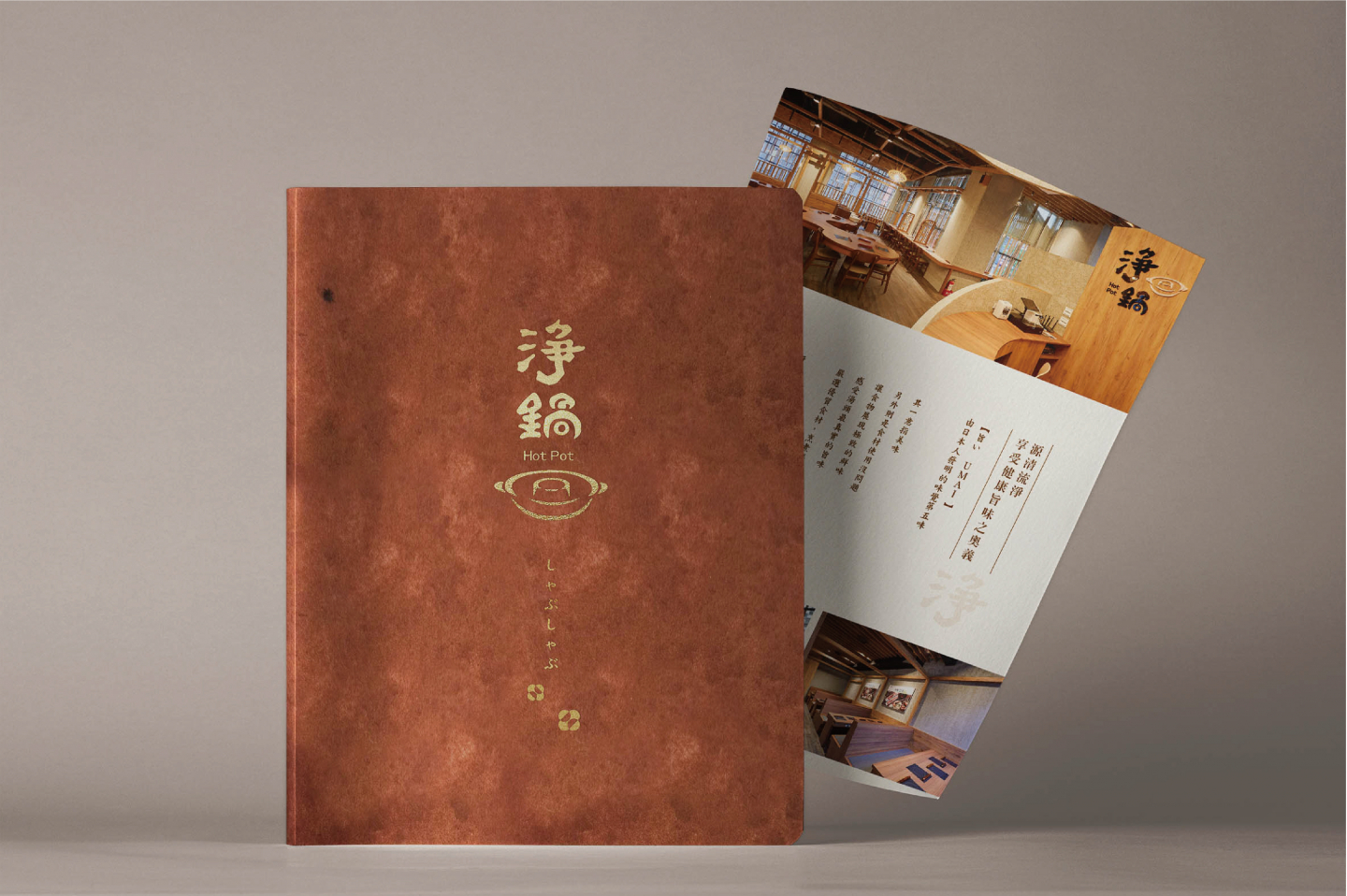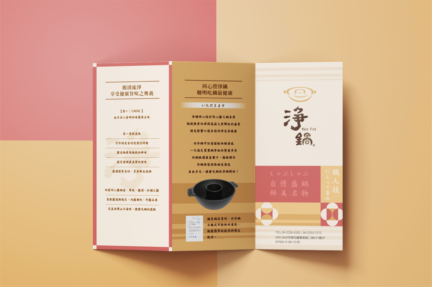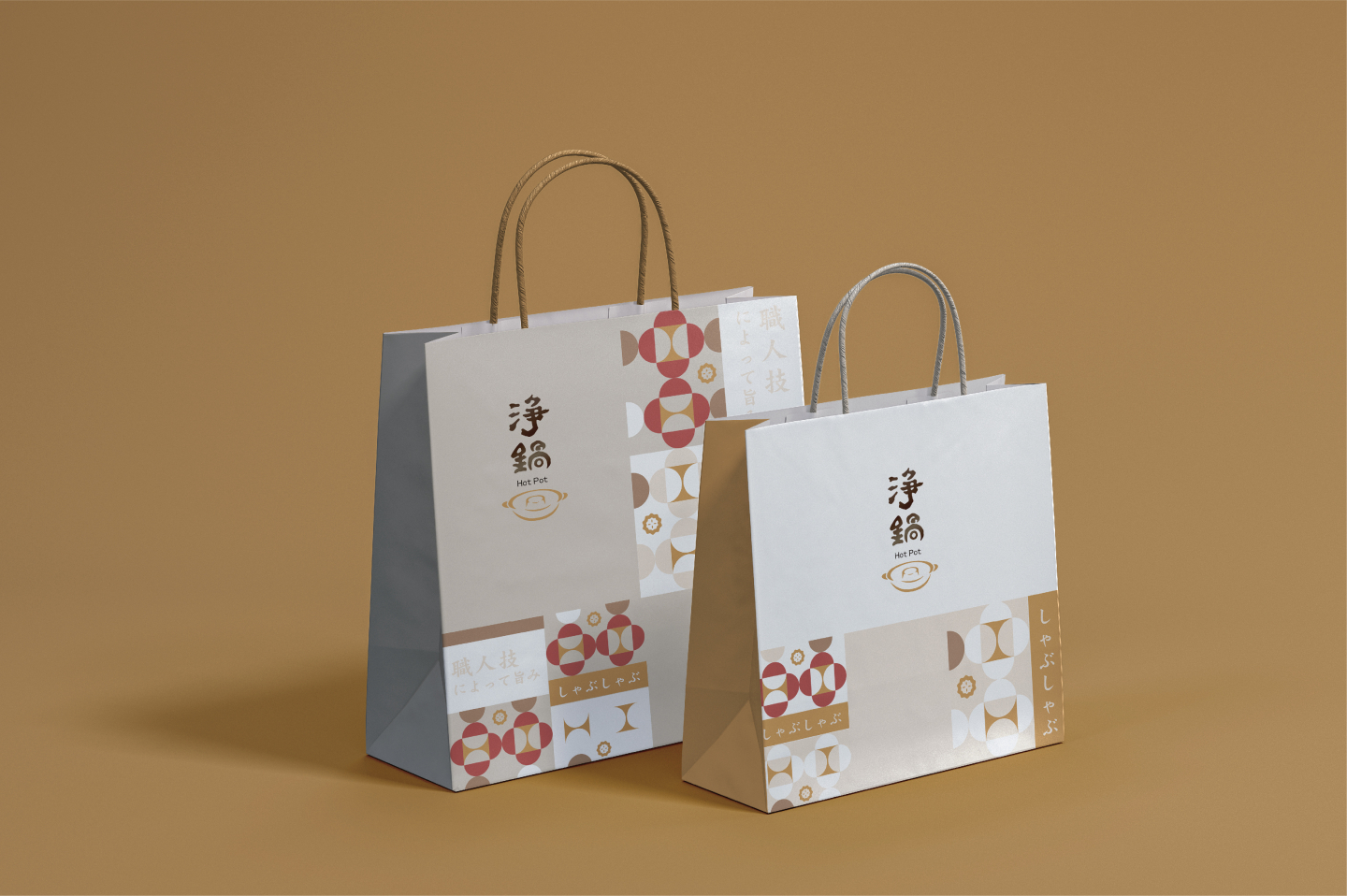 我們希望品牌形象呈現溫暖的日式,又帶些現代時髦,因此以深棕色作為主色調,並搭配輕暖的豆沙紅、米色與淺棕色,以連續圓形圖紋,帶出同心鍋的意象,同時展現品牌單純自然、注重健康的一面。