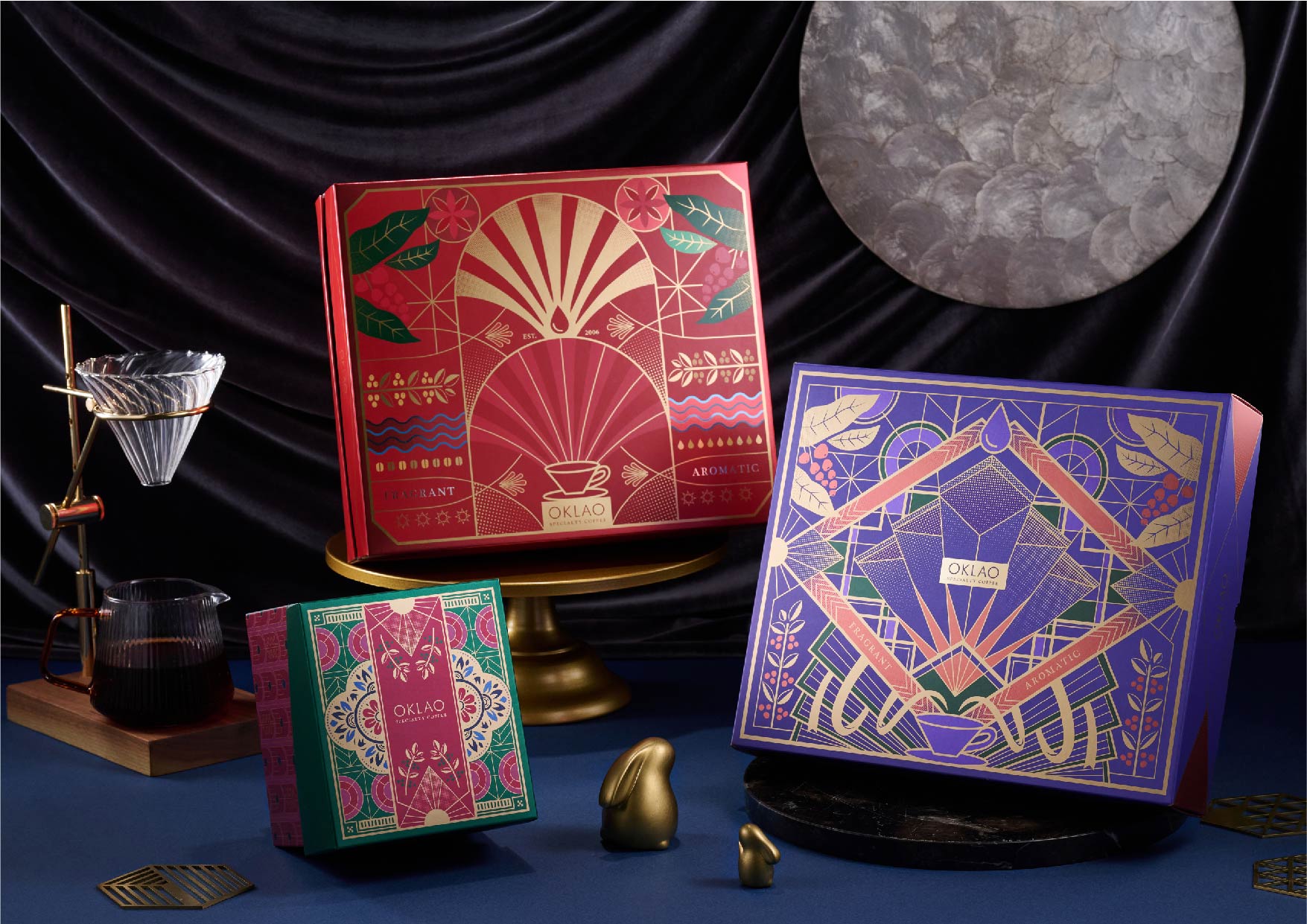 2023此次的中秋禮盒設計以Art Deco為設計發想,將禮盒分為四種價位,每個價位都有著獨特的主題,並以圖案化、重複性的裝飾元素中,大量融合了極具時代風格的特色,為禮盒帶來獨特的視覺風格和豐富的文化內涵,讓每位收到禮盒的人都能感受到藝術和咖啡的融合。
