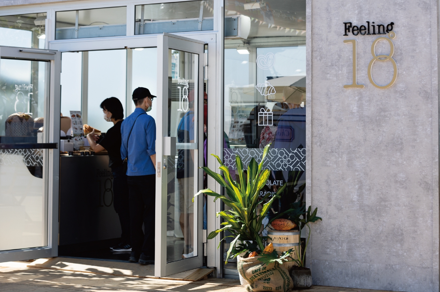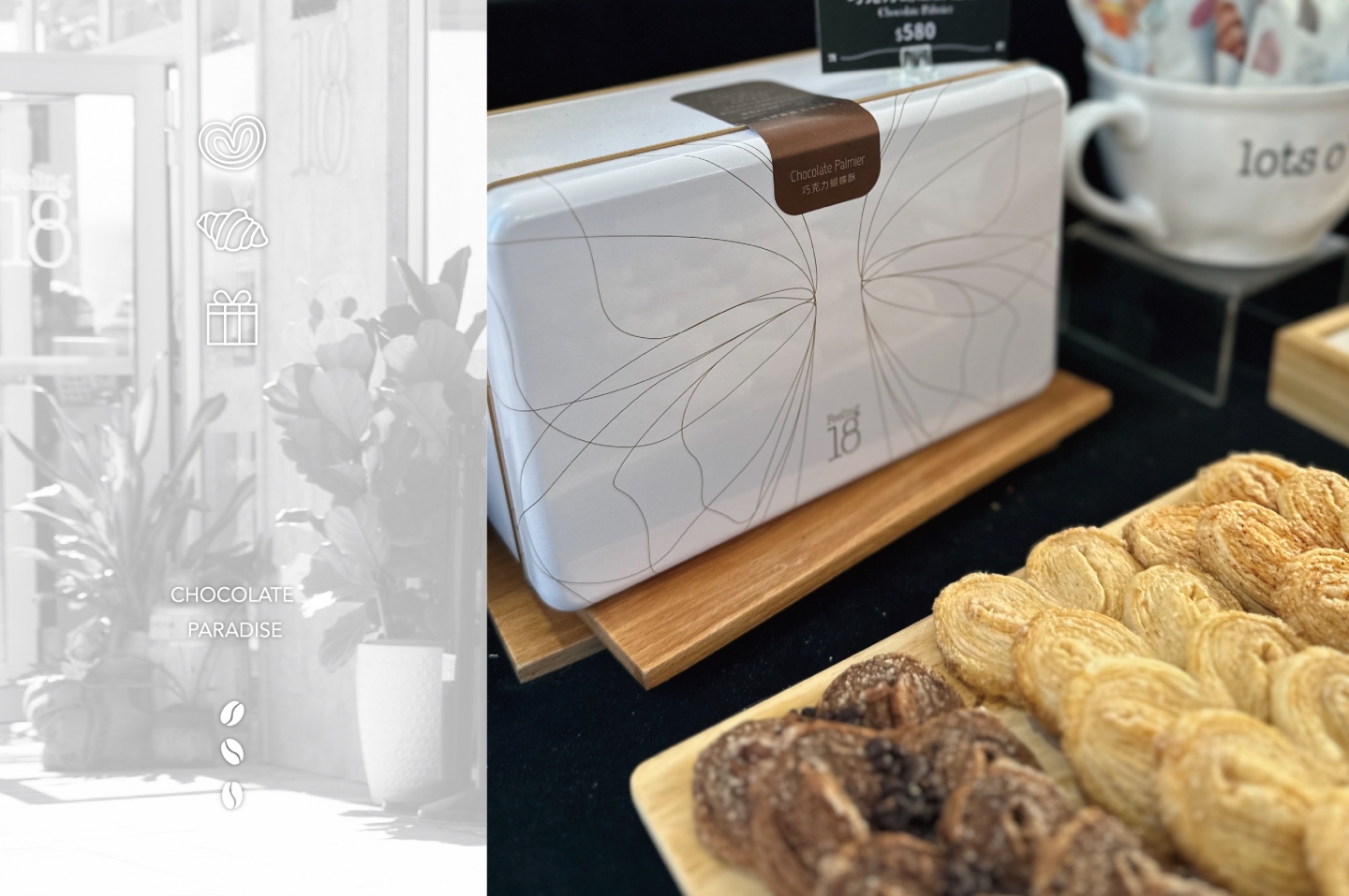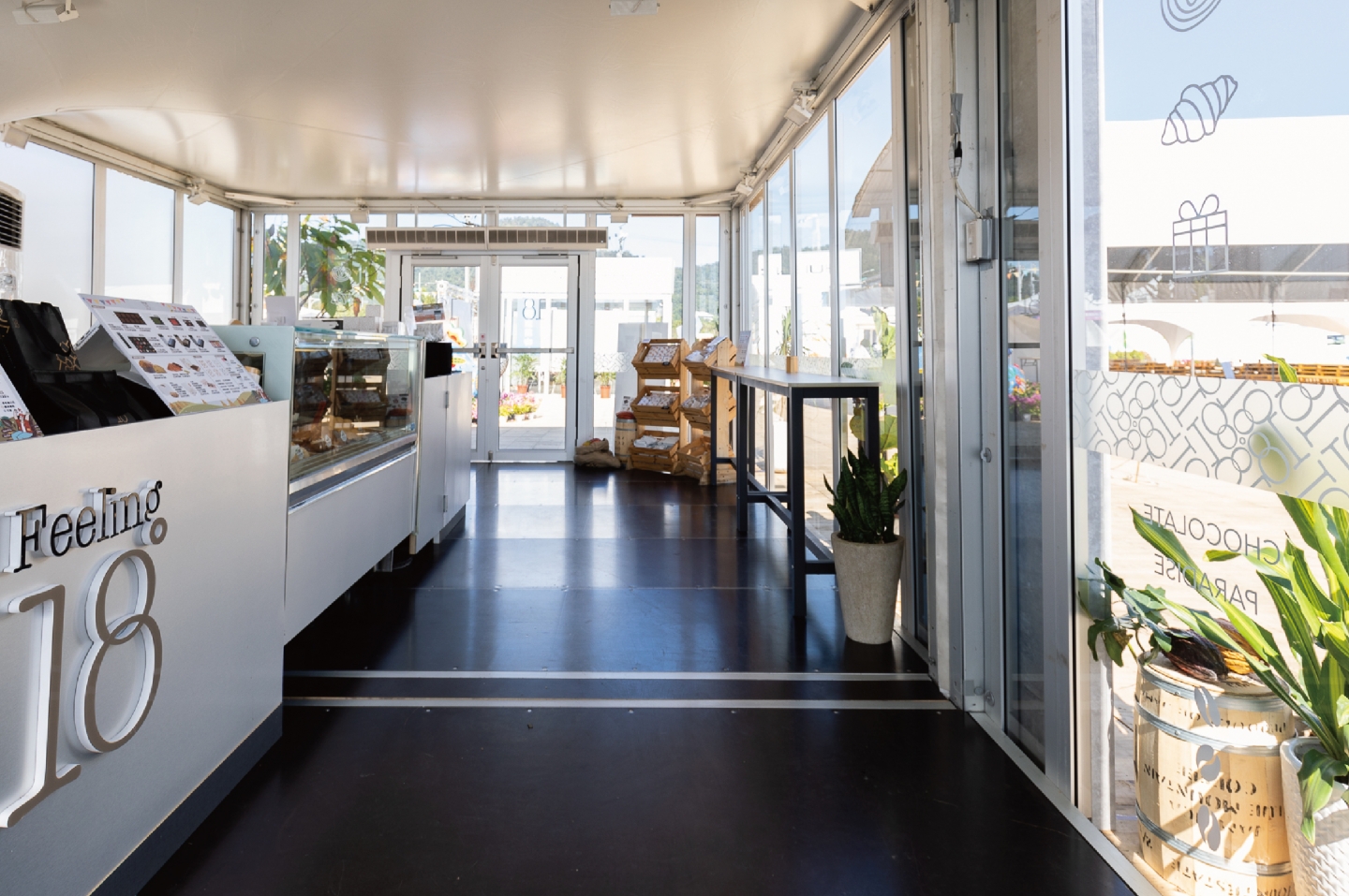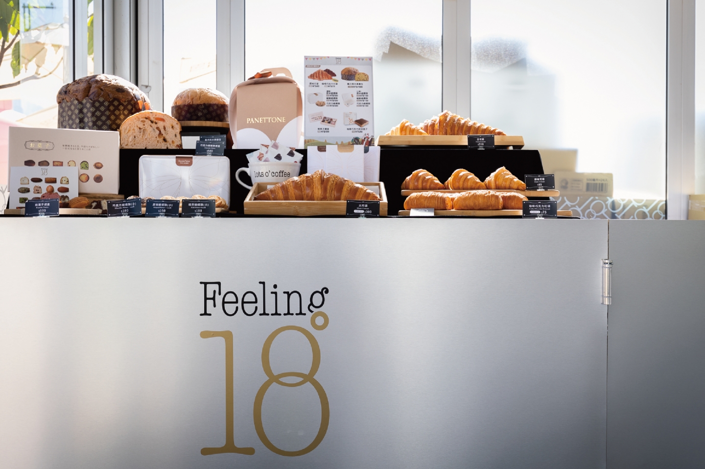 外觀整體以營造出純淨且高雅的氛圍,搭配顯眼的金屬招牌,凸顯品牌的專業和獨特性。透過卡點西德在通透的玻璃上繪製如同禮物緞帶般的圖案,增加視覺吸引力,使店面在快閃店中脫穎而出。 四周以綠色植物點綴,使得空間更顯活潑與朝氣。 店內櫃檯延續了外觀的整體視覺風格,以金屬貼模打造科技感,搭配各式層架展示商品,提供了多角度的商品呈現,方便顧客一目瞭然挑選商品。 整體設計風格既符合品牌的專業形象,又使得顧客在進入店內即能感受到Feeling18巧克力獨特的品牌魅力。