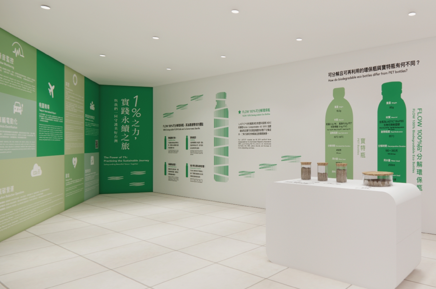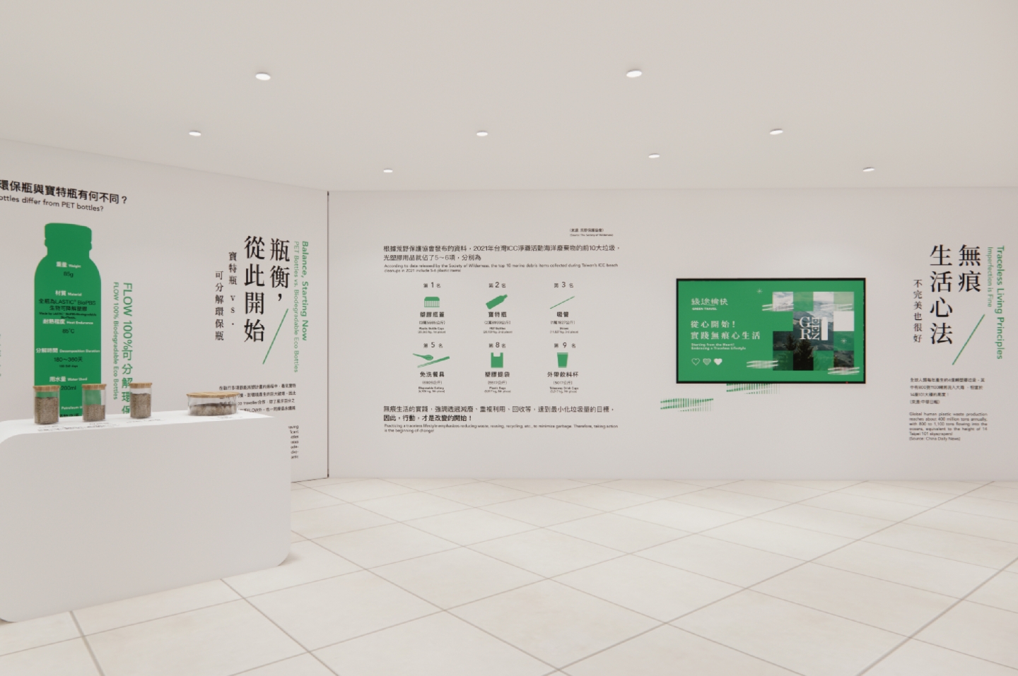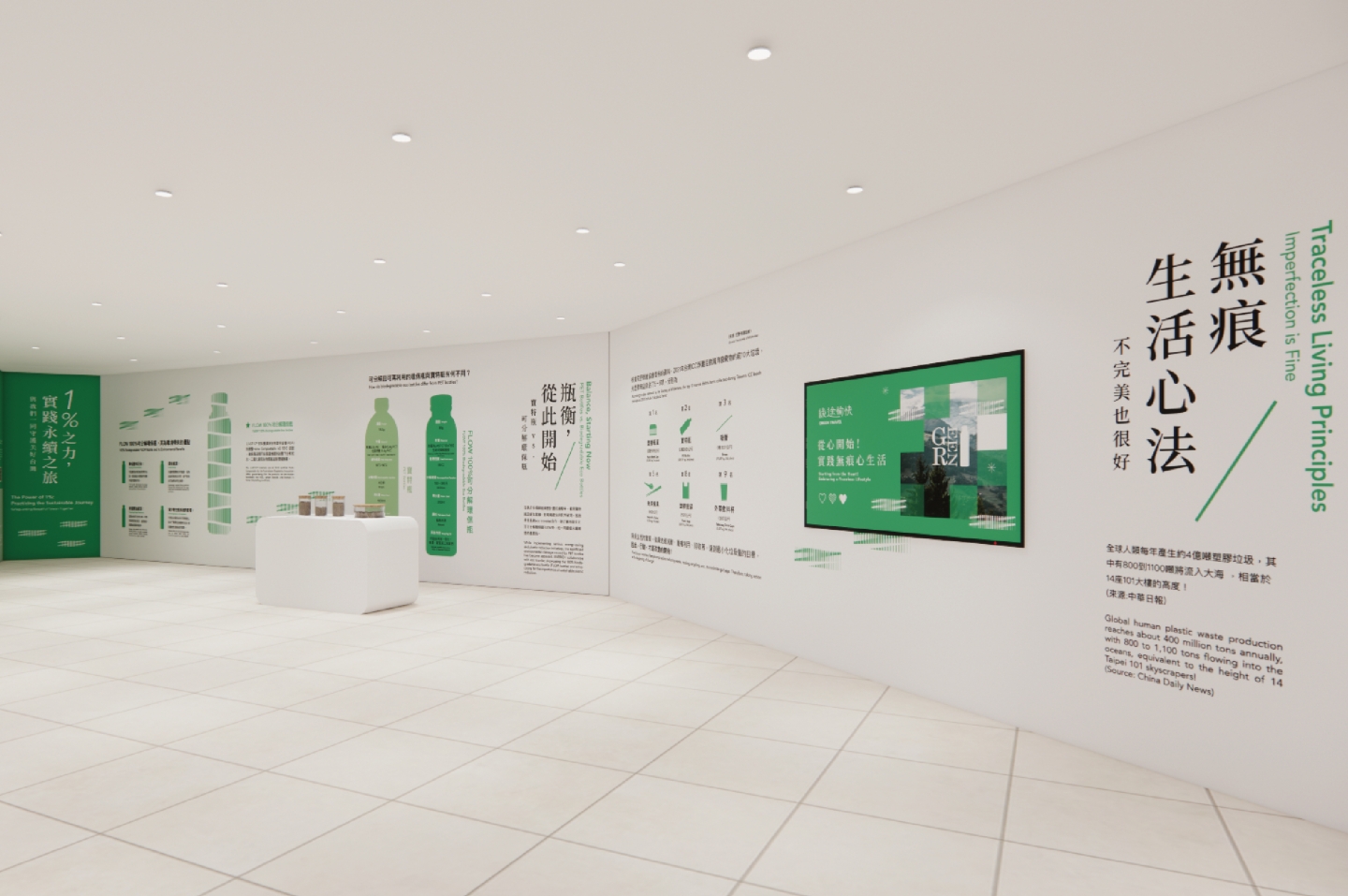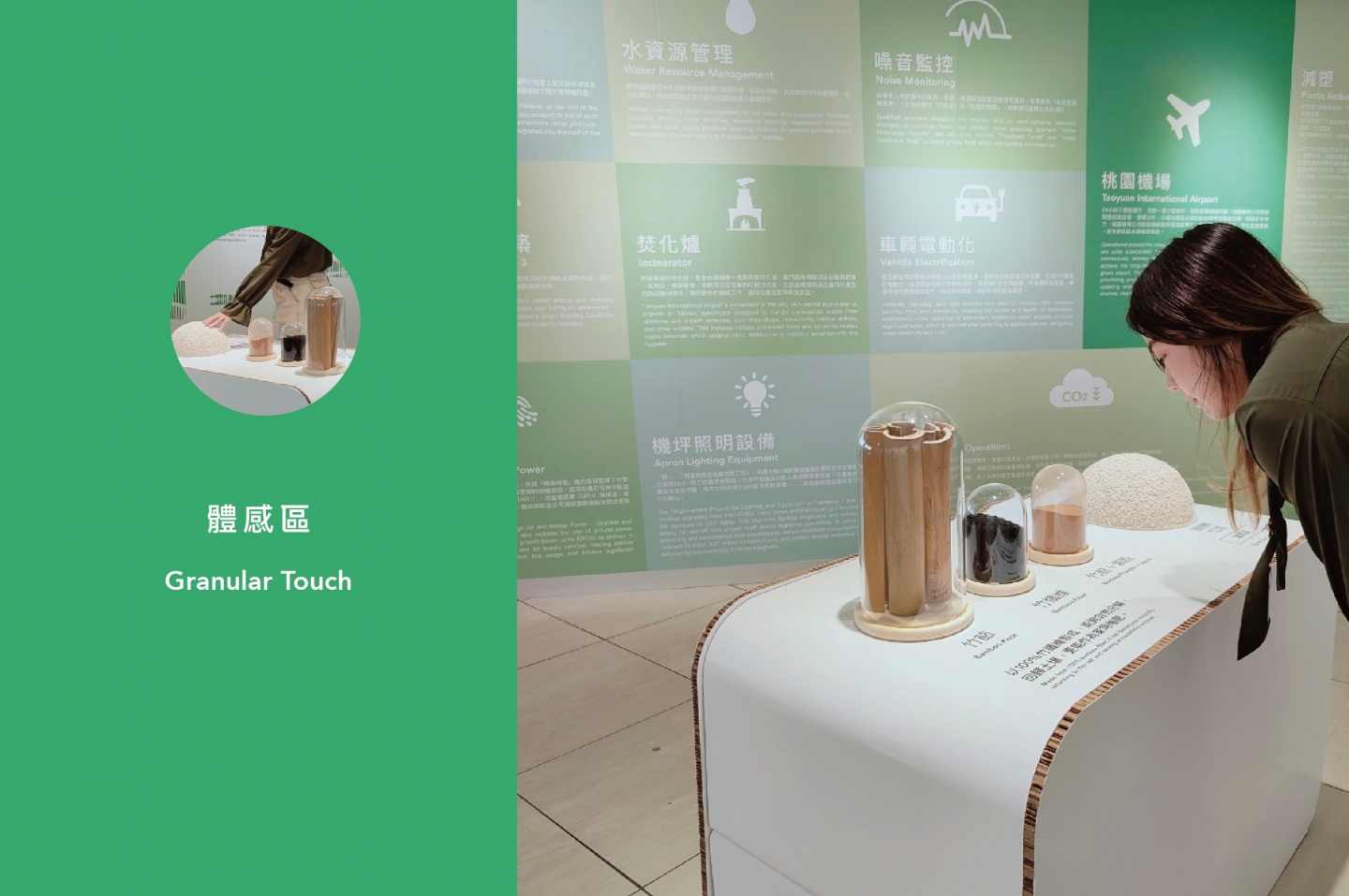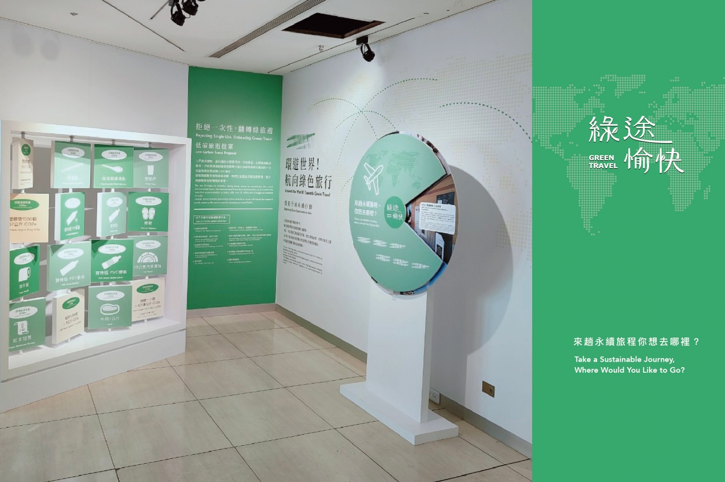 白綠配色創造出空間視覺通透感,以重點色使參觀旅客留下深刻印象,並加以使用互動裝飾,讓旅客了解永續觀光與環保的重要性。