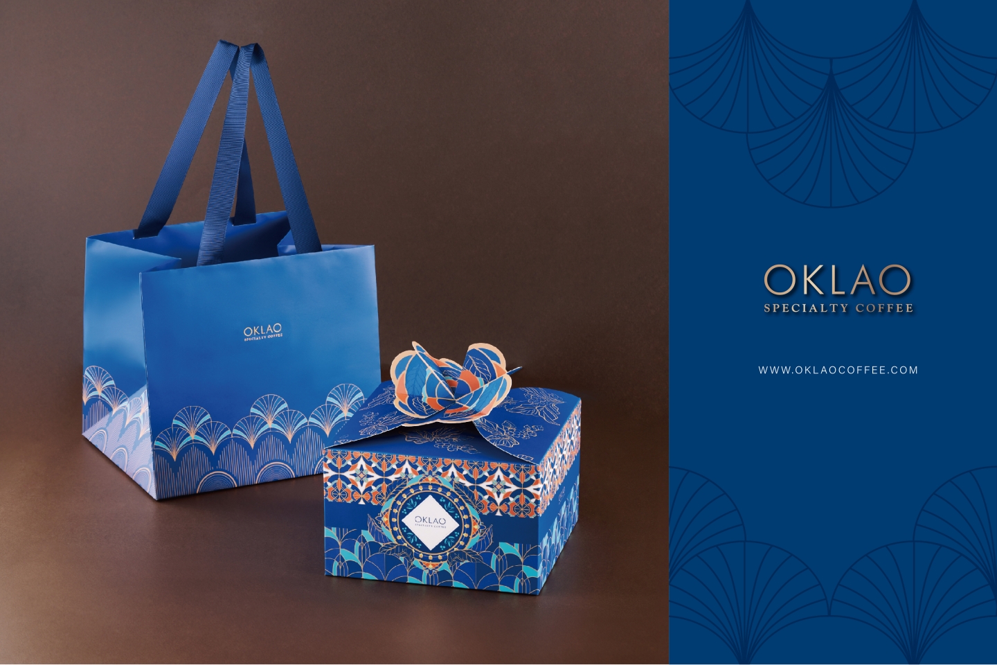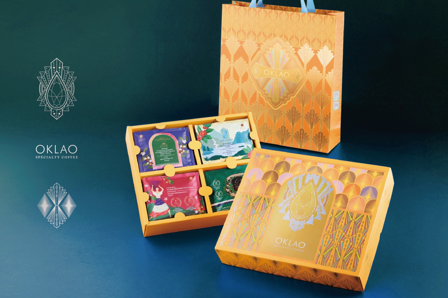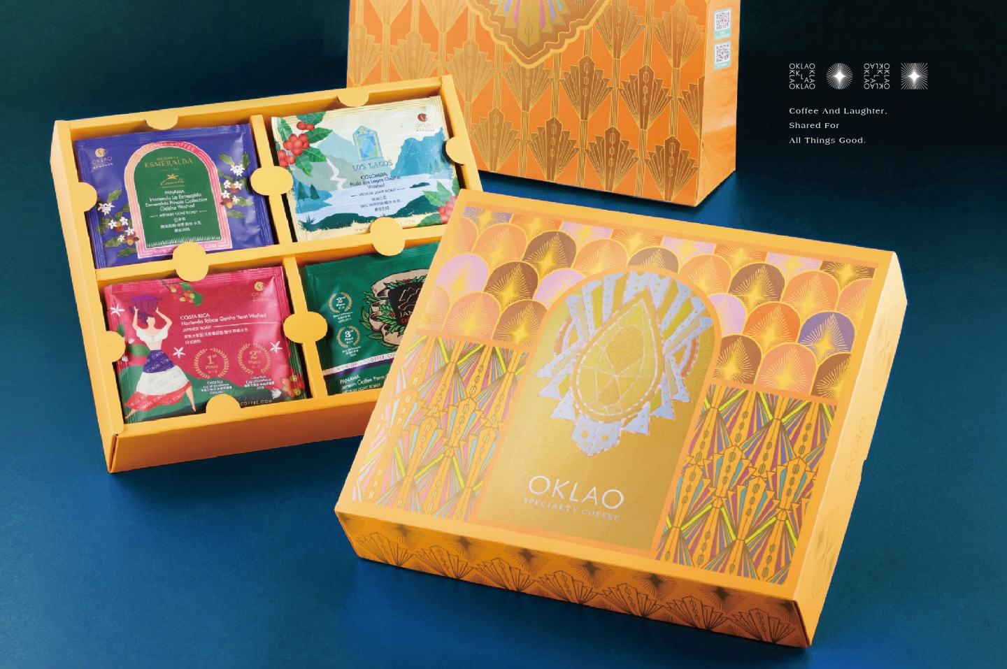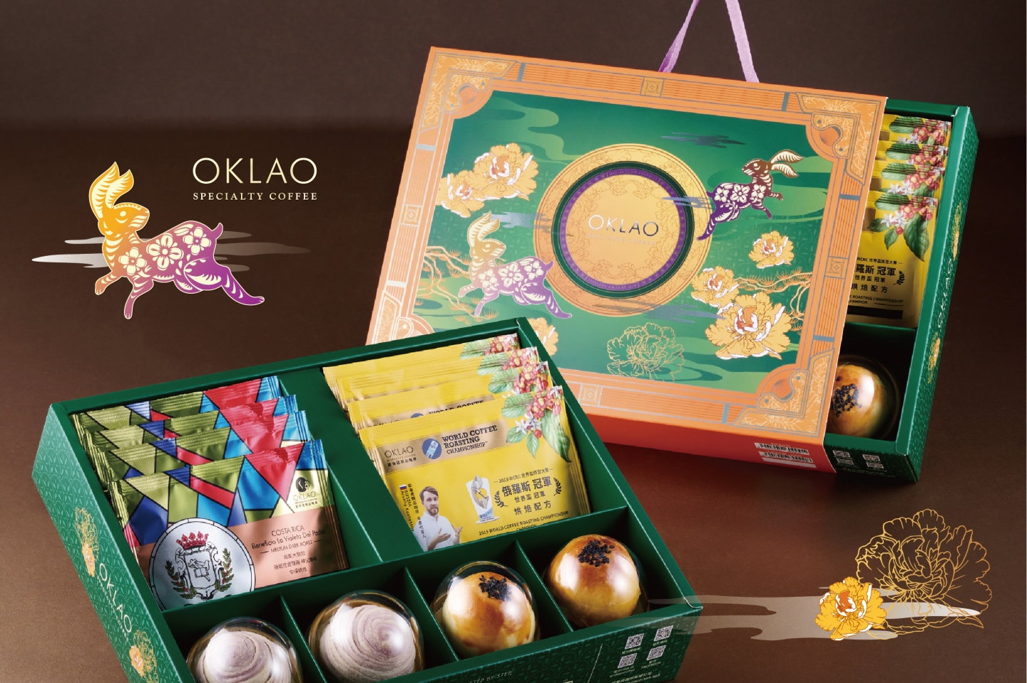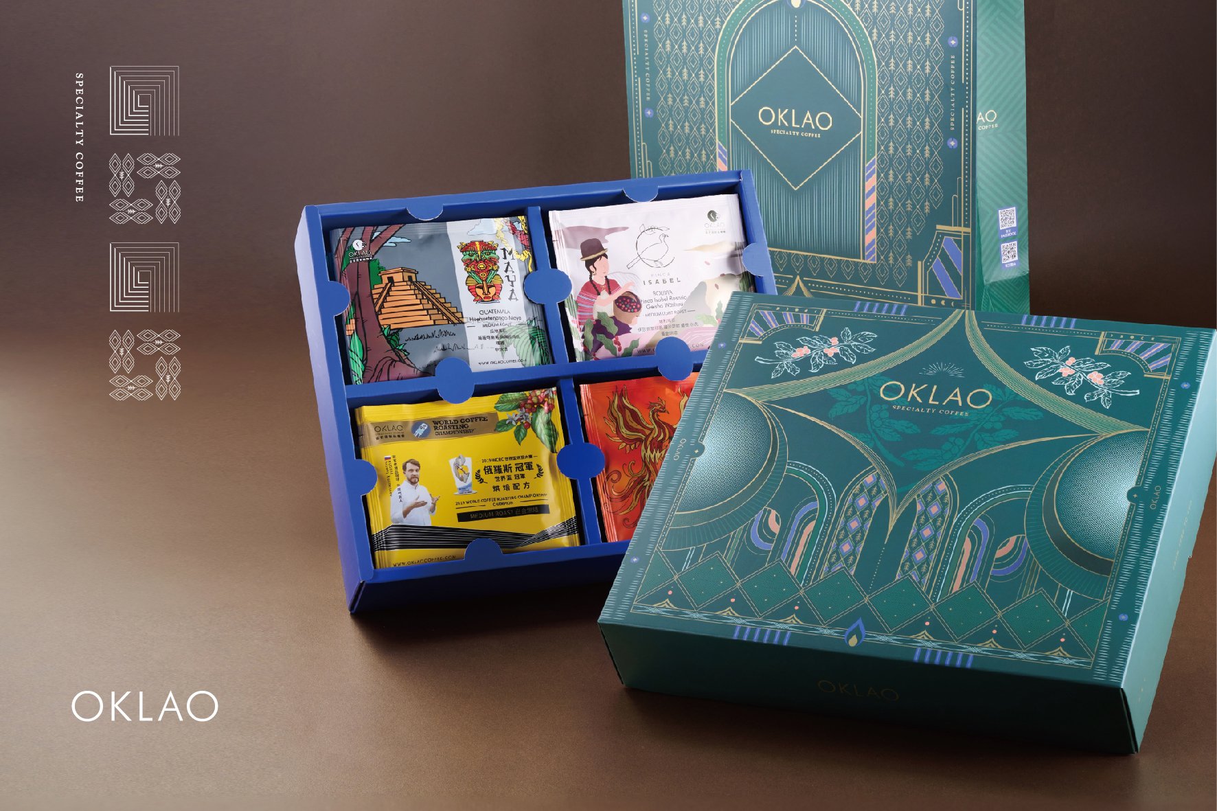 【典藏】禮盒 以咖啡葉、咖啡果實、咖啡豆,搭配月暈設計,呼應中秋節意象,以菱形為主要設計視覺,作出不同變化,跳脫常規金黃色,選用綠色搭配藍紫色系 打造一個綠意中秋夕