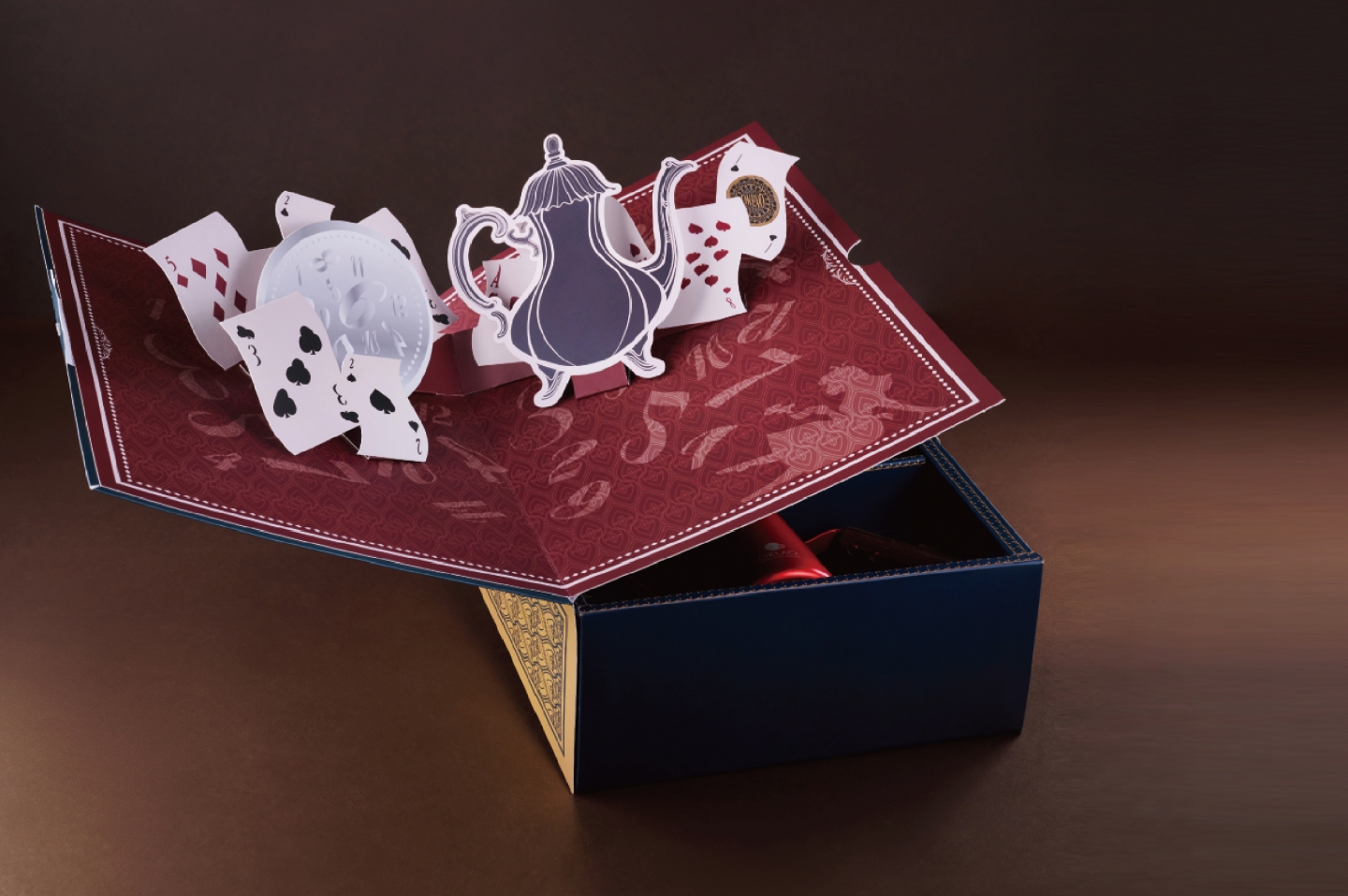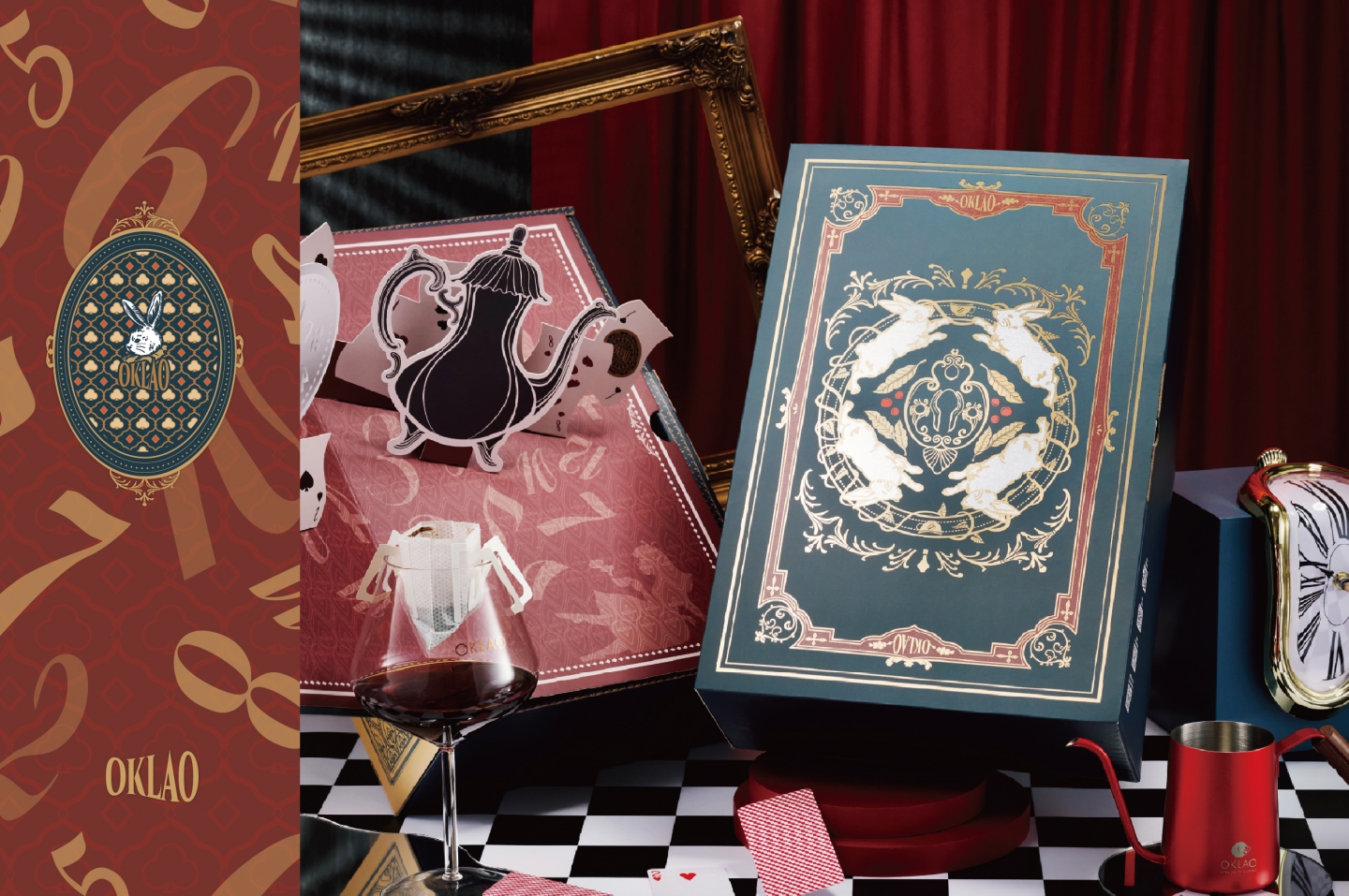 【愛麗絲的咖啡故事】 以愛麗絲夢遊仙境為靈感,融合奇幻世界的裝飾藝術,封面以鑰匙孔設計,象徵通往夢境入口,開啟後各種元素皆立體矗立,就像愛麗絲經過重重關卡最後到達時間兔子先生的下午茶盛宴