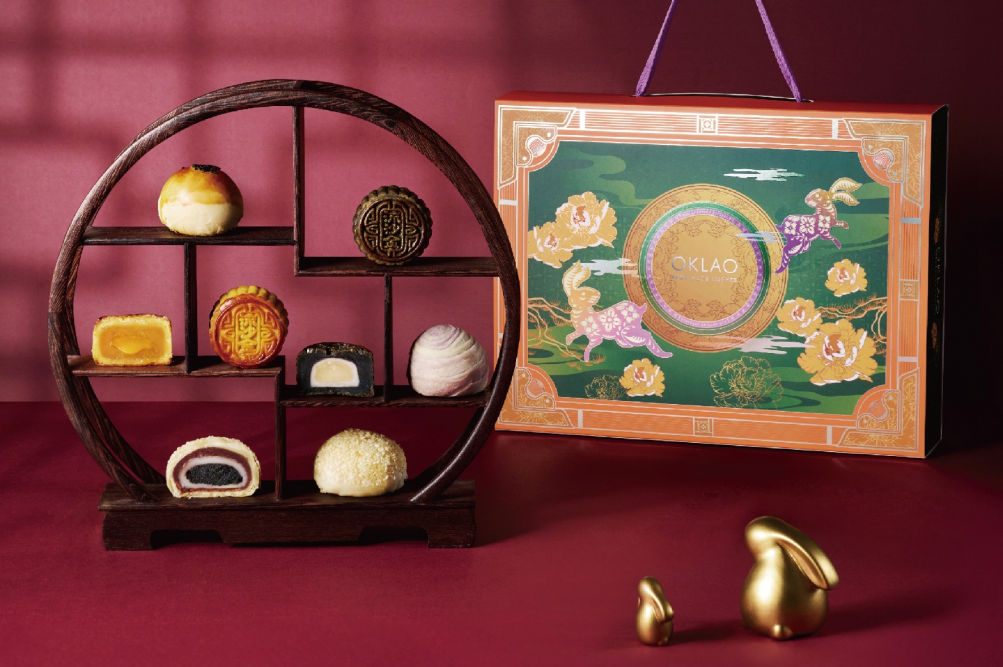 【中秋月餅精品掛耳組】 以金黃色代表著秋月的金黃滿月 搭配著帶著花朵圖式的玉兔奔月 四周以牡丹插畫代表著富貴榮華