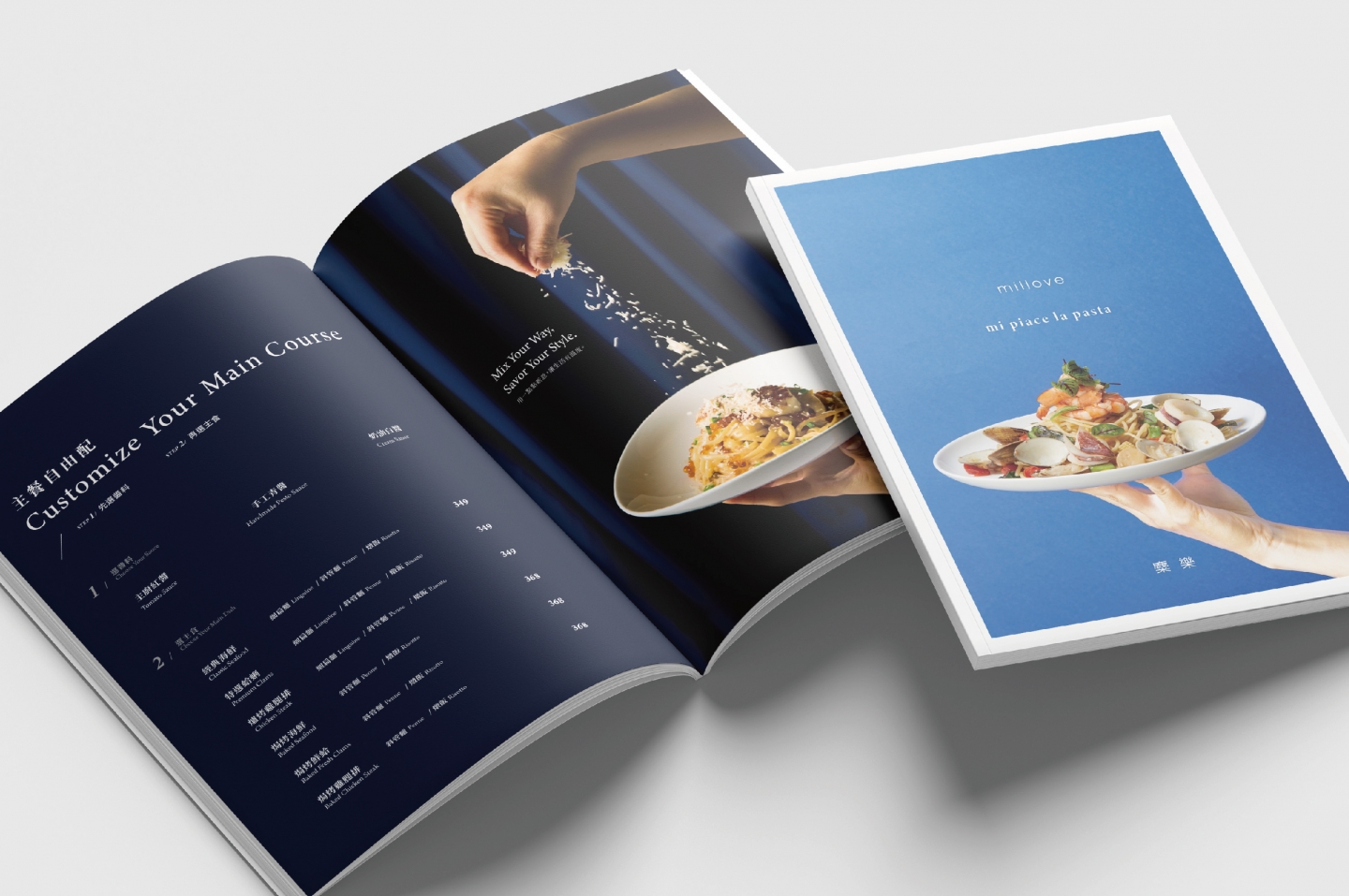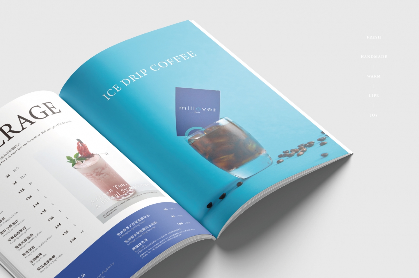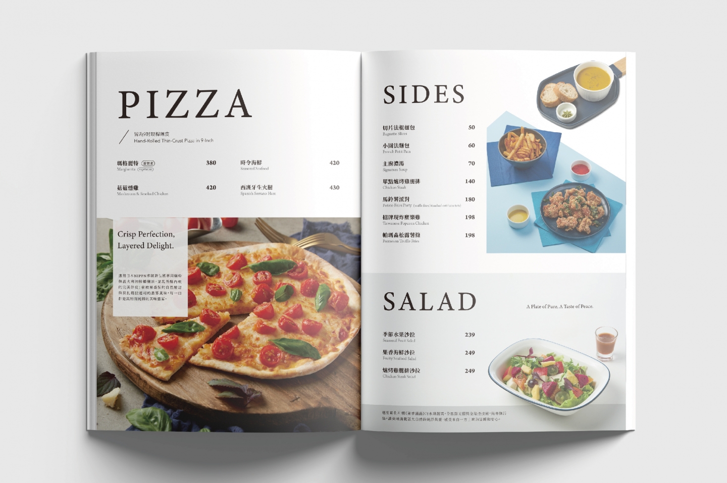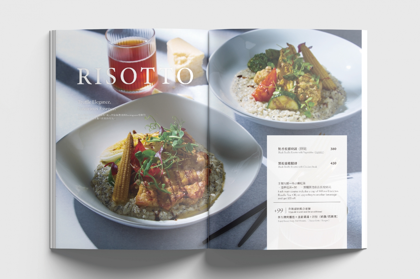 整體設計採用現代雜誌質感作為視覺主軸,運用極簡卻沈穩的排版配置,讓菜單成為形象刊物,翻開的每一頁,都能感受到品牌與日常的連結與精緻內涵;淋膜紙則選用簡約而有生活感的手寫字,提升每一道料理的視覺細節,猶如在柔光中被細膩對待。