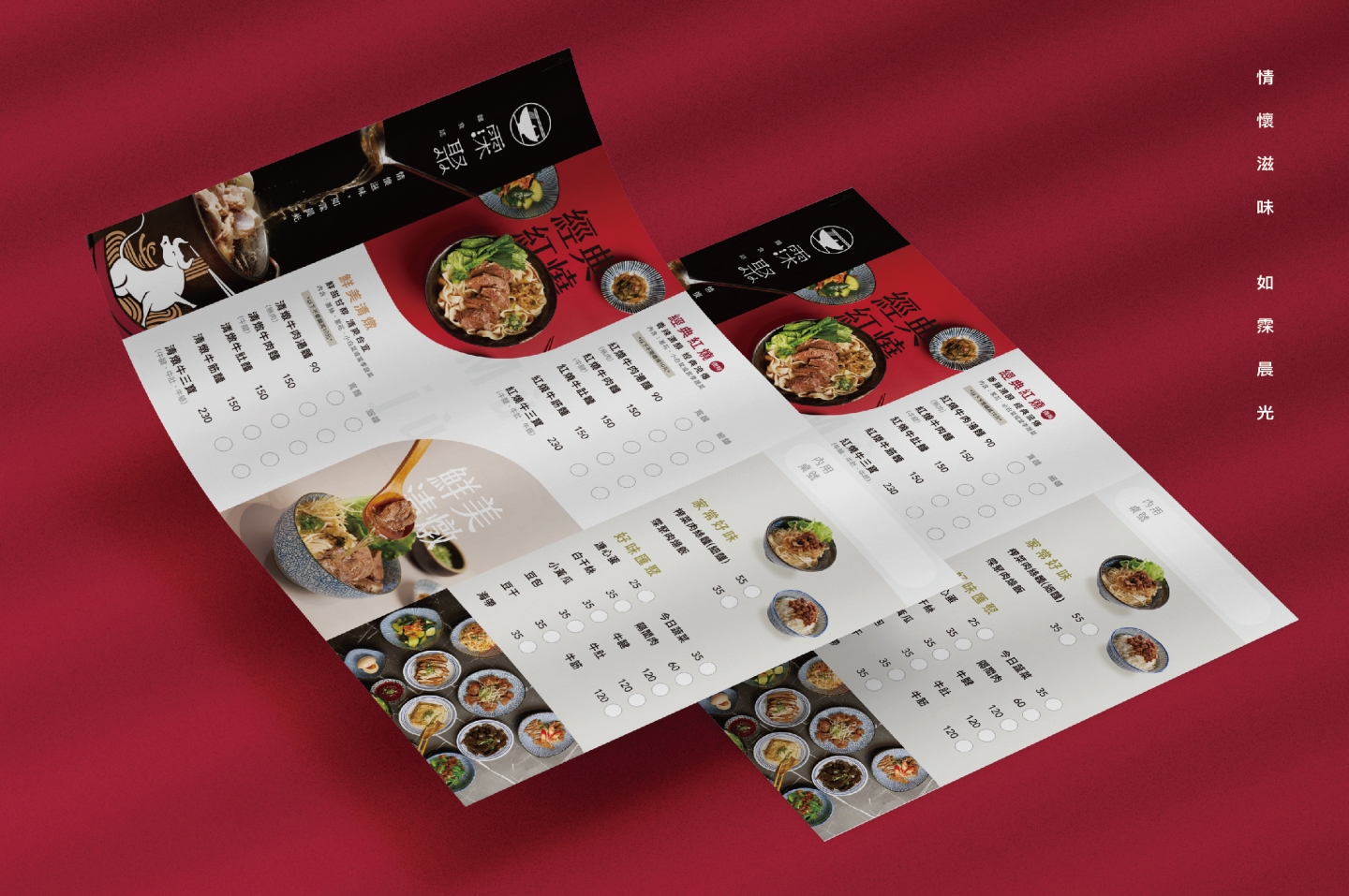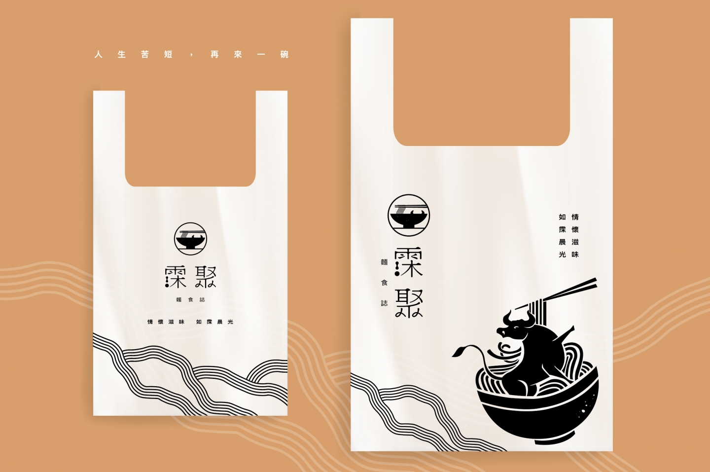 以圓潤的筆法繪製, 如湯頭溫潤鮮甜, 麵體的Q勁融入設計, 落款「牛」, 帶入產品核心。 Logo以圓形作為基型, 象徵蘊含整碗精華呈現給消費者。。