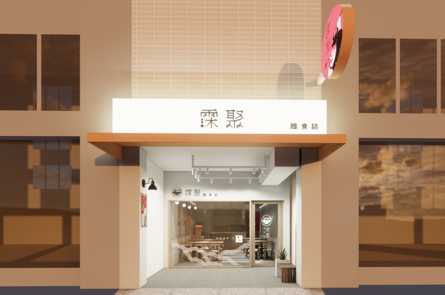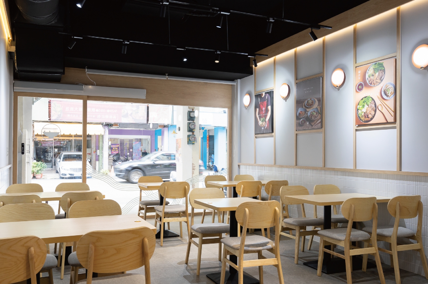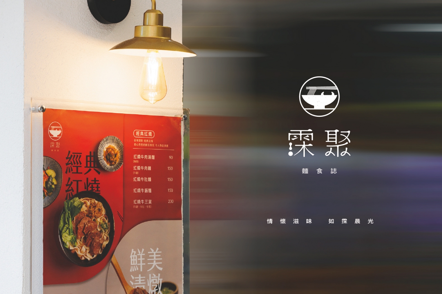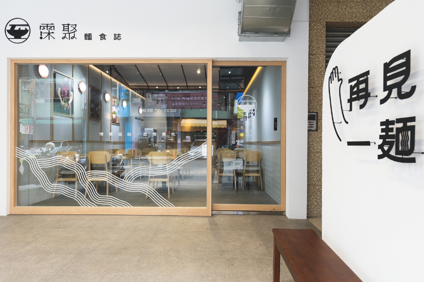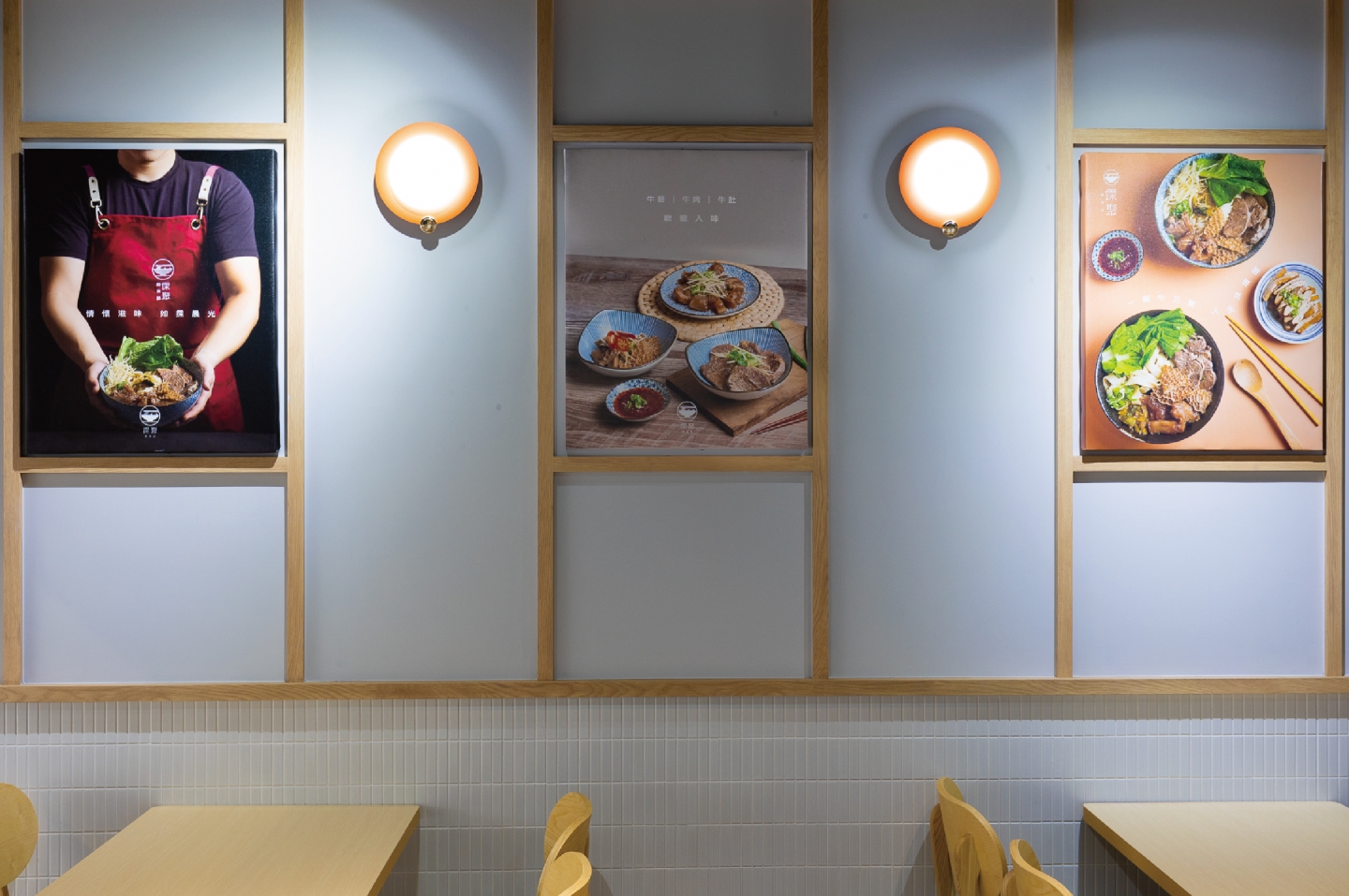 空間整體以灰白色搭配木頭, 帶出溫度感, 猶如牛肉麵般溫醇又暖心。 木頭裝潢與壁燈打造空間層次感, 牆面加上標語燈箱, 加強品牌印象外,