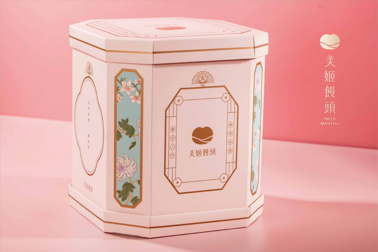 |子母八角大壽桃禮盒 外型選用寓意吉祥如意的八角造型 象徵永恆的8與發展順利的「發」字音 搭配粉色系主色與柔滑綢緞緞帶,傳遞出溫柔祝福與滿滿心意。