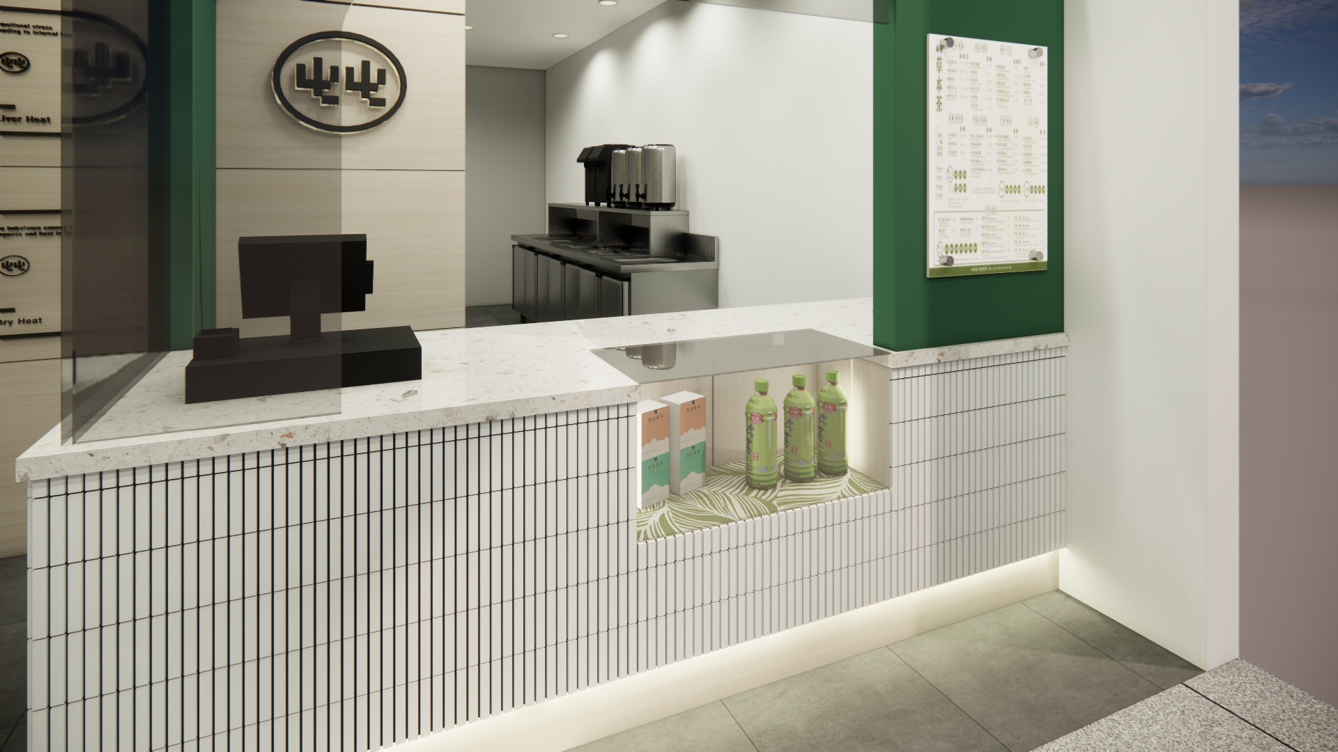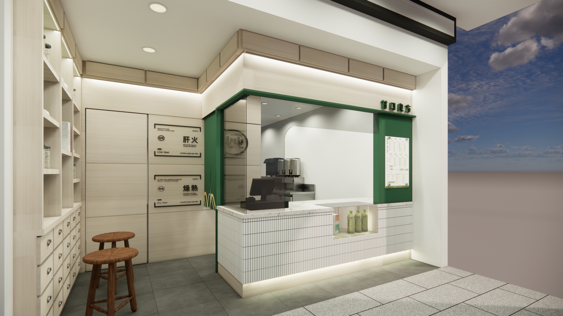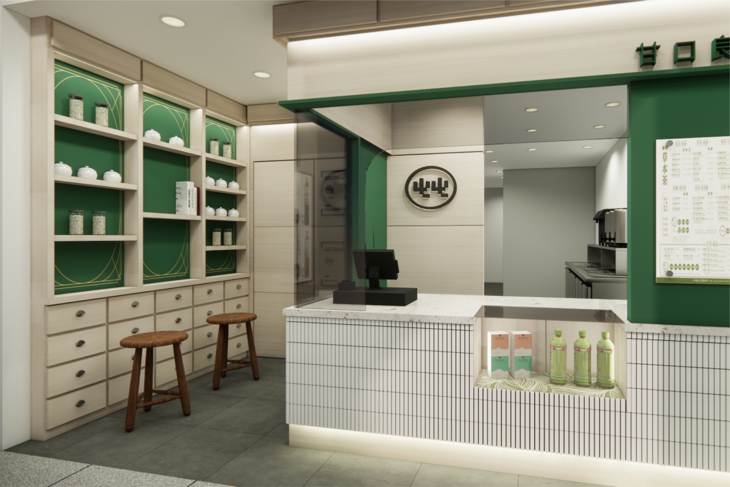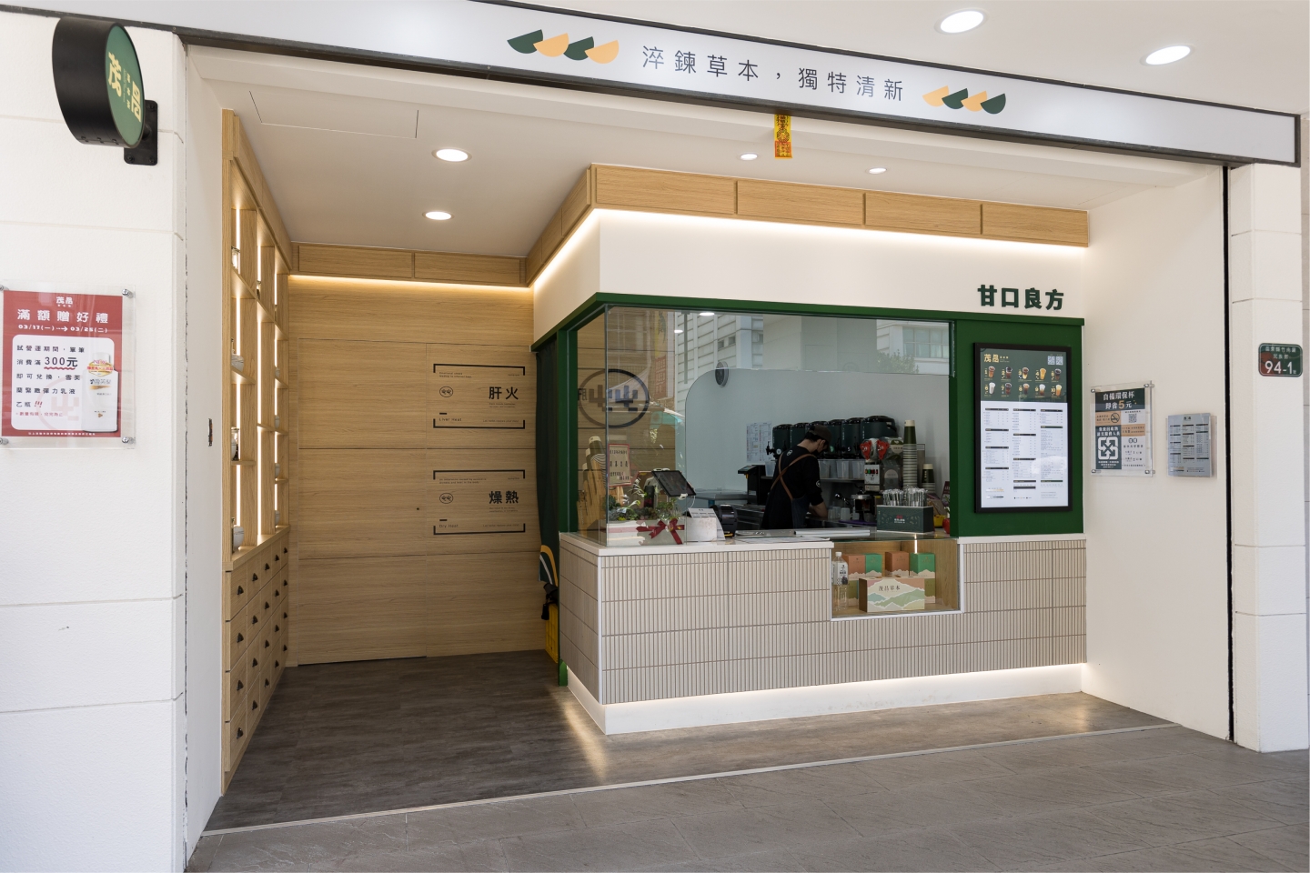 空間設計 整體空間以草本綠搭配溫潤木質調作為基底,營造自然清新的療癒感 櫃台選用純白馬賽克小磁磚打造 搭配玻璃展示窗,呈現簡潔明亮的視覺印象 左側牆面以復古百子櫃設計為靈感 打造出品牌專屬的展示區,蘊含濃厚的東方草本文化氛圍 店內牆面則點綴以中藥處方籤圖樣 低調傳遞品牌根基,既富文化氣息,又不失現代感。