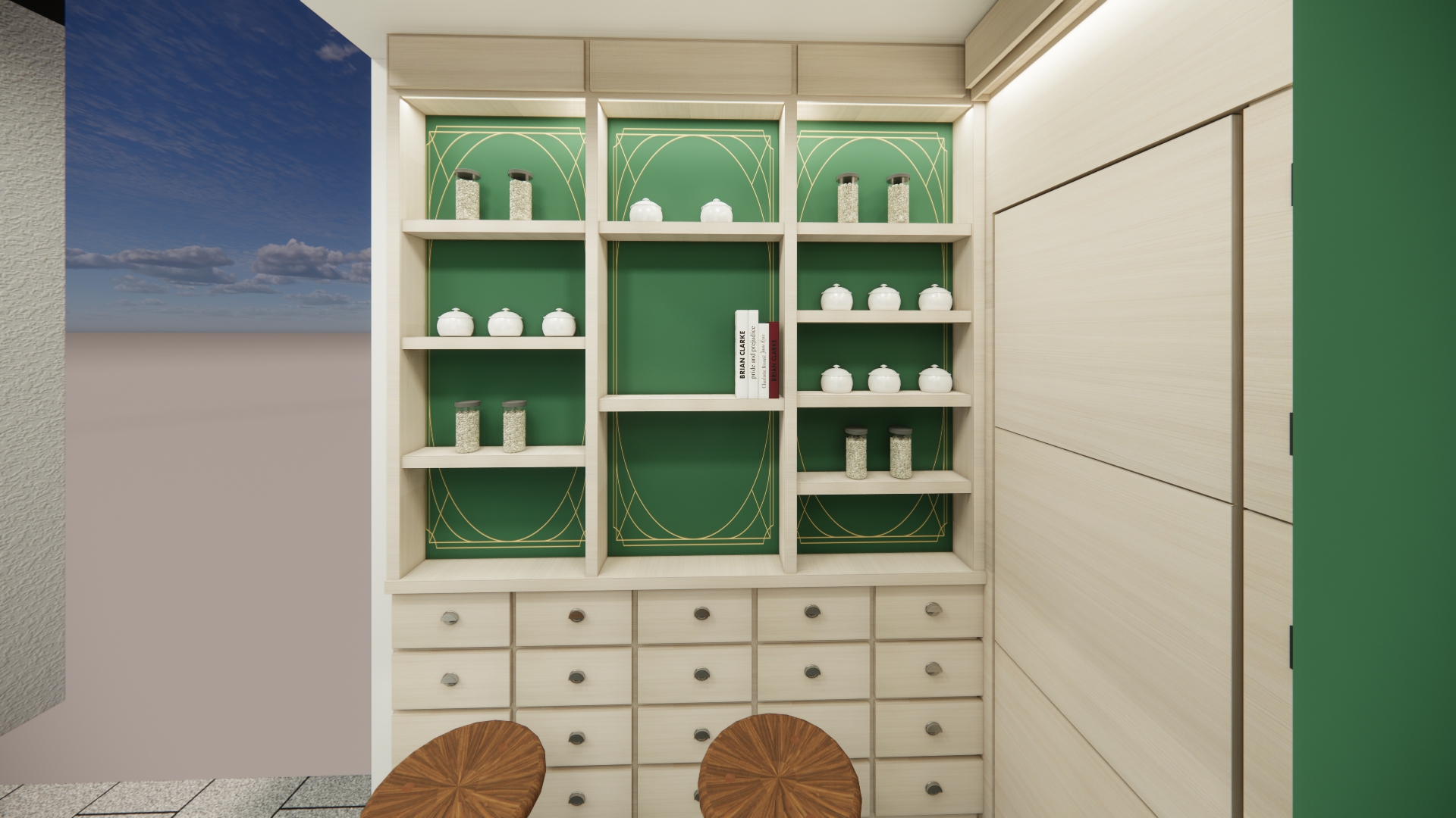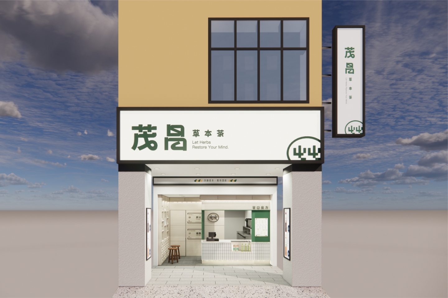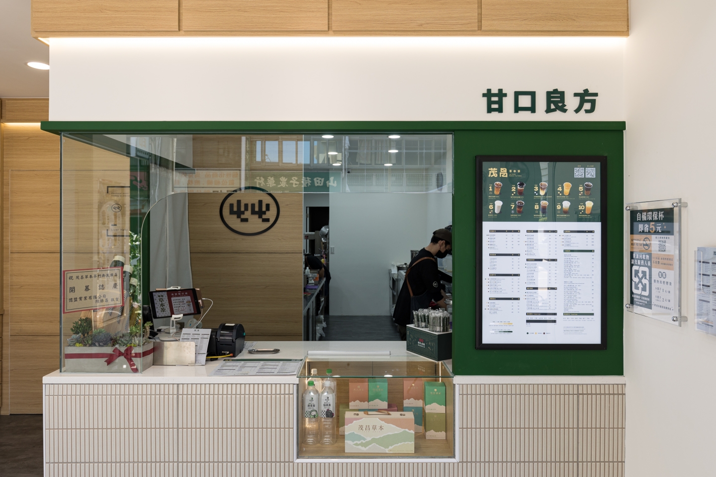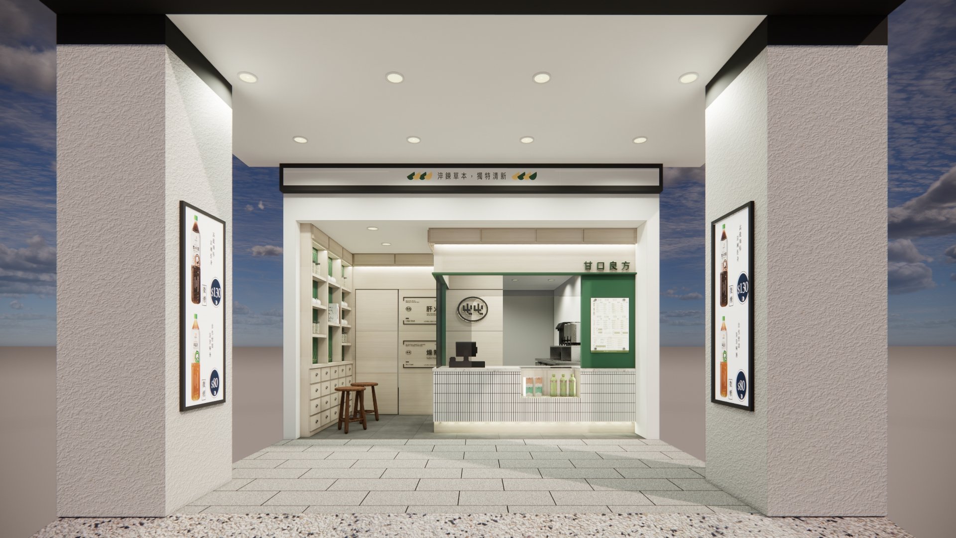 空間設計 整體空間以草本綠搭配溫潤木質調作為基底,營造自然清新的療癒感 櫃台選用純白馬賽克小磁磚打造 搭配玻璃展示窗,呈現簡潔明亮的視覺印象 左側牆面以復古百子櫃設計為靈感 打造出品牌專屬的展示區,蘊含濃厚的東方草本文化氛圍 店內牆面則點綴以中藥處方籤圖樣 低調傳遞品牌根基,既富文化氣息,又不失現代感。