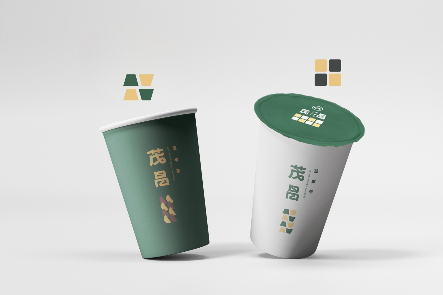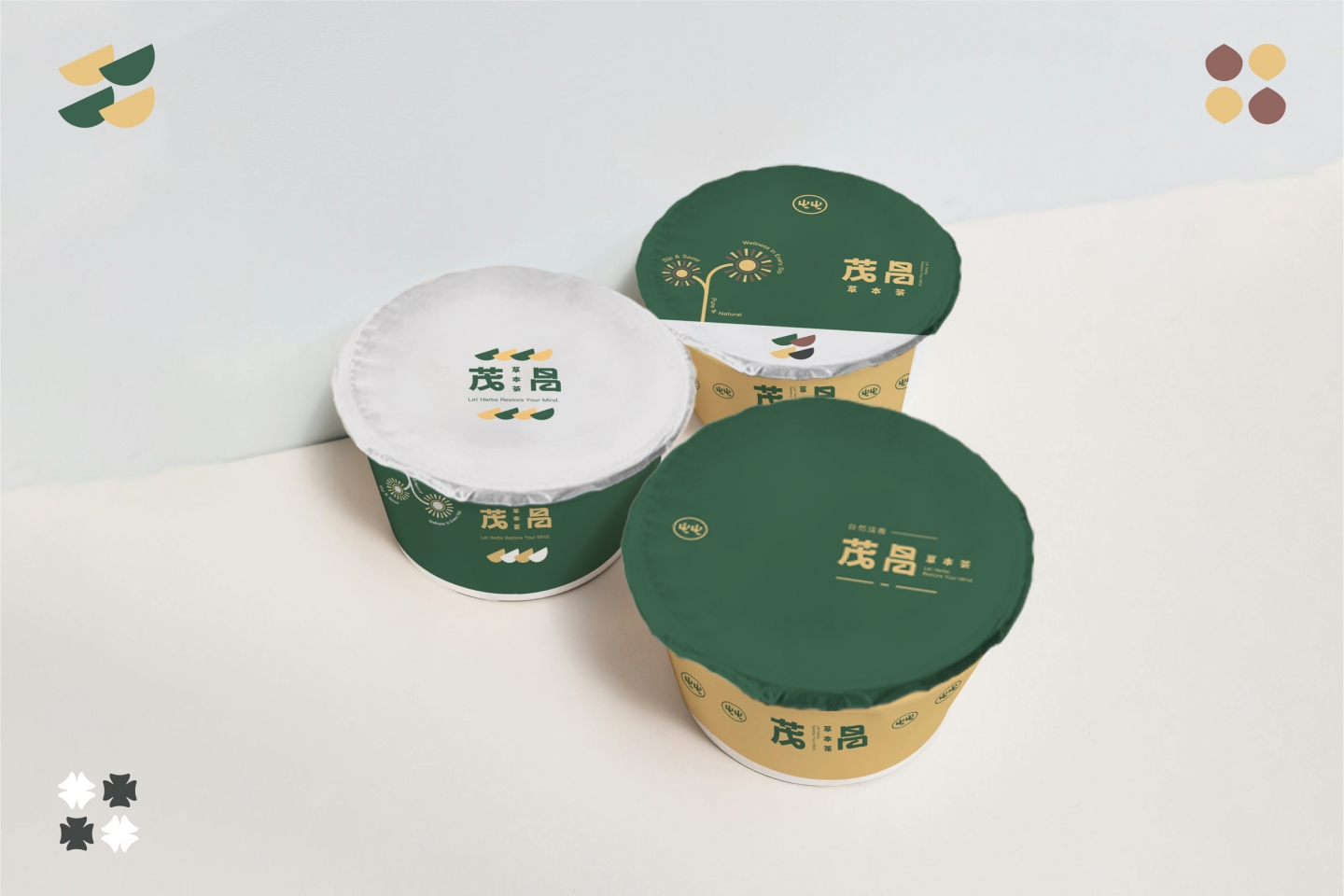 LOGO設計 品牌標誌以厚實的黑體字為基底 展現專業與穩定性,並透過轉角處的自然圓弧 注入一絲手繪質感,傳遞出品牌親切而溫潤的調性 整體設計簡約而不失格調,呼應現代人追求健康自然的生活步調 輔助圖形則以色塊幾何元素呈現 象徵飲品中多樣草本原料的堆疊與組合,增添識別的趣味性與層次感