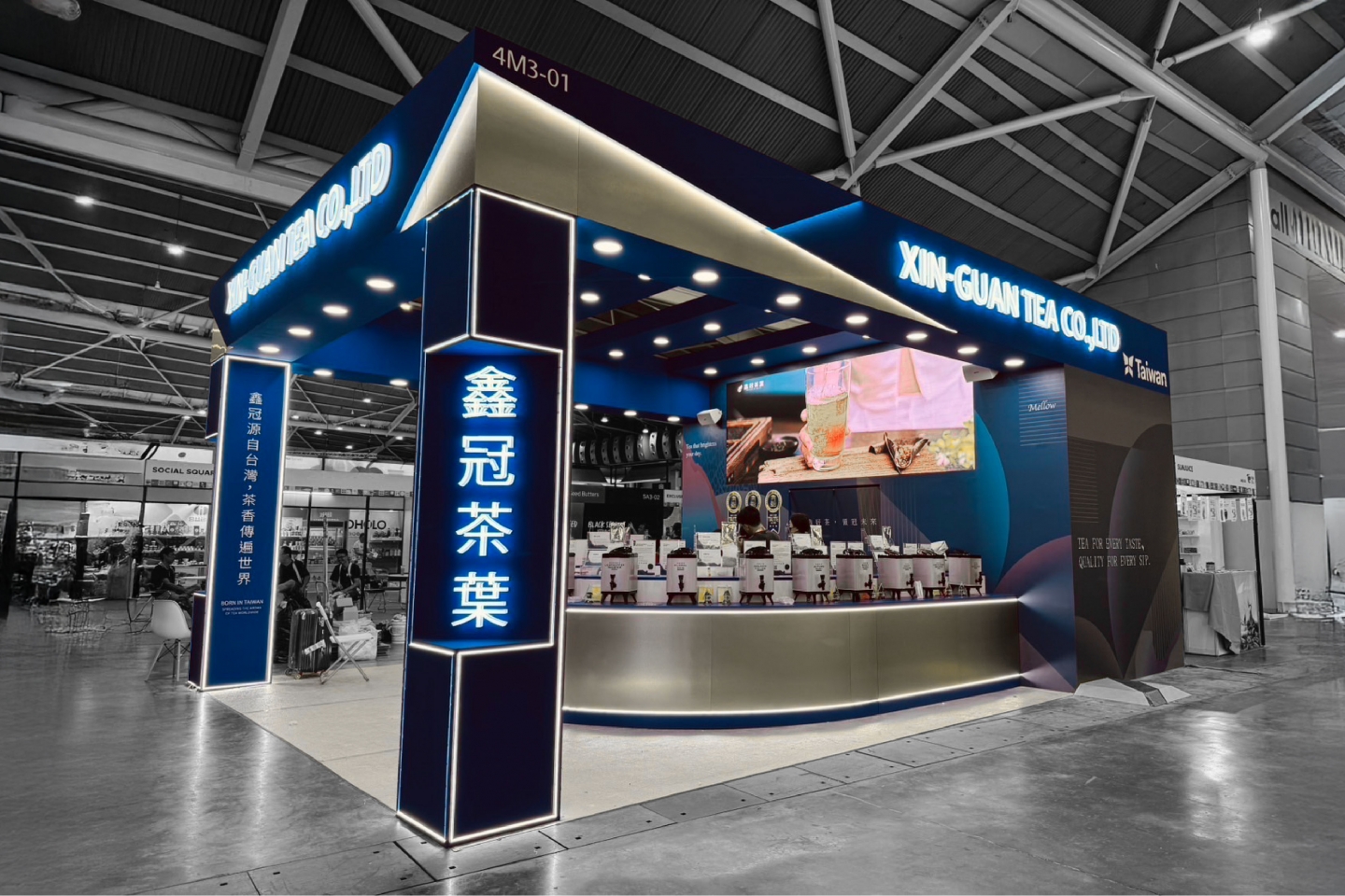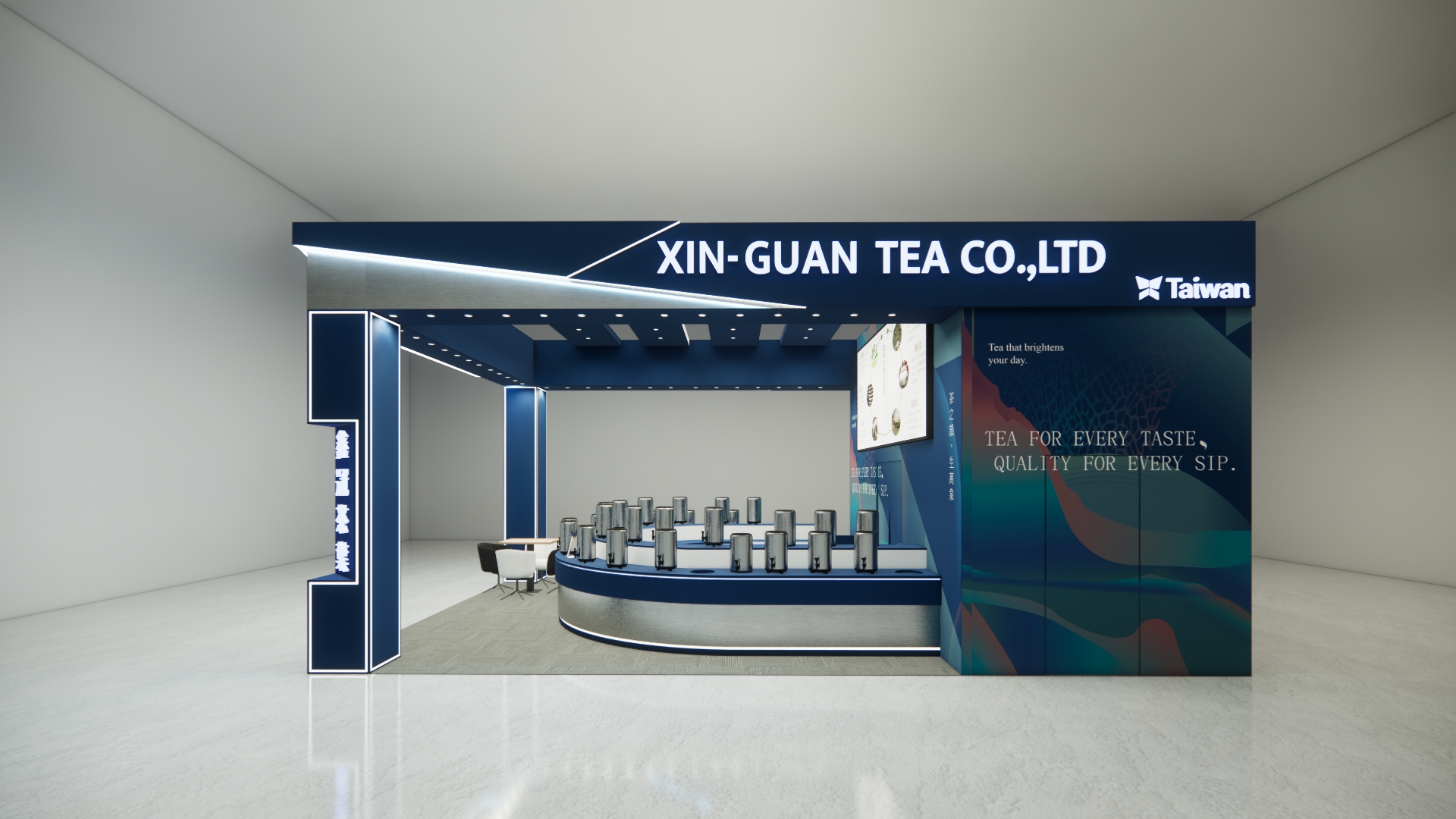 此次為「鑫冠茶葉」新加坡國際食品飲料展設計主視覺 以”智造好茶,領冠未來”為主題設計 深藍為主調,象徵穩重與專業 搭配不鏽鋼金屬質感與燈條點綴 營造出科技與傳統交融的品牌形象。 攤位線條俐落,開放式格局讓動線流暢,便於參觀與洽談