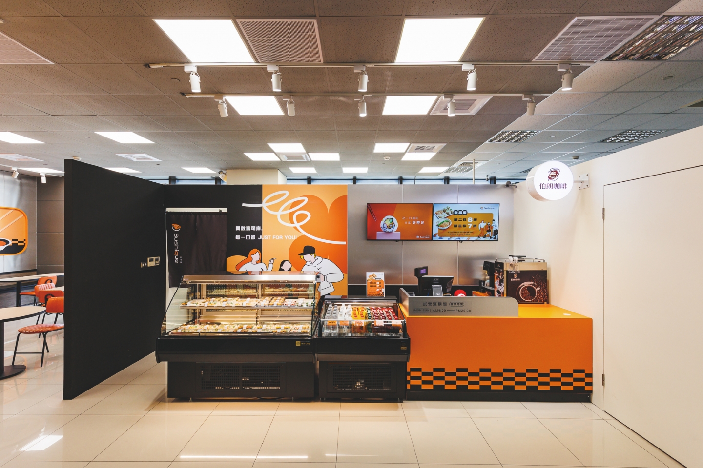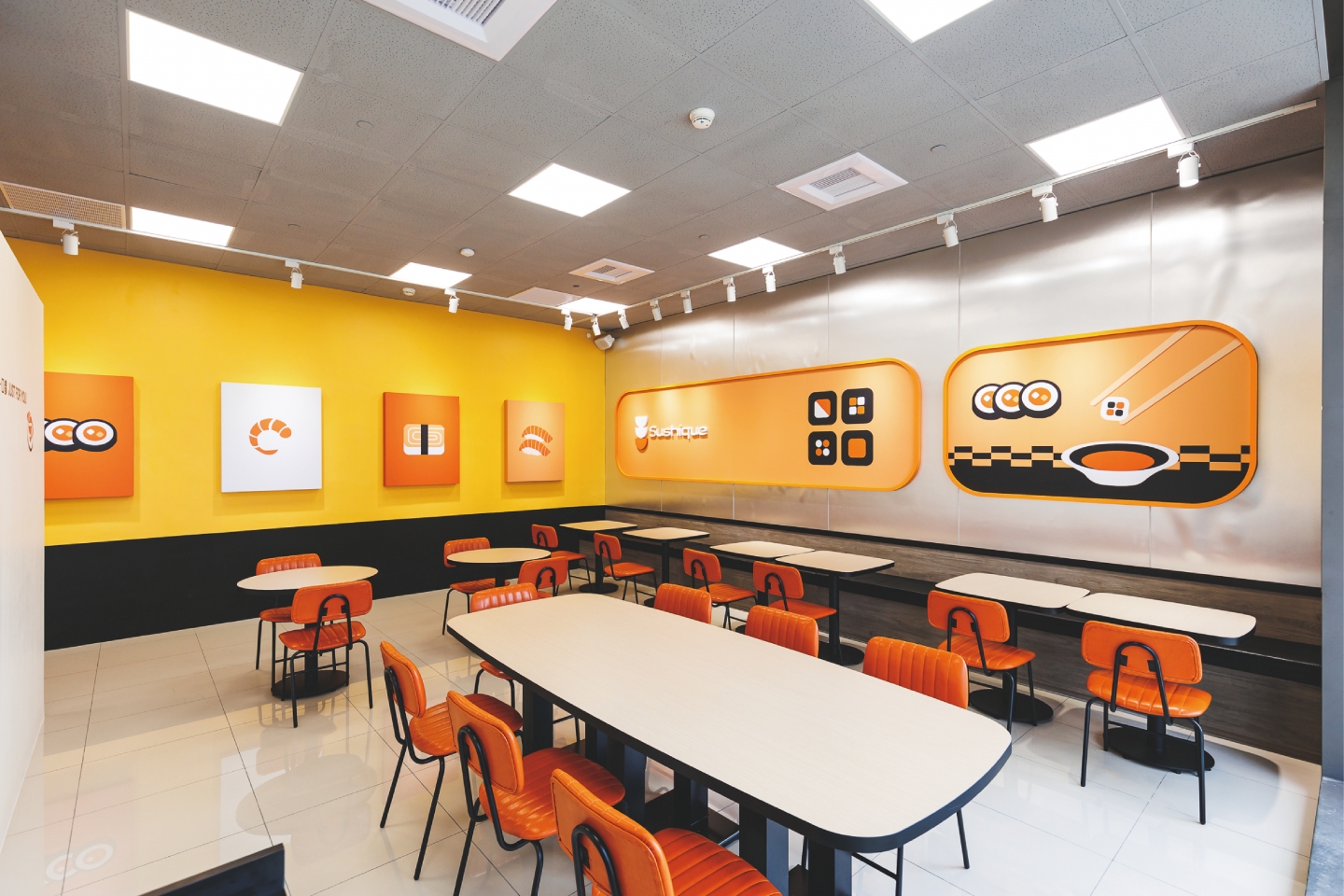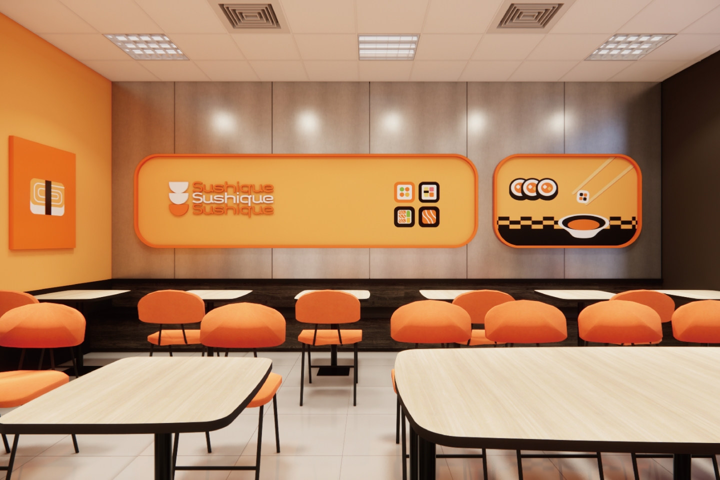 🏙 空間視覺設計 延續品牌橘色主色,打造搶眼又溫暖的外帶櫃檯, 牆面一側運用大圖輸出+立體阿蘭諾設計, 呈現壽司主題的視覺延伸,使空間更具層次與吸睛效果。 另一面牆則選用四幅無框畫,以品牌主視覺與壽司意象串聯, 簡潔有力,增添現代感與設計氛圍。