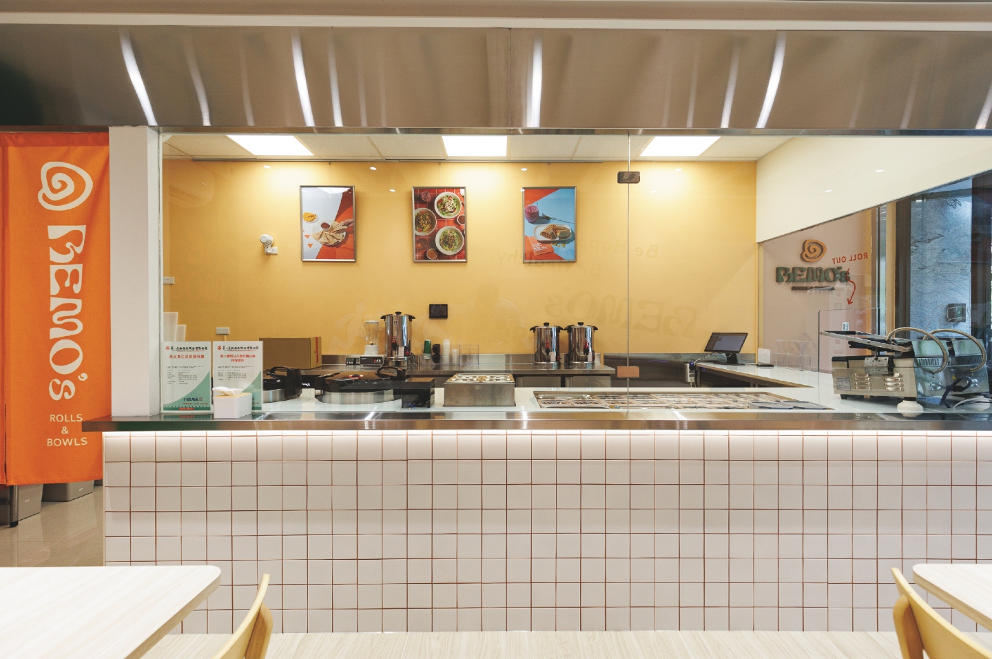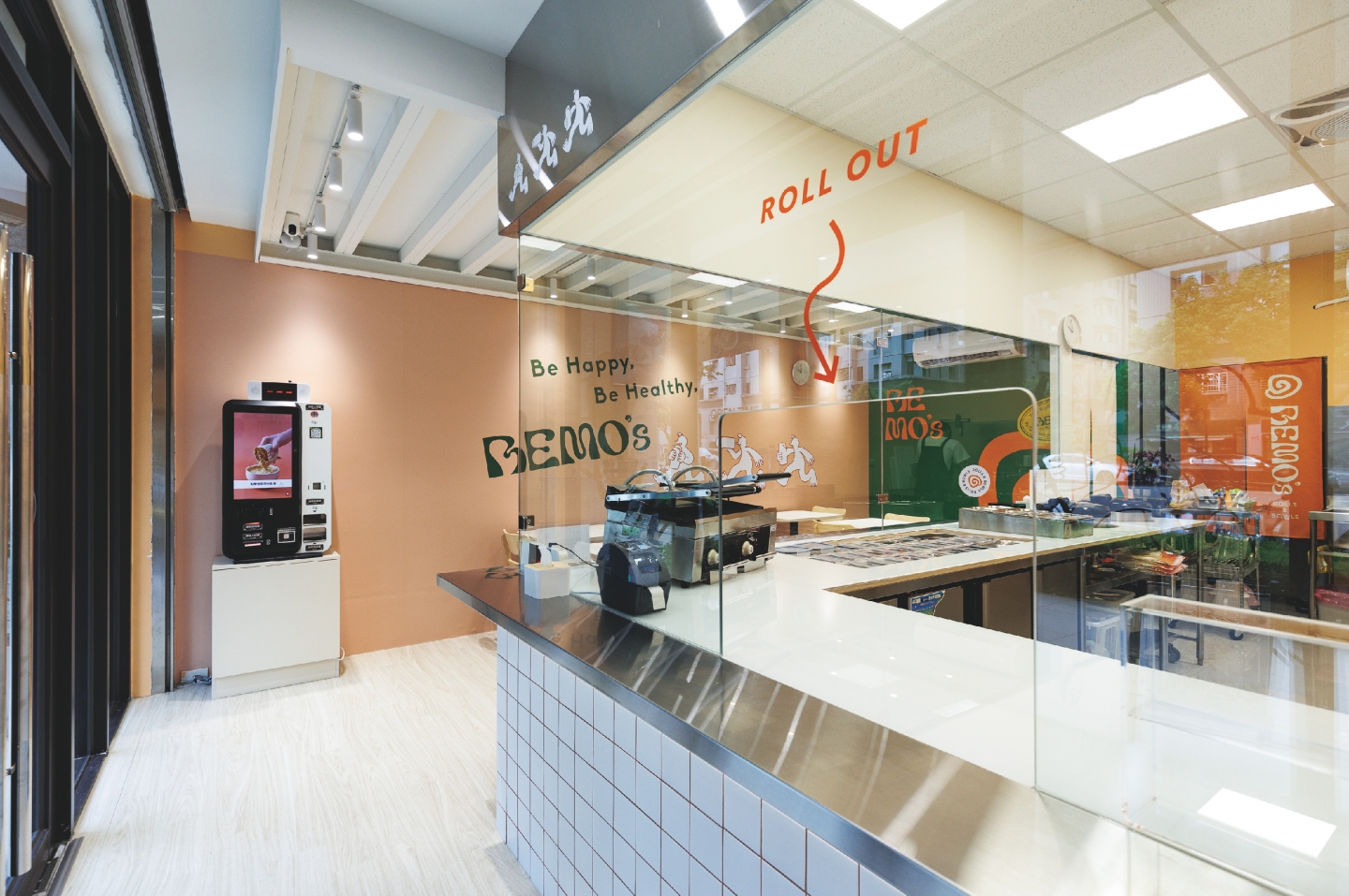 空間設計以搶眼的品牌色延伸,搭配橘色主櫃與白色磁磚,加上大片玻璃引入自然光,打造出簡約明亮、舒服又具有特色的輕美式環境。