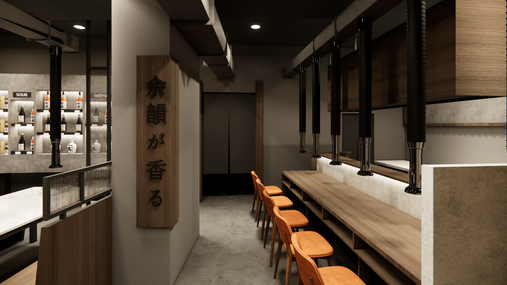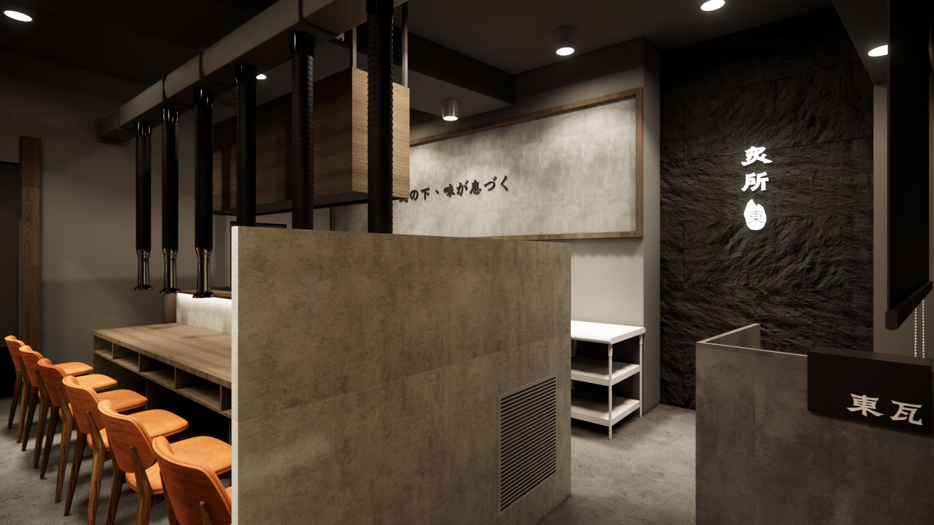 空間設計走現代日式風格,以黑、灰色系搭配石紋、木紋,營造出沉穩內斂的氛圍;並將品牌名稱「瓦」融入空間細節之中,讓設計主題一致,兼具張力與細緻的質感品味。