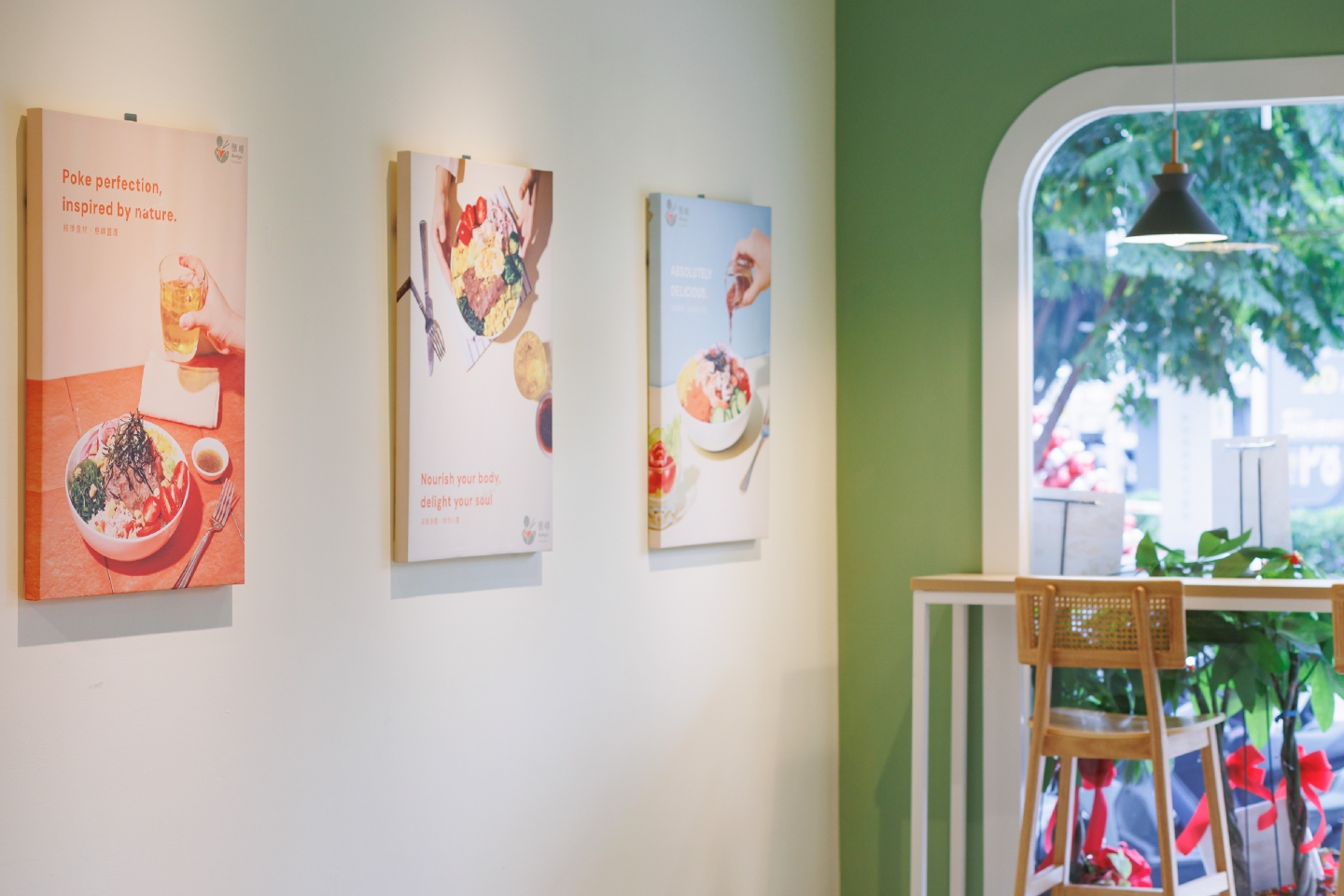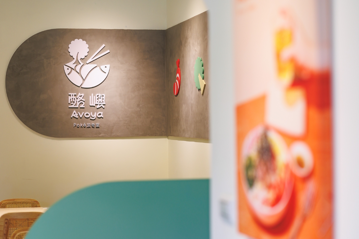 整體空間以 清新綠色與淺木色為基調 搭配溫潤的米白牆面與簡約幾何造型燈具 營造明亮、舒適又不失現代感的用餐氛圍 室內運用弧形與幾何裝飾牆面,搭配植栽與柔和燈光,增添自然愜意的氛圍 此設計不僅呼應 Poké 健康、清新、海島風情的品牌精神 也讓顧客在空間中感受到「輕盈自在的夏威夷島嶼感」。