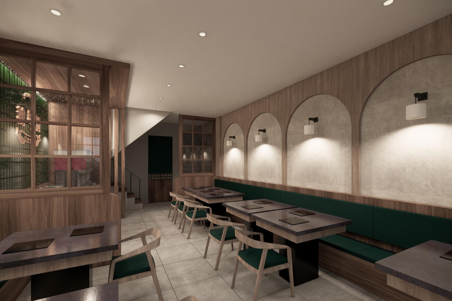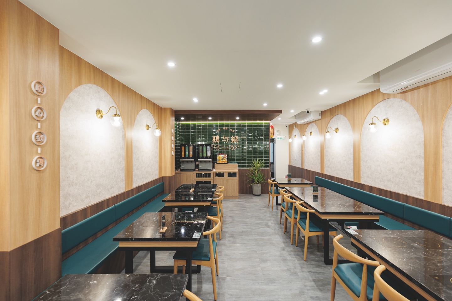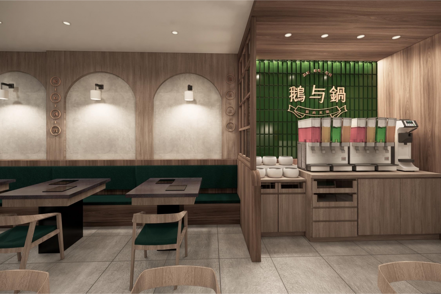 空間設計旨在創造一個復古優雅,舒適放鬆的用餐體驗 將港式茶樓的懷舊情調融入現代火鍋店的機能中 以現代輕復古,融合港式窗花與木質元素 大量使用淺色/暖色木皮、深綠色亮面磁磚 淺灰/米白色水磨石地磚或仿石材牆面 木材的溫潤感與深綠色的沉穩形成對比,強化了復古氛圍 飲料與醬料區以深綠色亮面長條磁磚作為背景牆 並在上方設置立體金屬 Logo,使此區域成為空間的視覺焦點 招牌採用墨綠色底搭配暖白光霓虹燈風格的 Logo 呈現 強烈的視覺對比讓招牌在夜間具有高辨識度,呼應懷舊港式風格