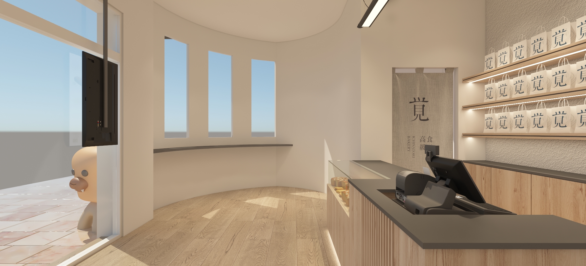 一覺吐司外牆以圓弧形設計,配上同為圓弧形的玻璃窗面,將日本現代和風建築及洋風建築融合;牆面使用白磚瓦,讓整體視覺不再單調。