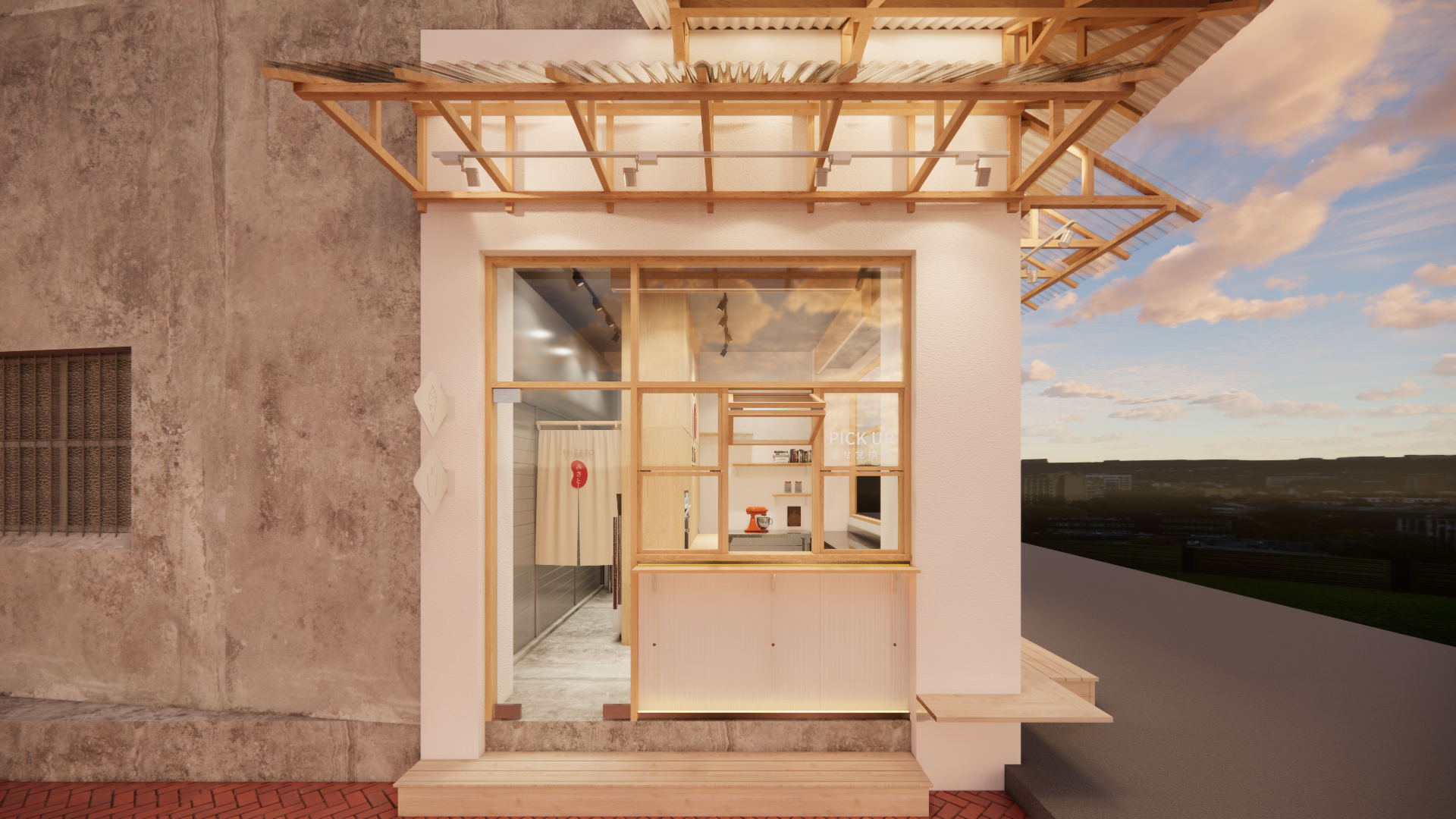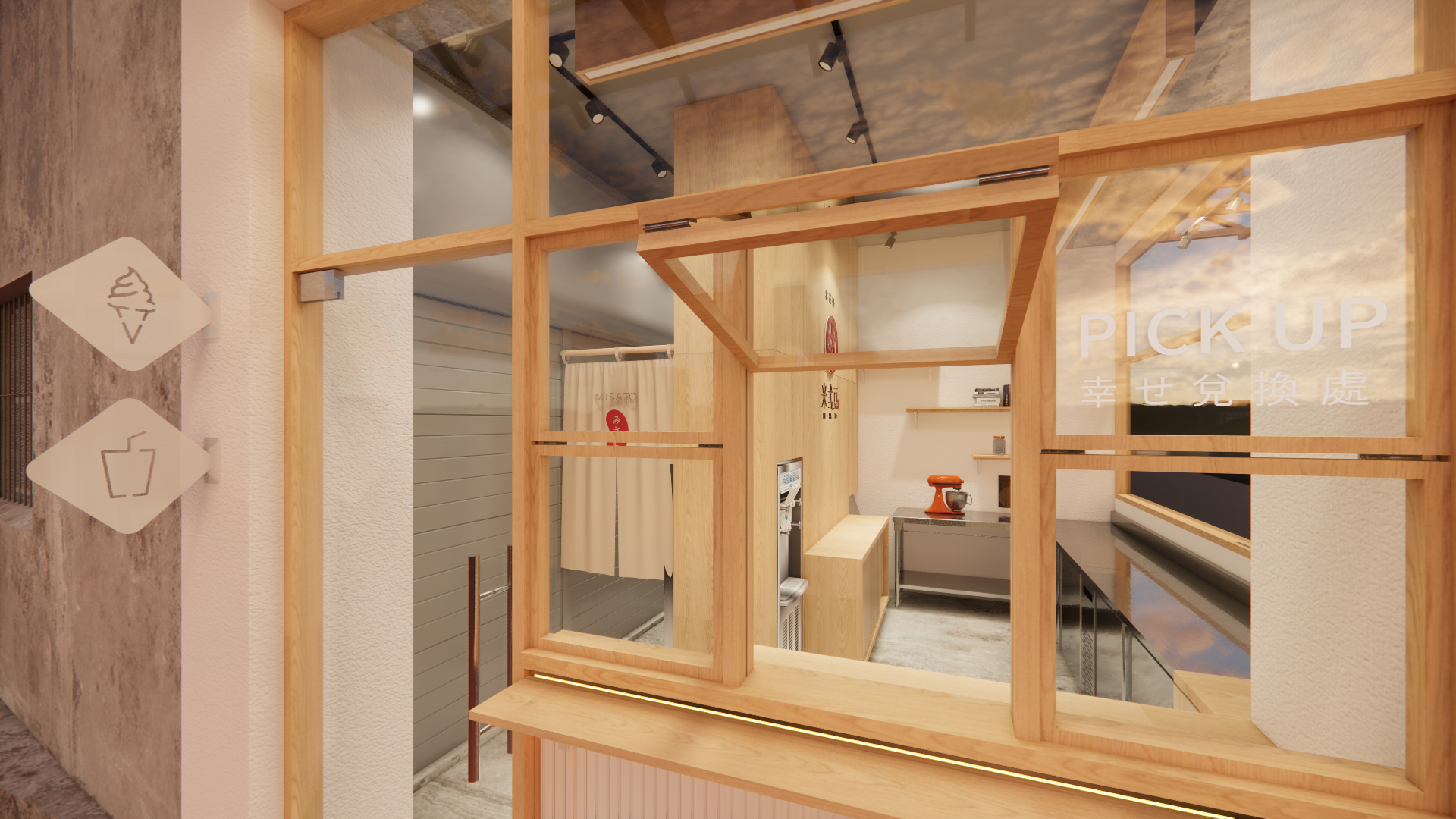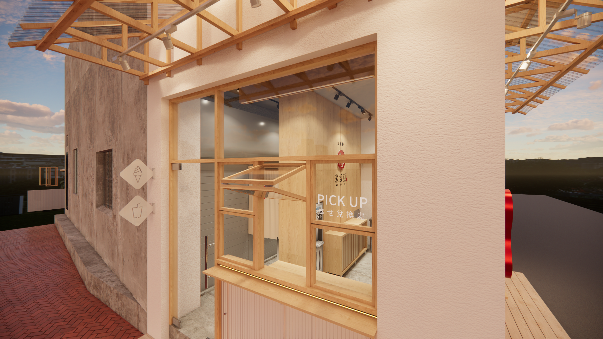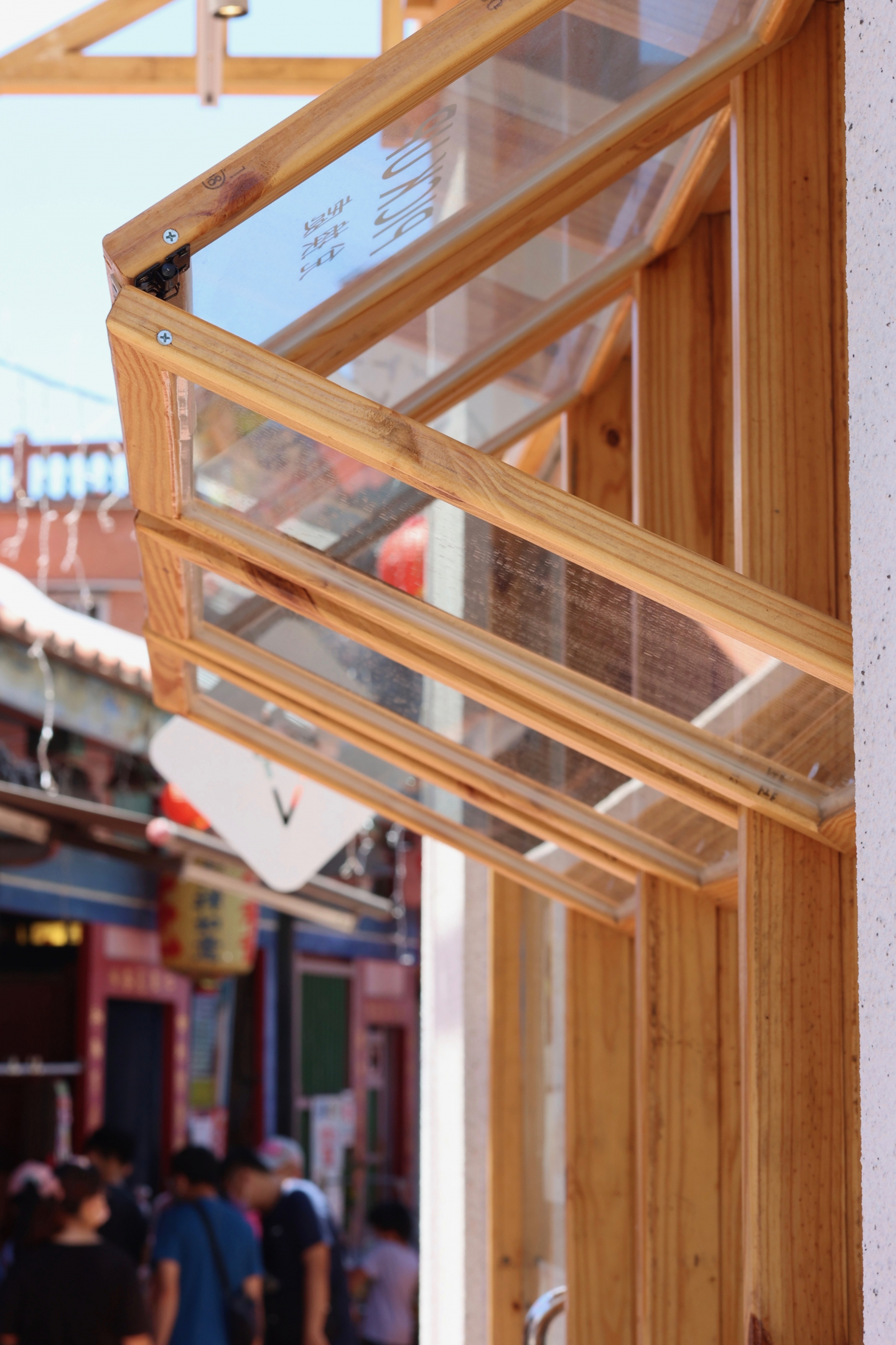 鹿港2号店, 不僅運用了突出的日式屋簷風格,取餐窗口的位置,則選用上懸窗設計,有別於常見的雙向橫拉窗戶,上懸窗不只美觀,還能防止雨水滴入店內,避免餐點淋濕。